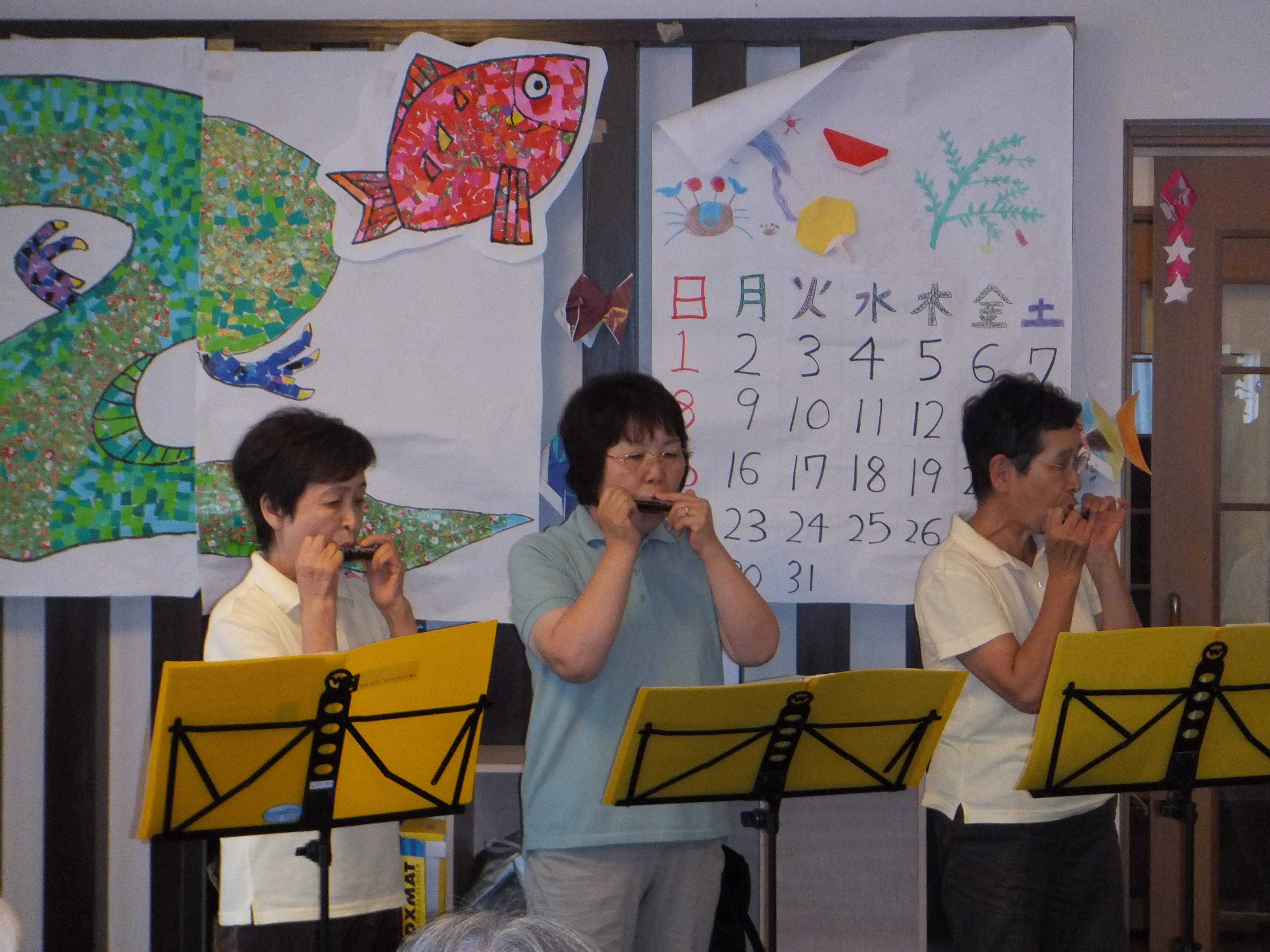 その後も懐かしい曲が続き、体操で体を動かしたりと和気あいあいの雰囲気で、中にはご自分のハーモニカを準備され一緒に演奏をされるご利用者様もおられ、とても楽しい時間になりました。