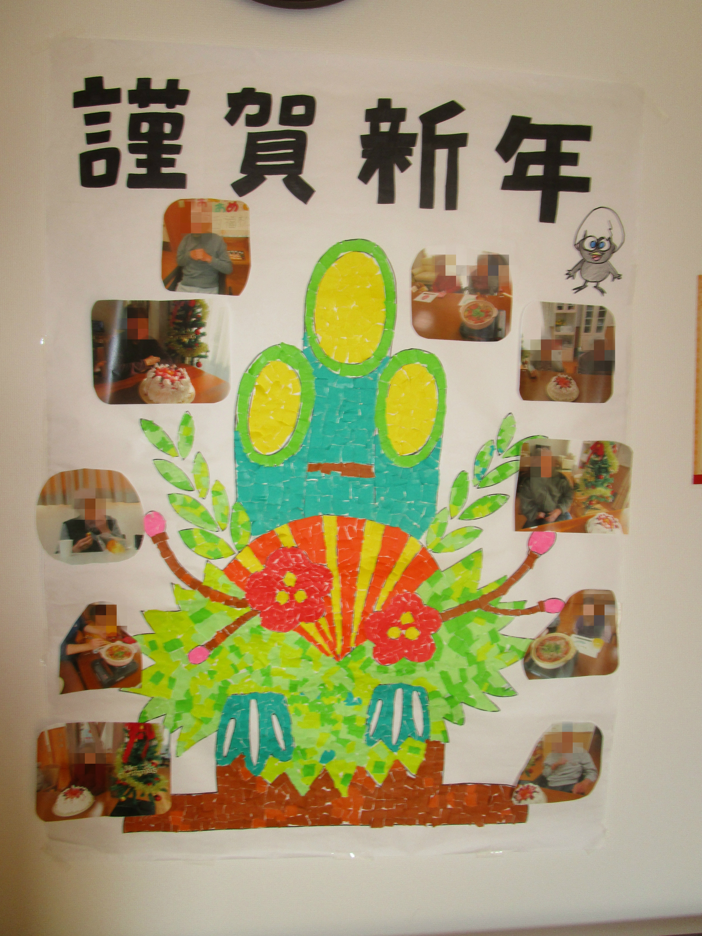 お正月、入居者様と一緒に大きな壁かけを作って飾っています。