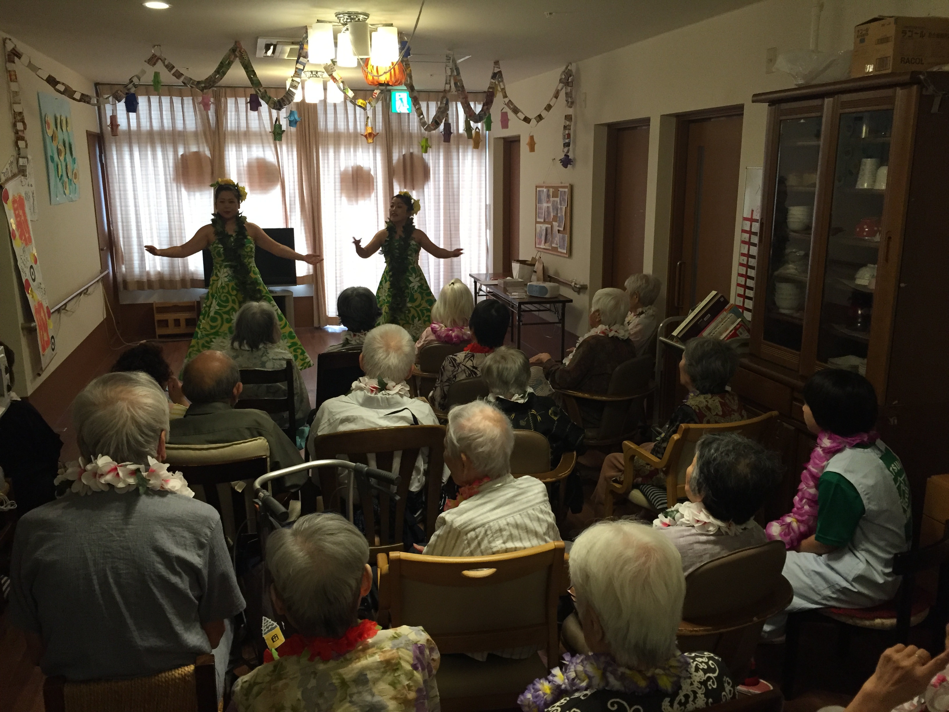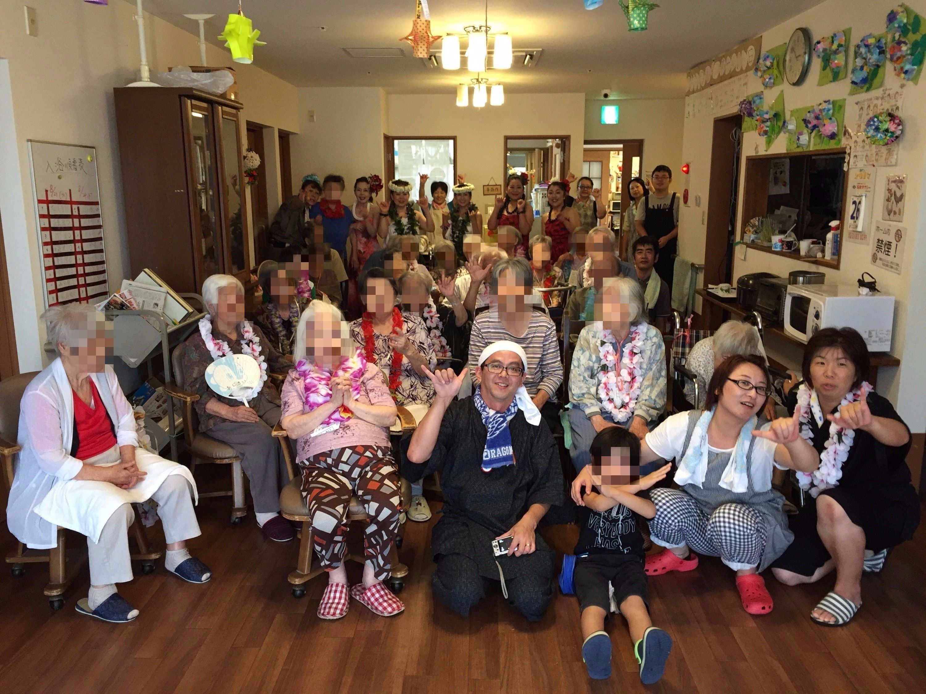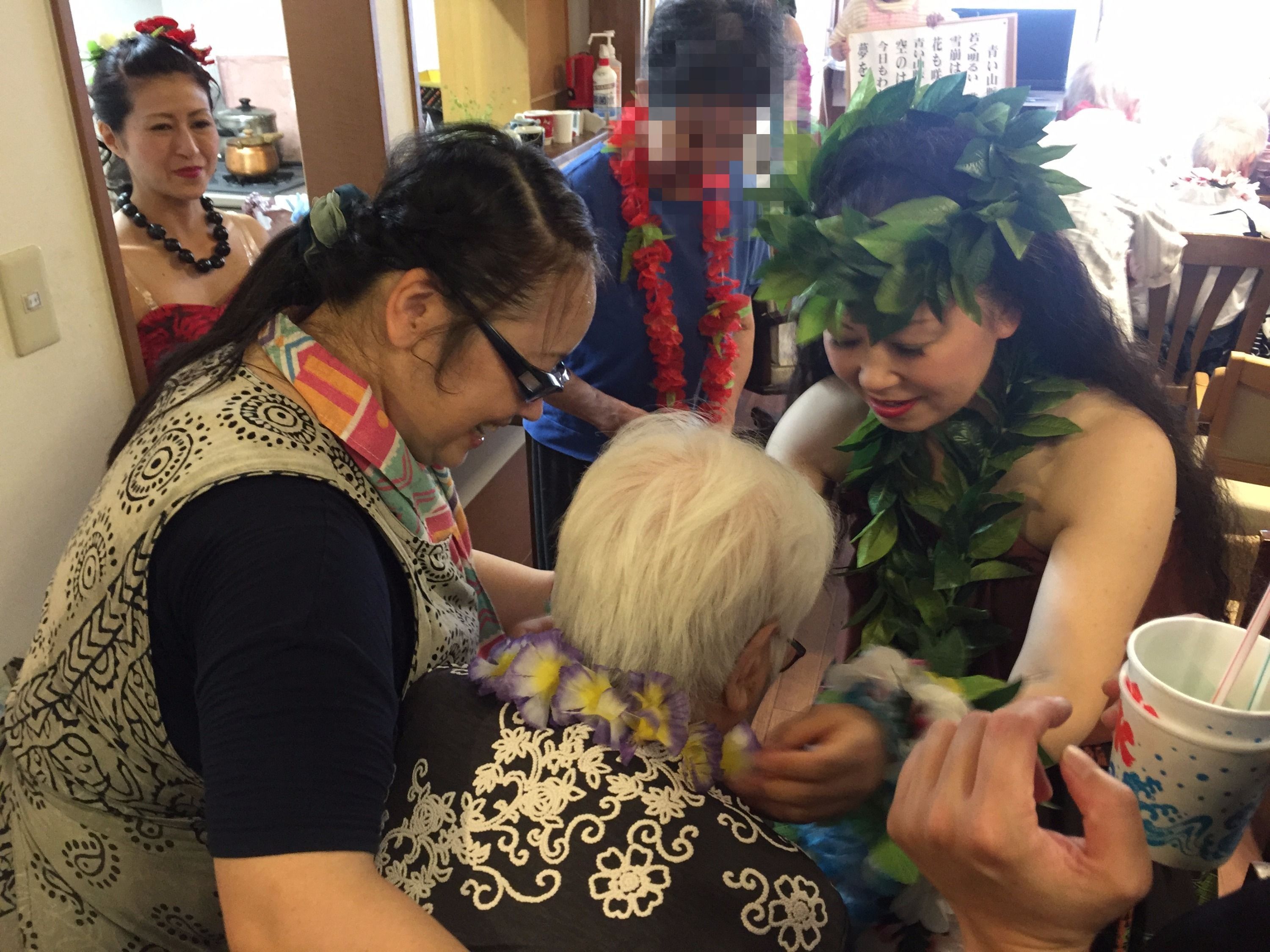 ご利用者様・職員全員にお花の首飾りをかけていただき、気分は常夏のハワイです
