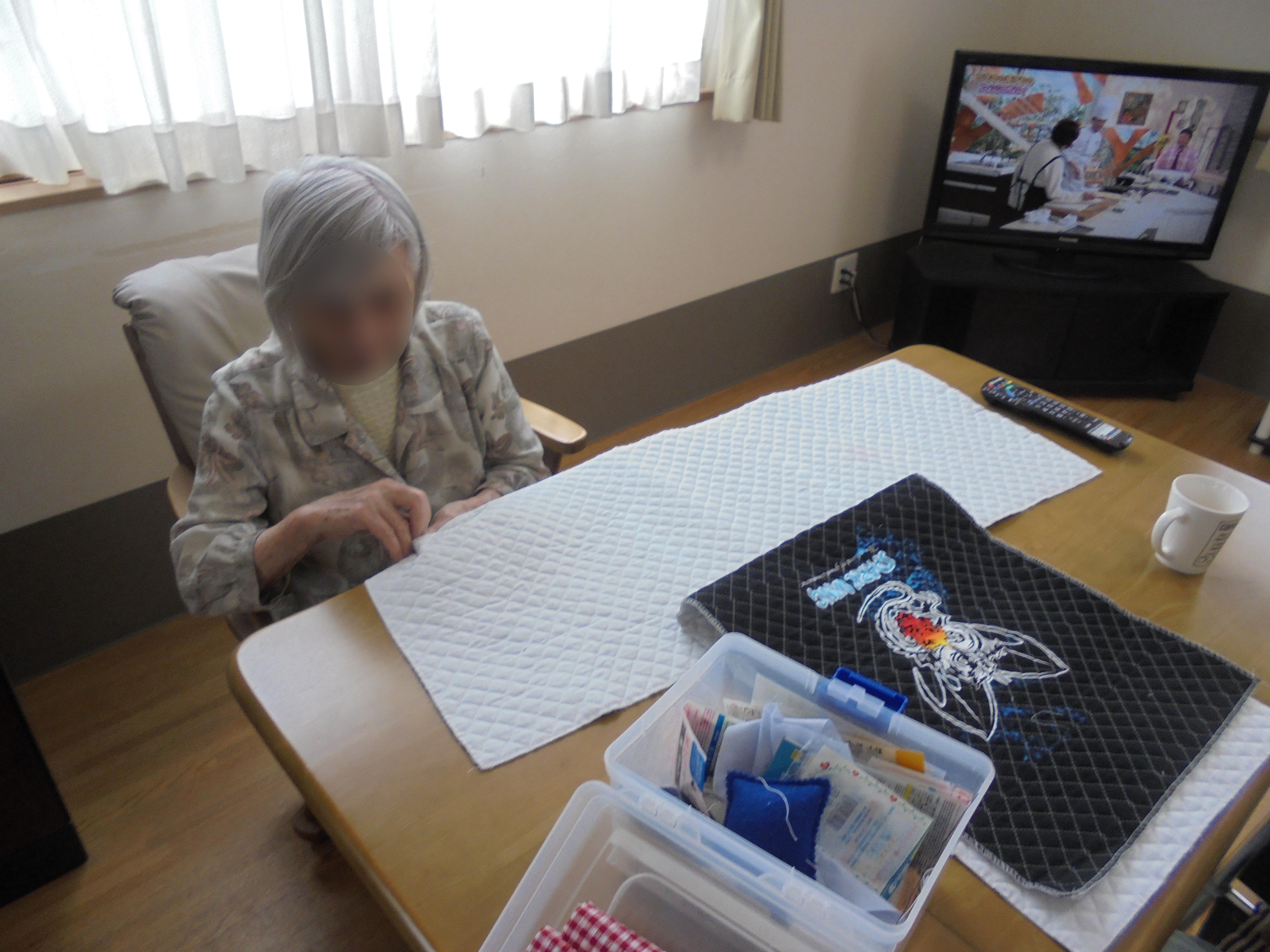 ジョイア永覚で、防災頭巾をご利用者様に作成して頂いています。