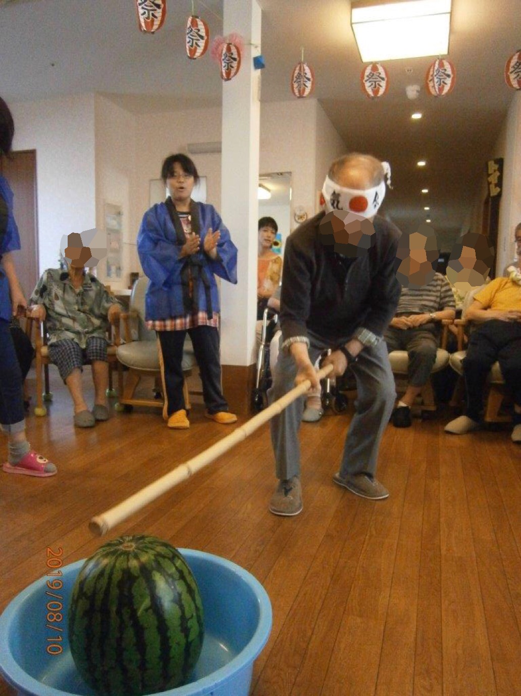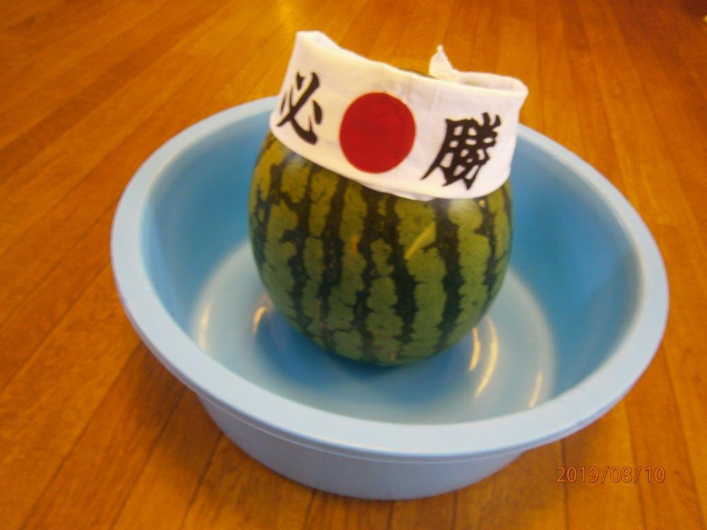 午前中はスイカ割りを行い、昼食はいつもよりちょっと豪華なちらし寿司をお重に