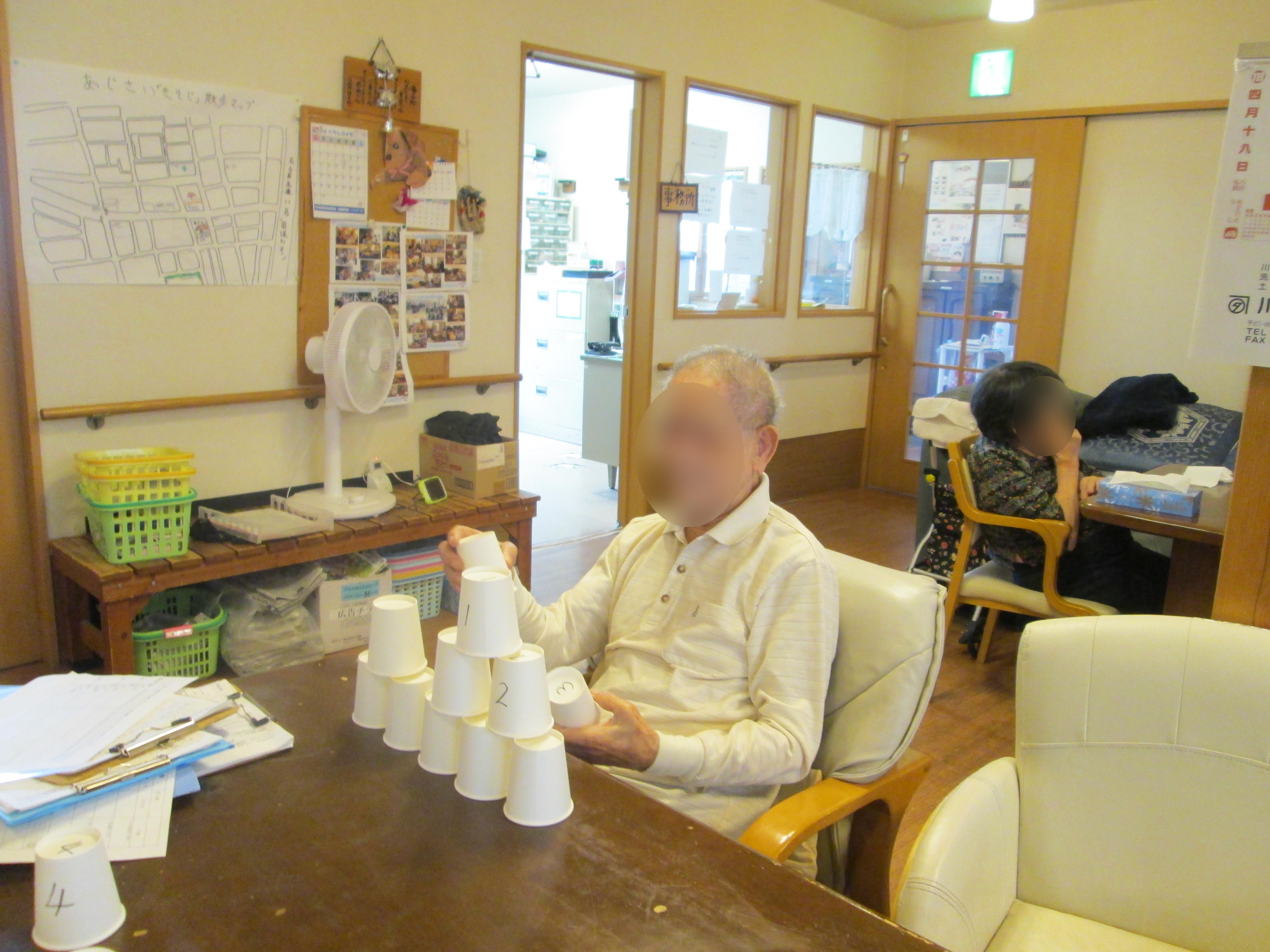 外出できなかったので紙コップを積み立てるゲームをしました♪