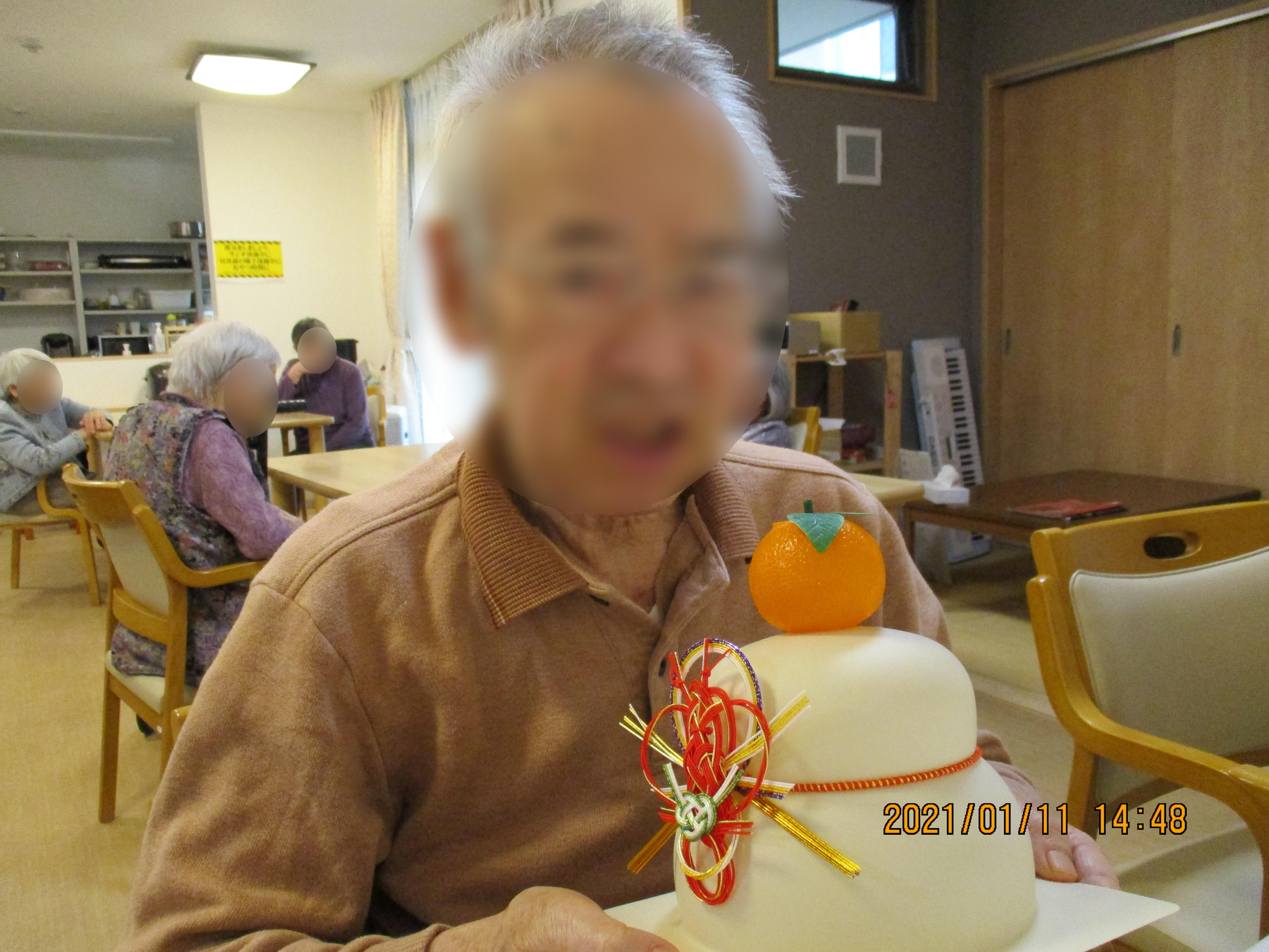 お鏡開きのご様子です。大きな鏡餅を皆さんで割って頂き、白玉団子入りのぜんざいを