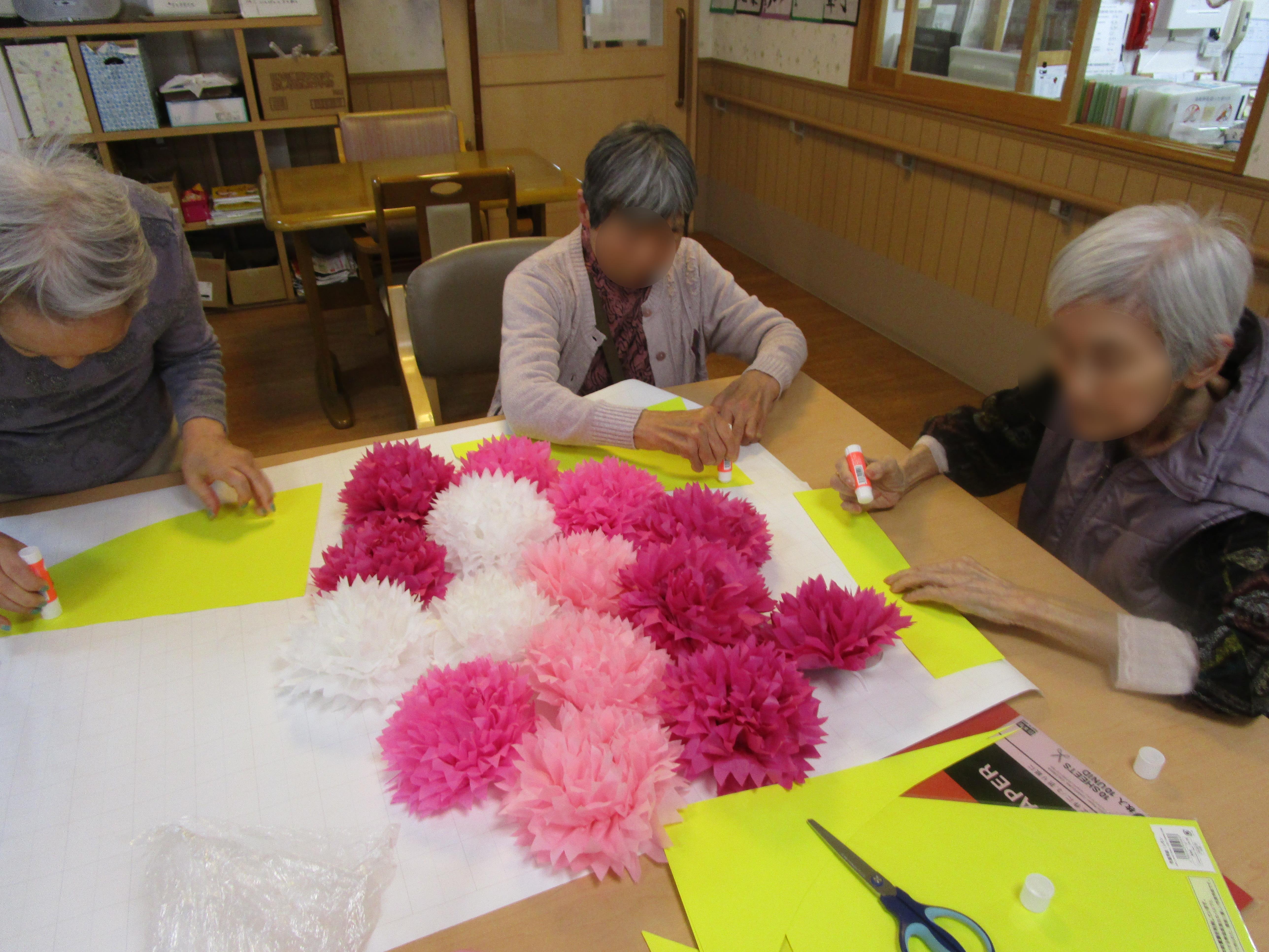 ご利用者様と大きなカーネーションの花束作りを行いました。完成すると『綺麗だね~』とお話されていました