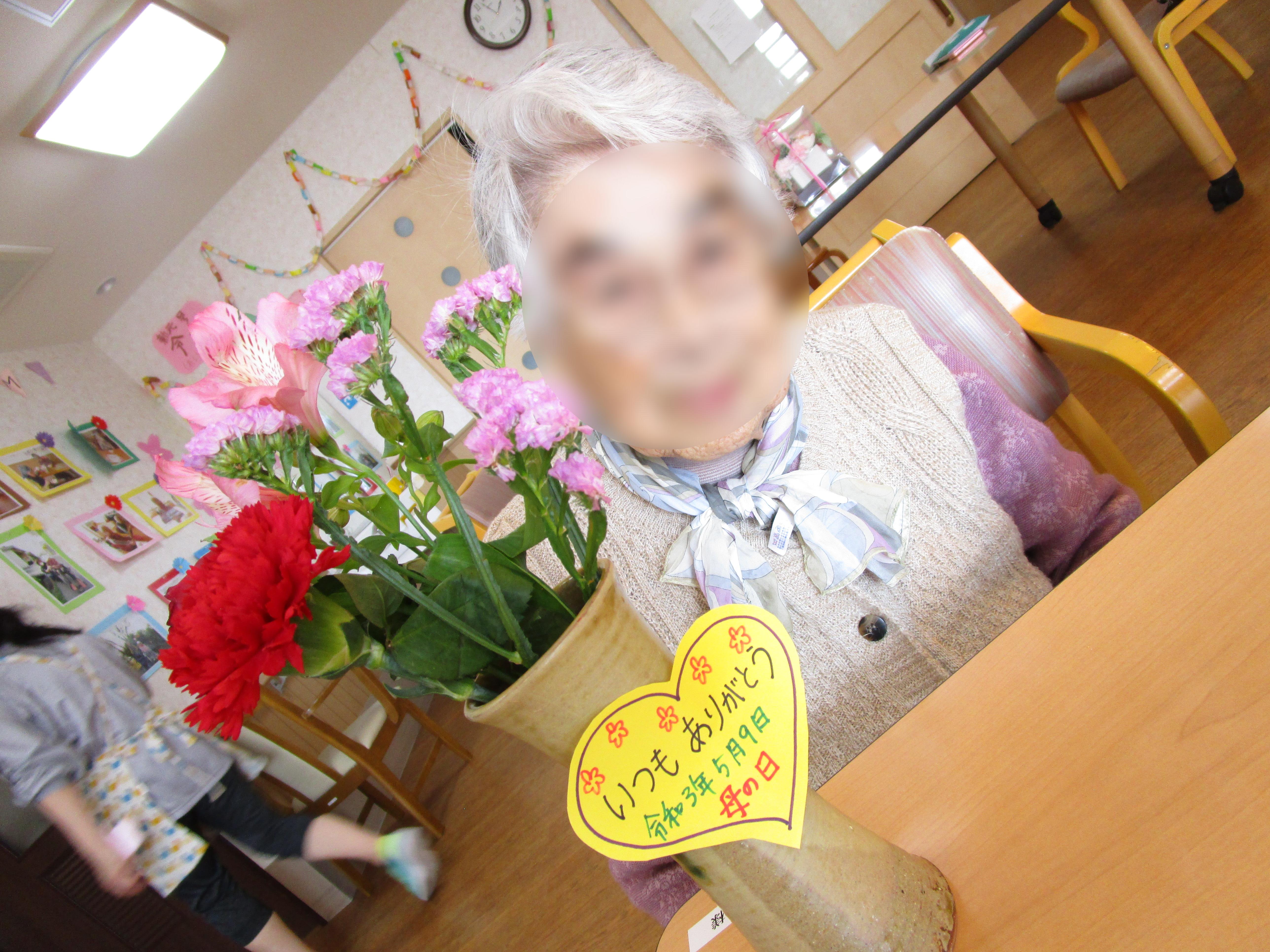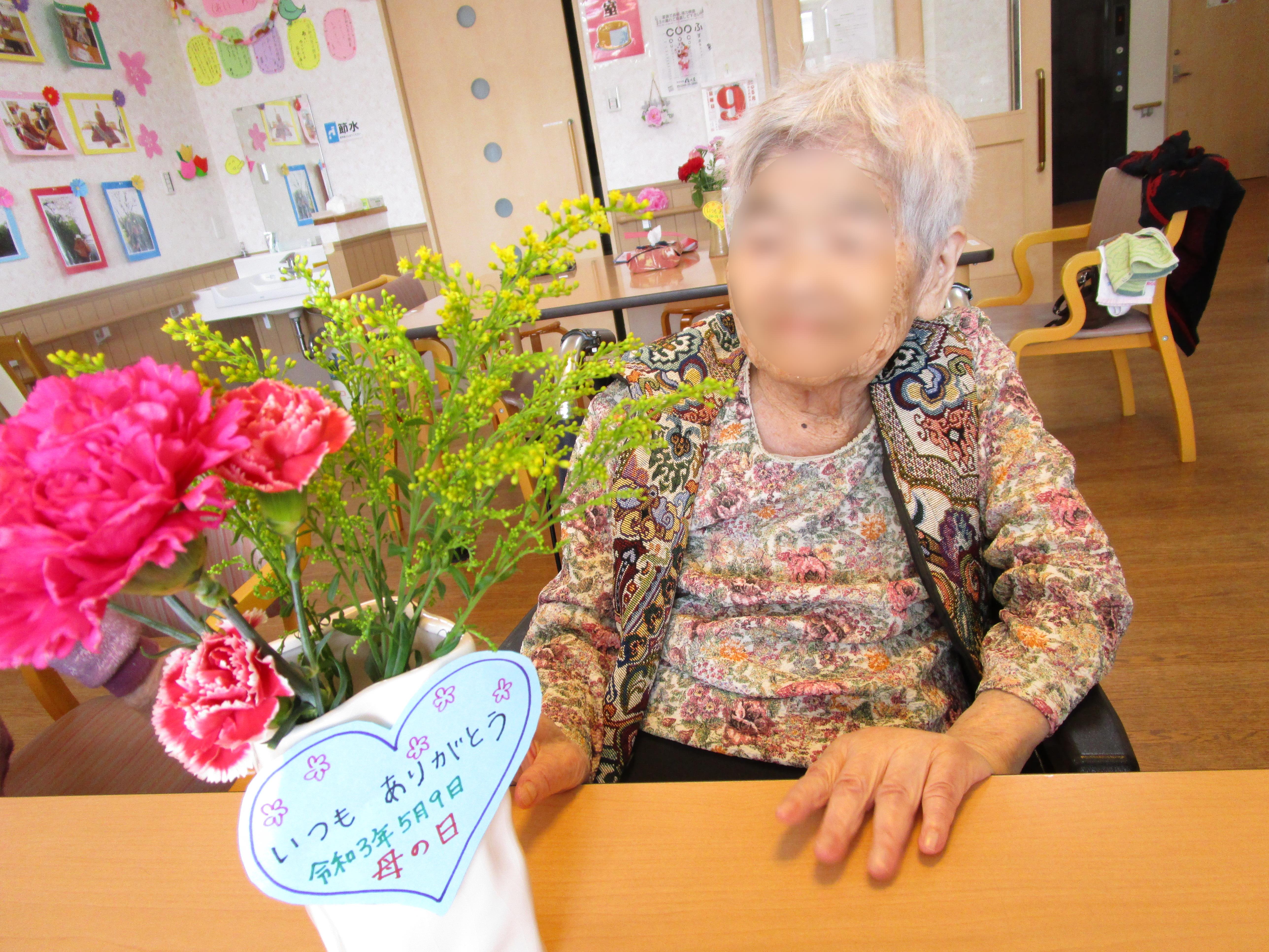 母の日に日頃の感謝を込めて職員からカーネーションとメッセージカードをプレゼントいたしました。『ありがとう』と喜んでいただけました。