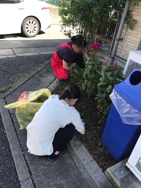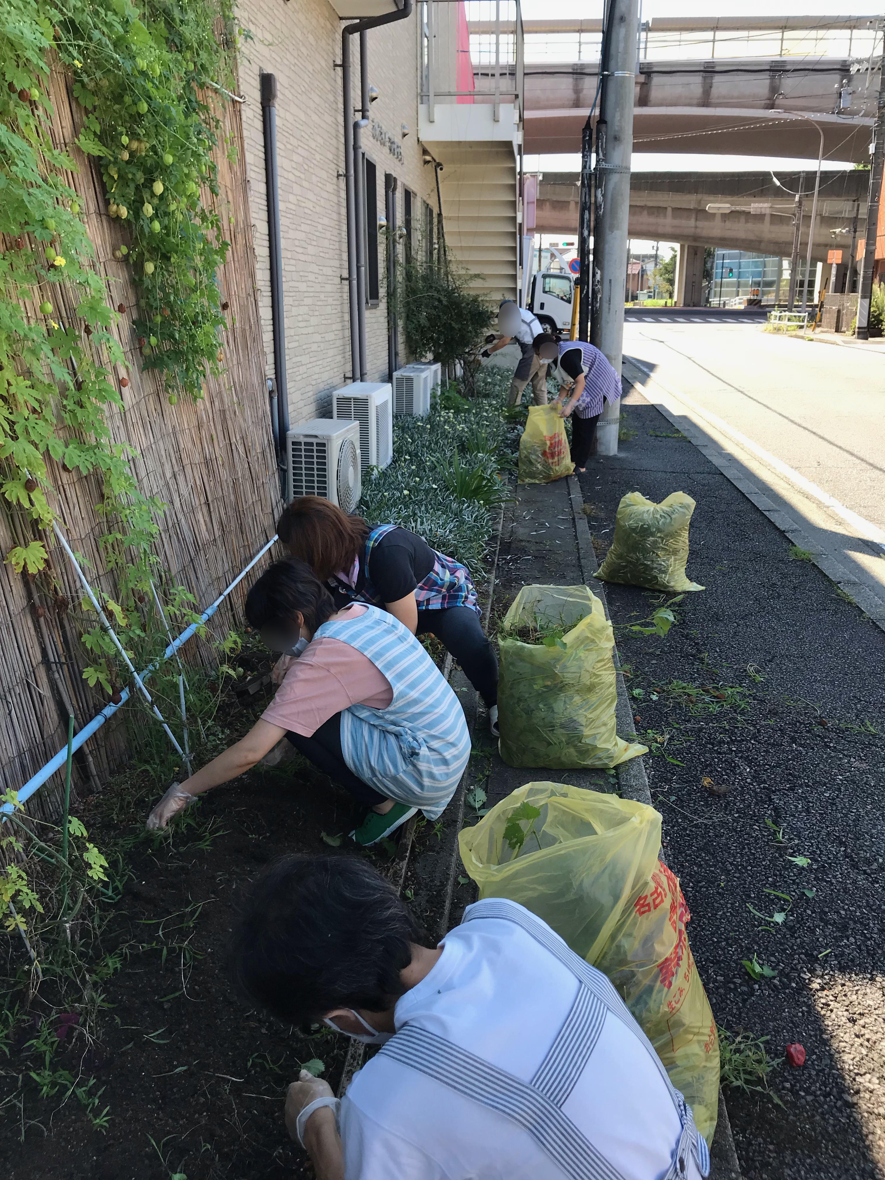 施設の周りが草が生い茂っていましたので、朝礼時スタッフ全員で