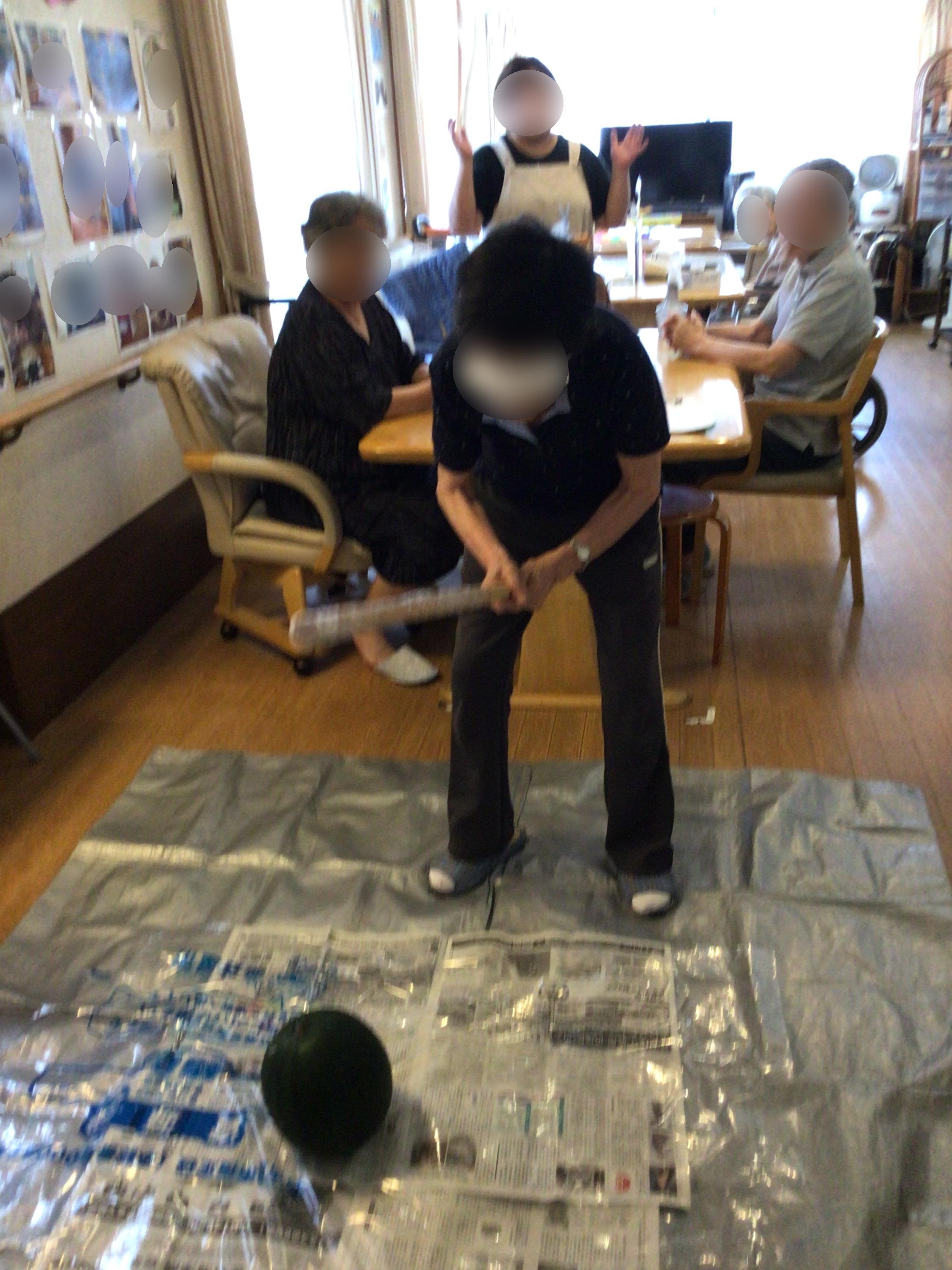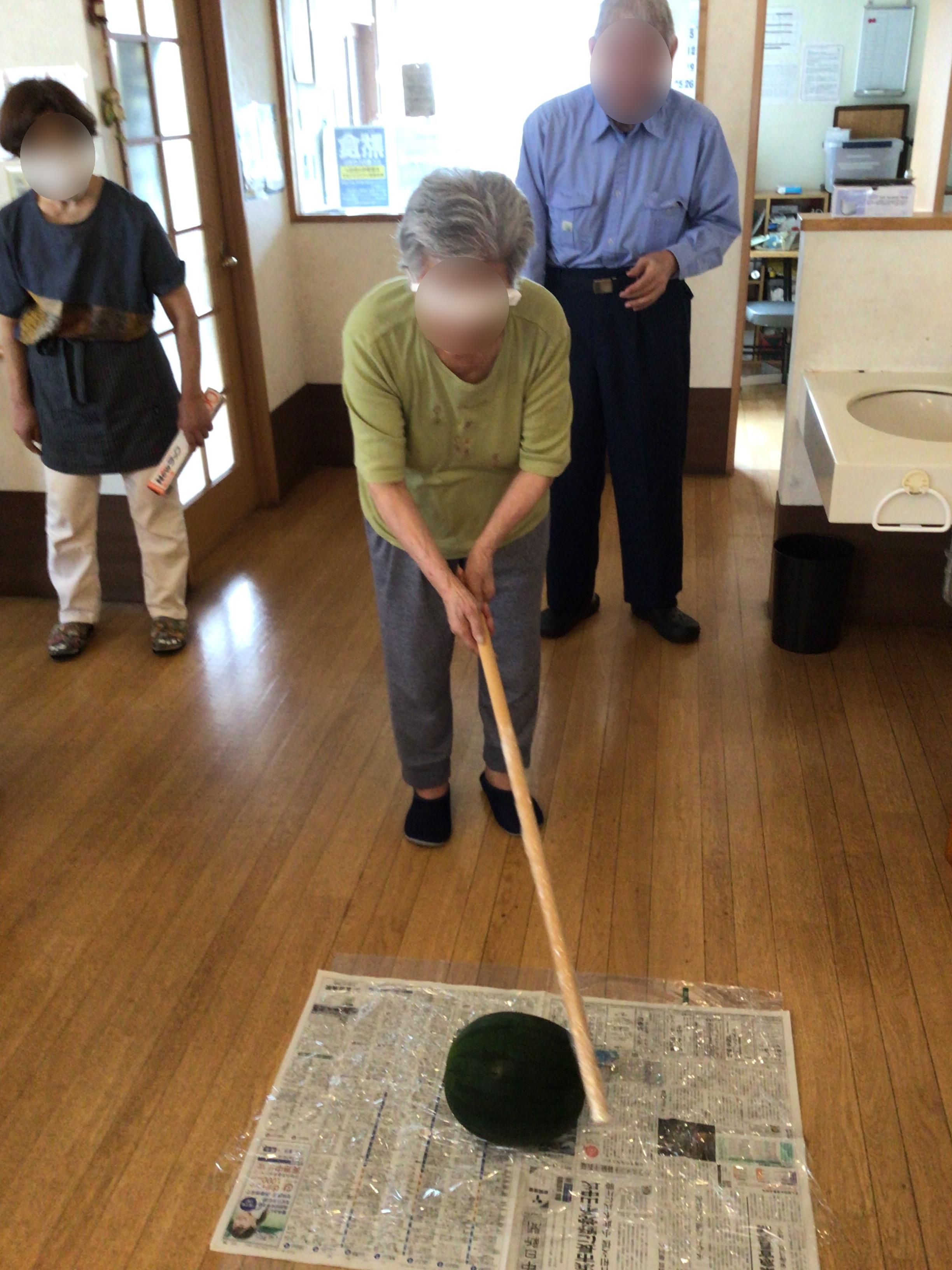 掛け声をかけながら皆様で協力してスイカを割って頂きました
