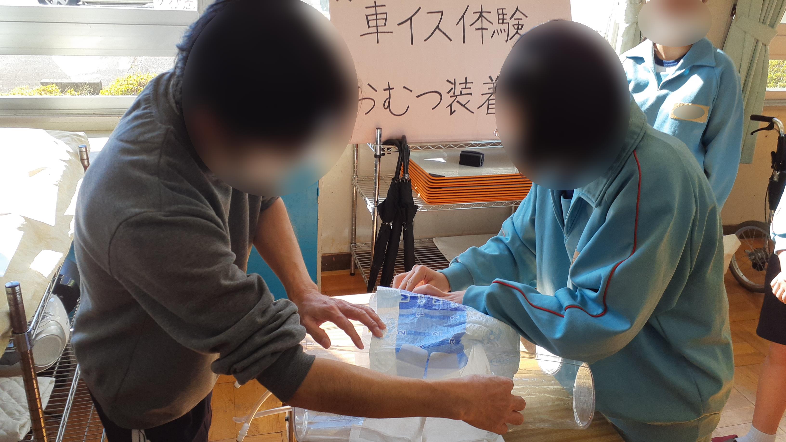 介護を身近に感じて頂けるようにリフト車体験、とろみ体験、おむつ・福祉用具体験の3コーナーを用意し体験をしてもらいました