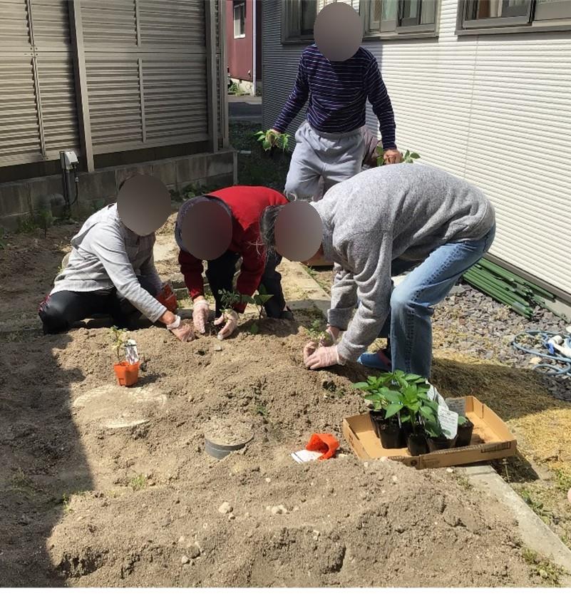 施設内の畑にご利用者様と野菜の苗を植えました