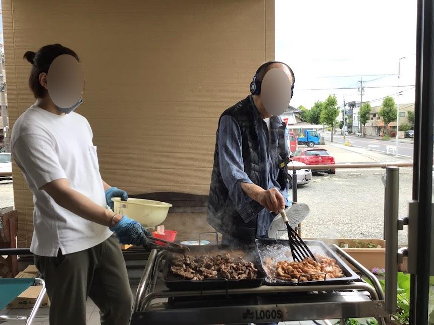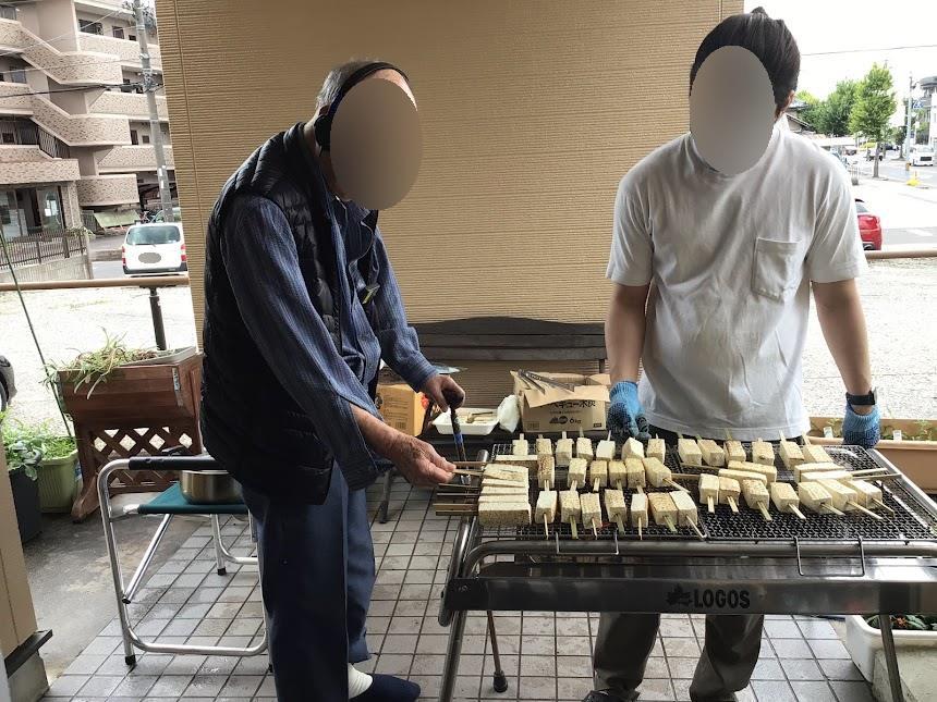 職員が外で田楽を焼いていると、男性ご利用者様は興味津々で