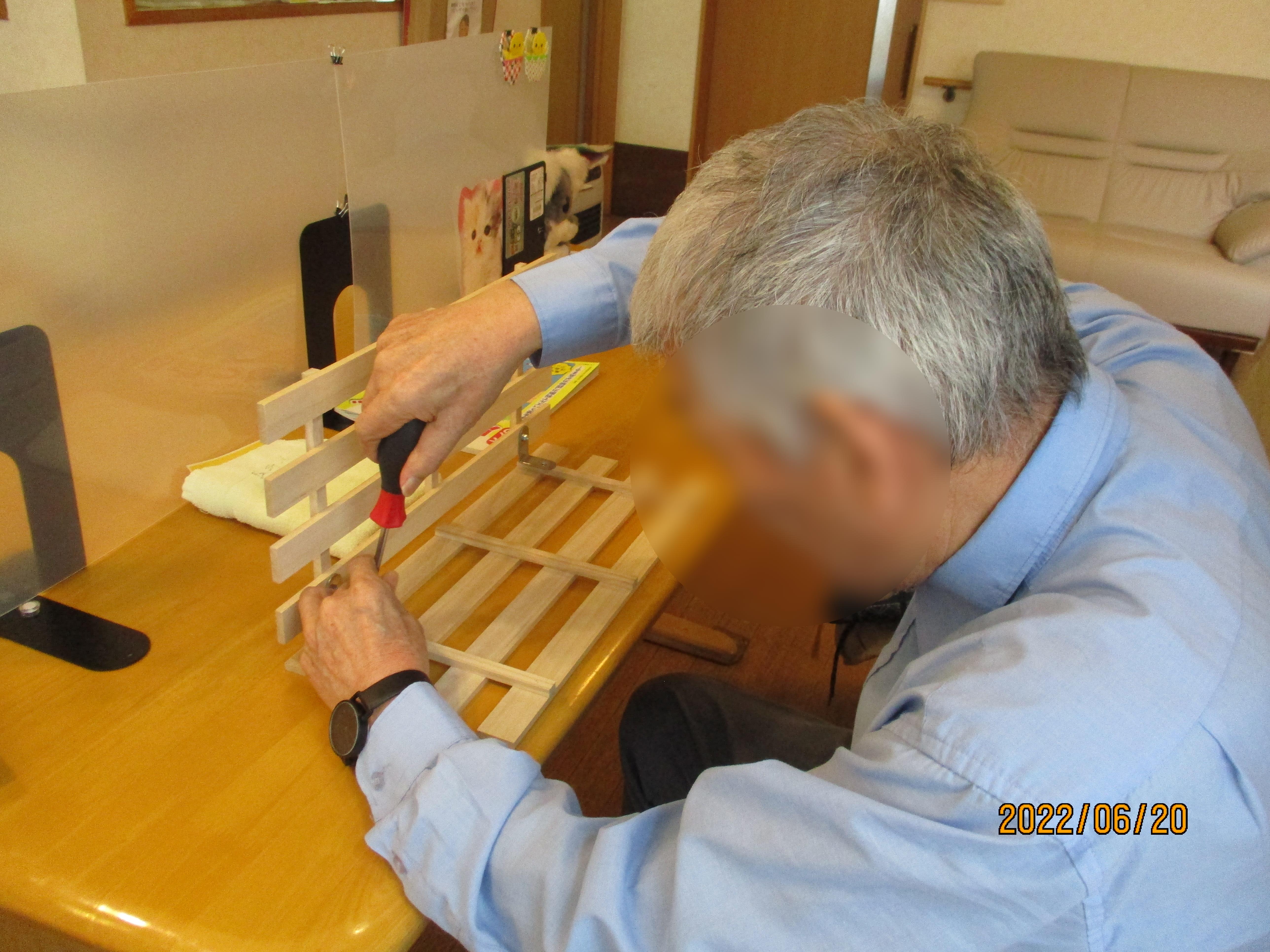 すのこを金具とねじで下駄箱の形に組み立てます。