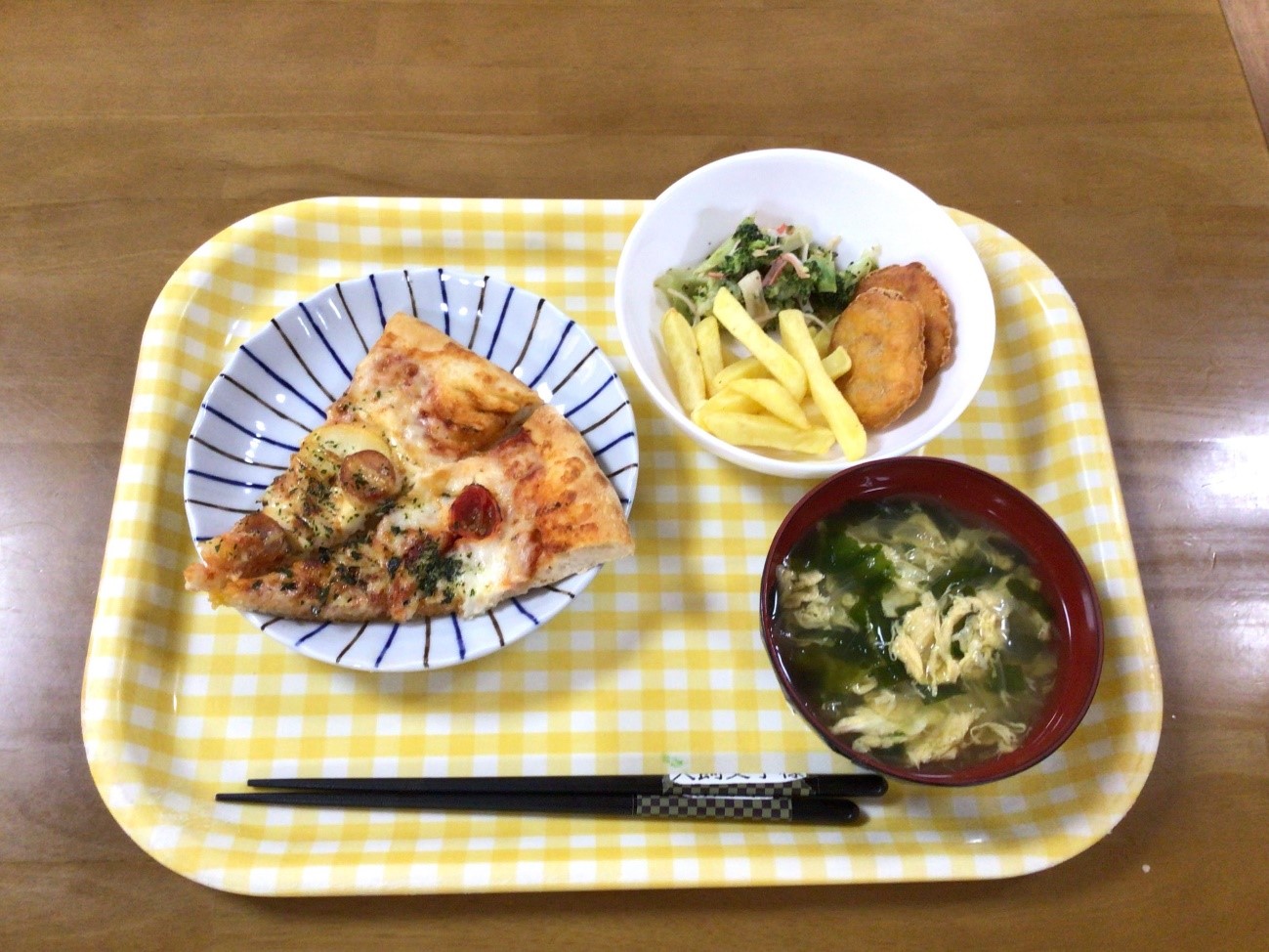 本日はお店でオーダーしたピザ、職員が用意したフライドポテトにナゲット、サラダとスープを召し上がっていただきました