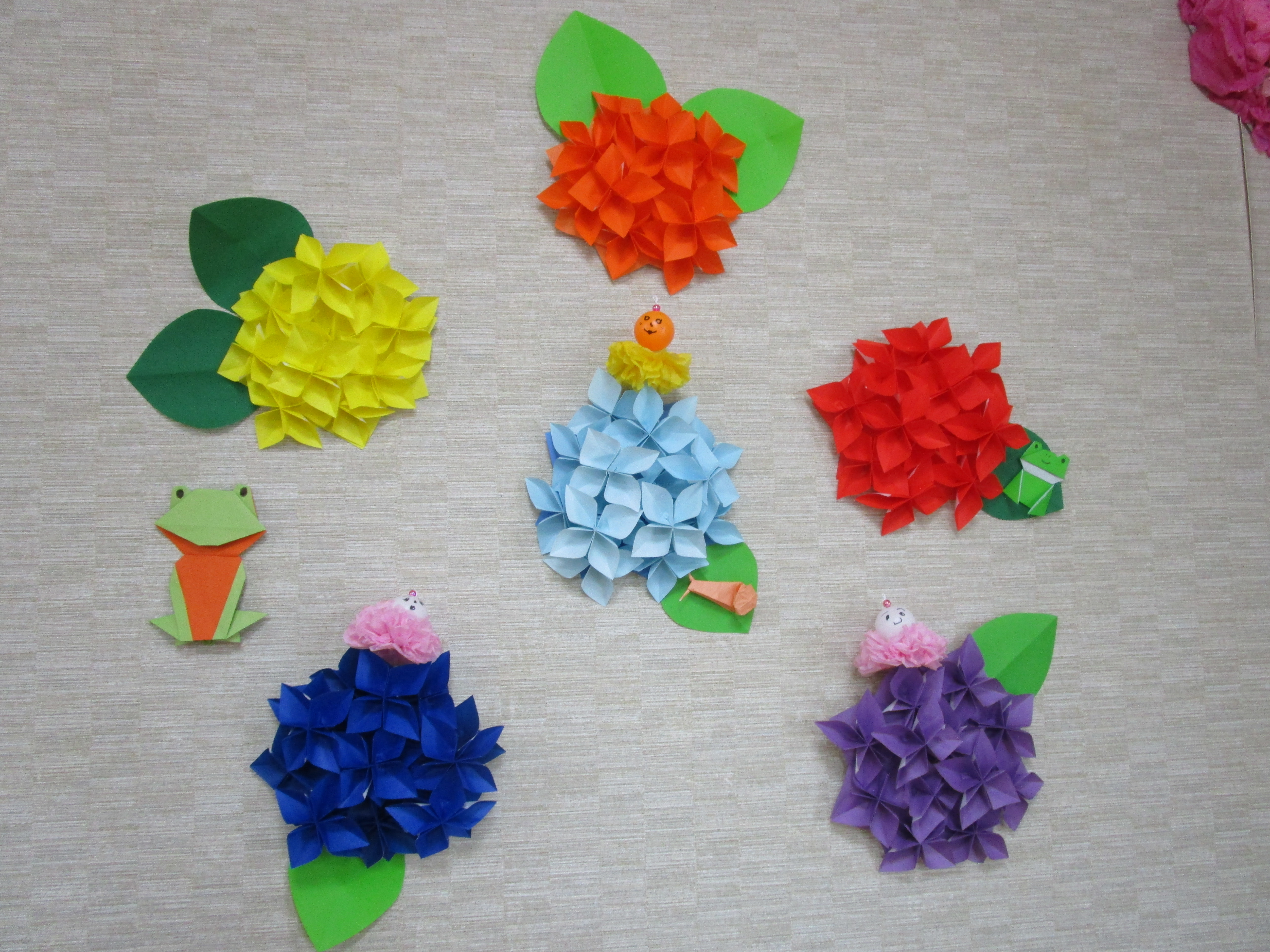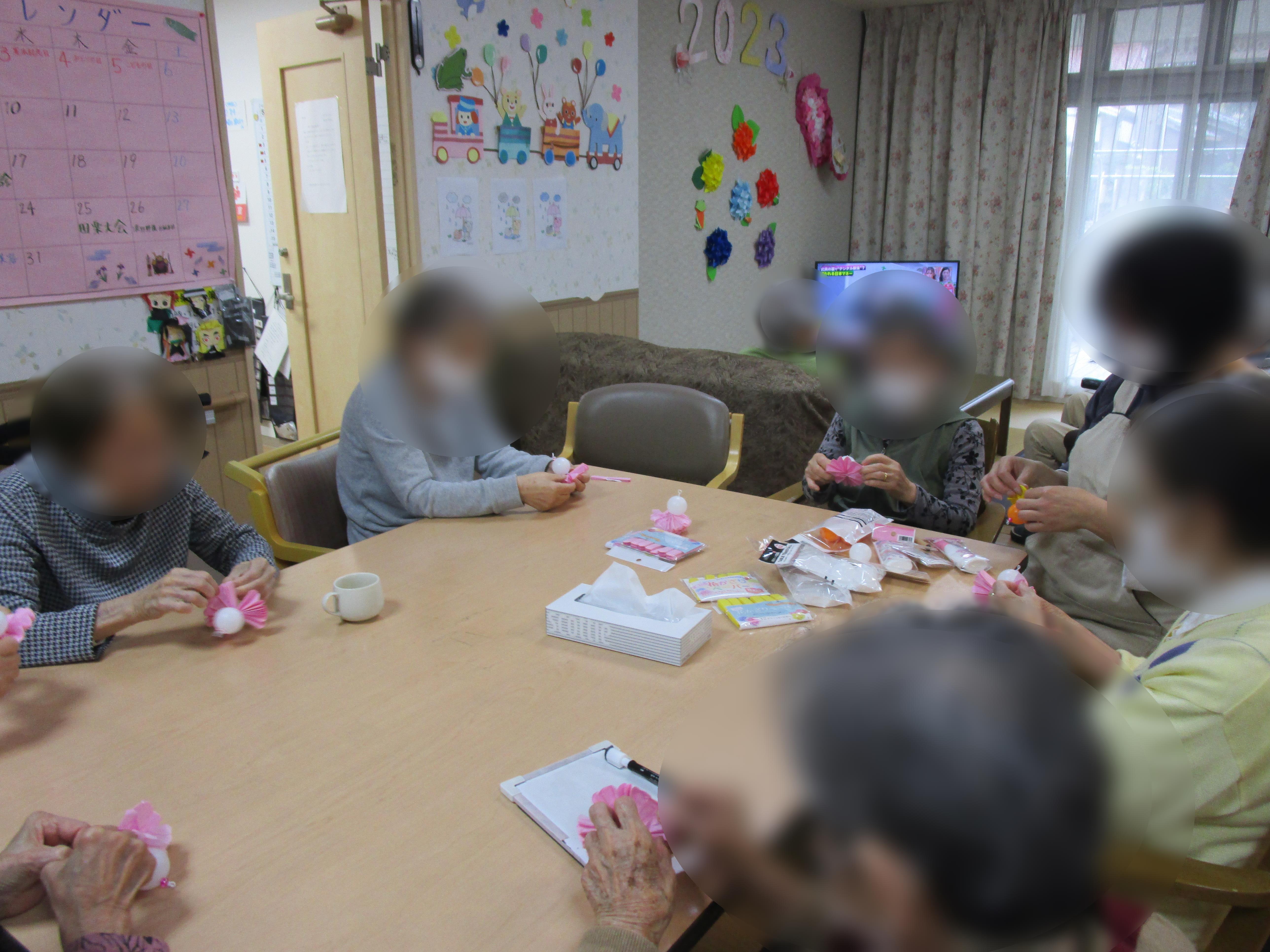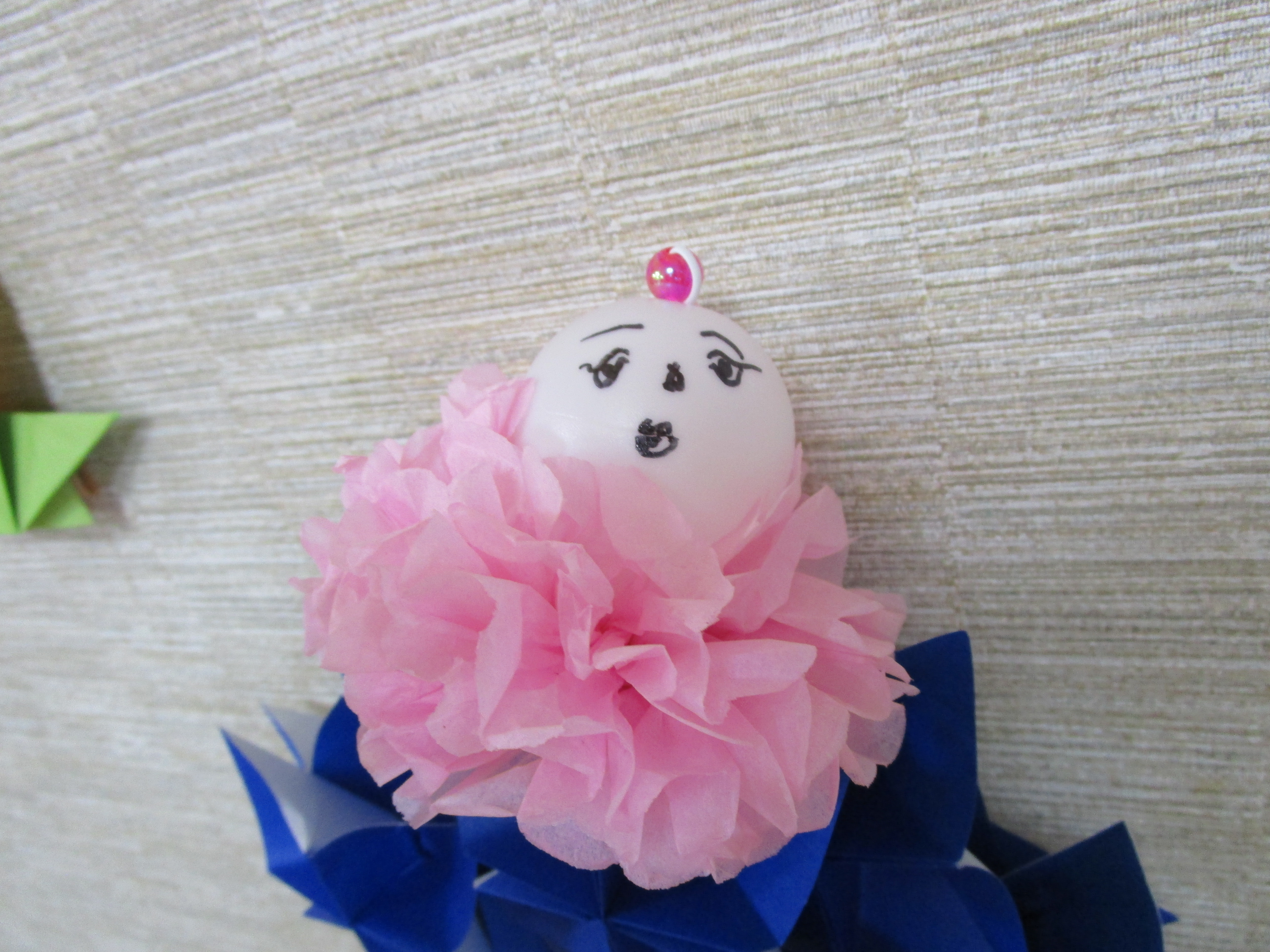 ペーパーフラワーに顔を描いたピンポン玉をくっつけます