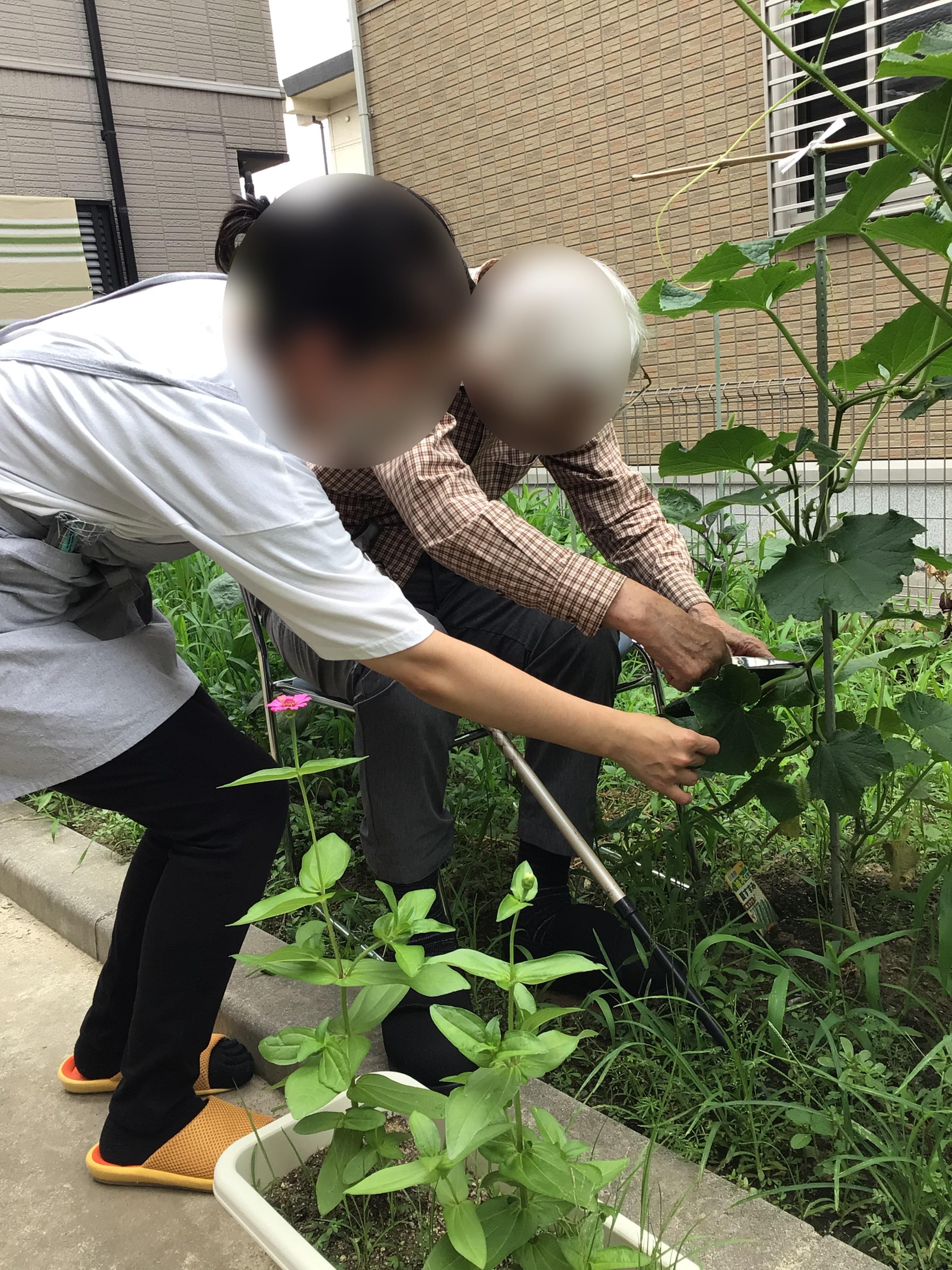 昔から家庭菜園がご趣味のご利用者様ときゅうりの収穫をさせて頂きました
