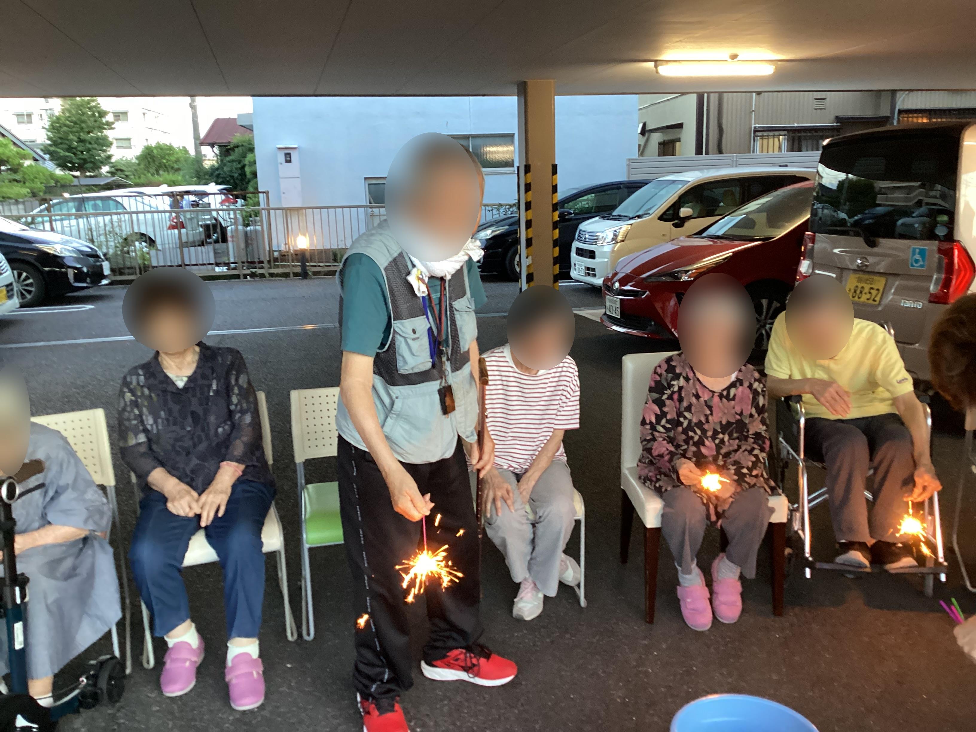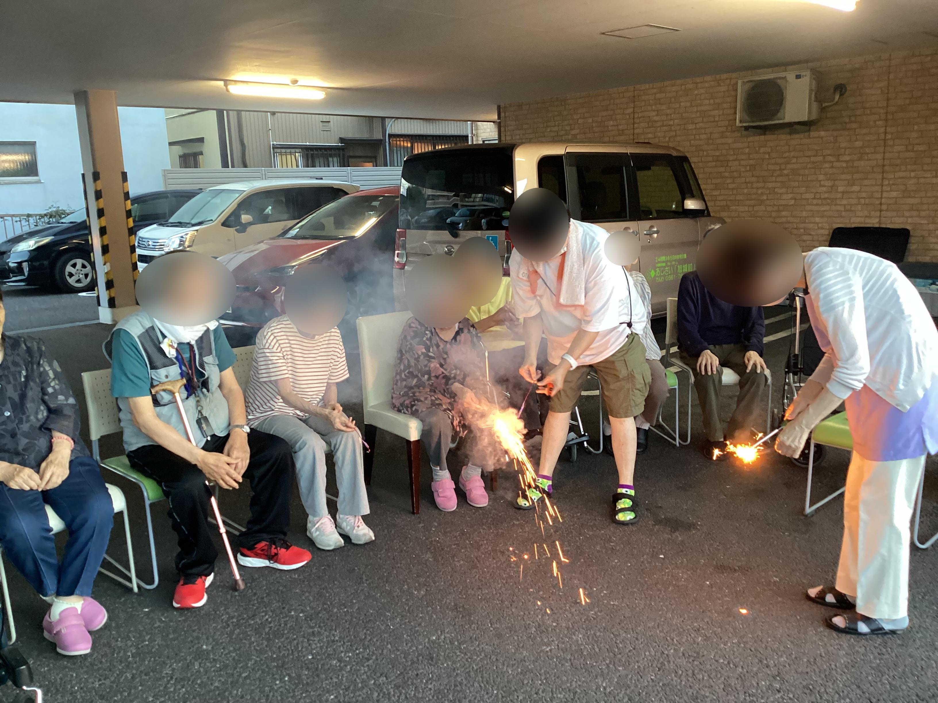 旭城前にて夕食後に涼みながら花火を楽しんでいただきました