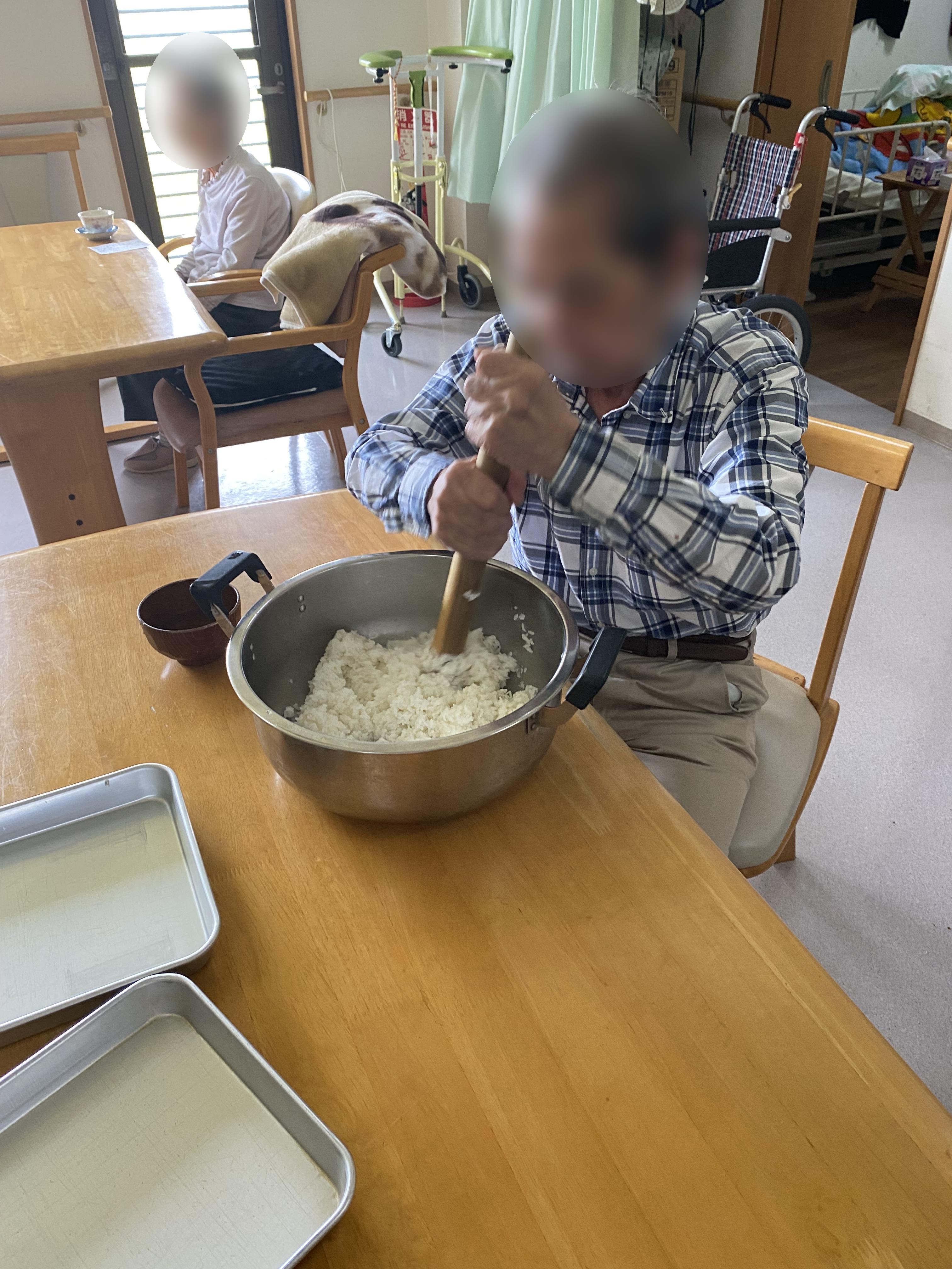 「(ご飯は)どれくらい潰せばいいかな?」「まあ、こんなもんだろ?」「きな粉、私、かけますよ。お手伝いします。」と、皆様で協力して作られました。