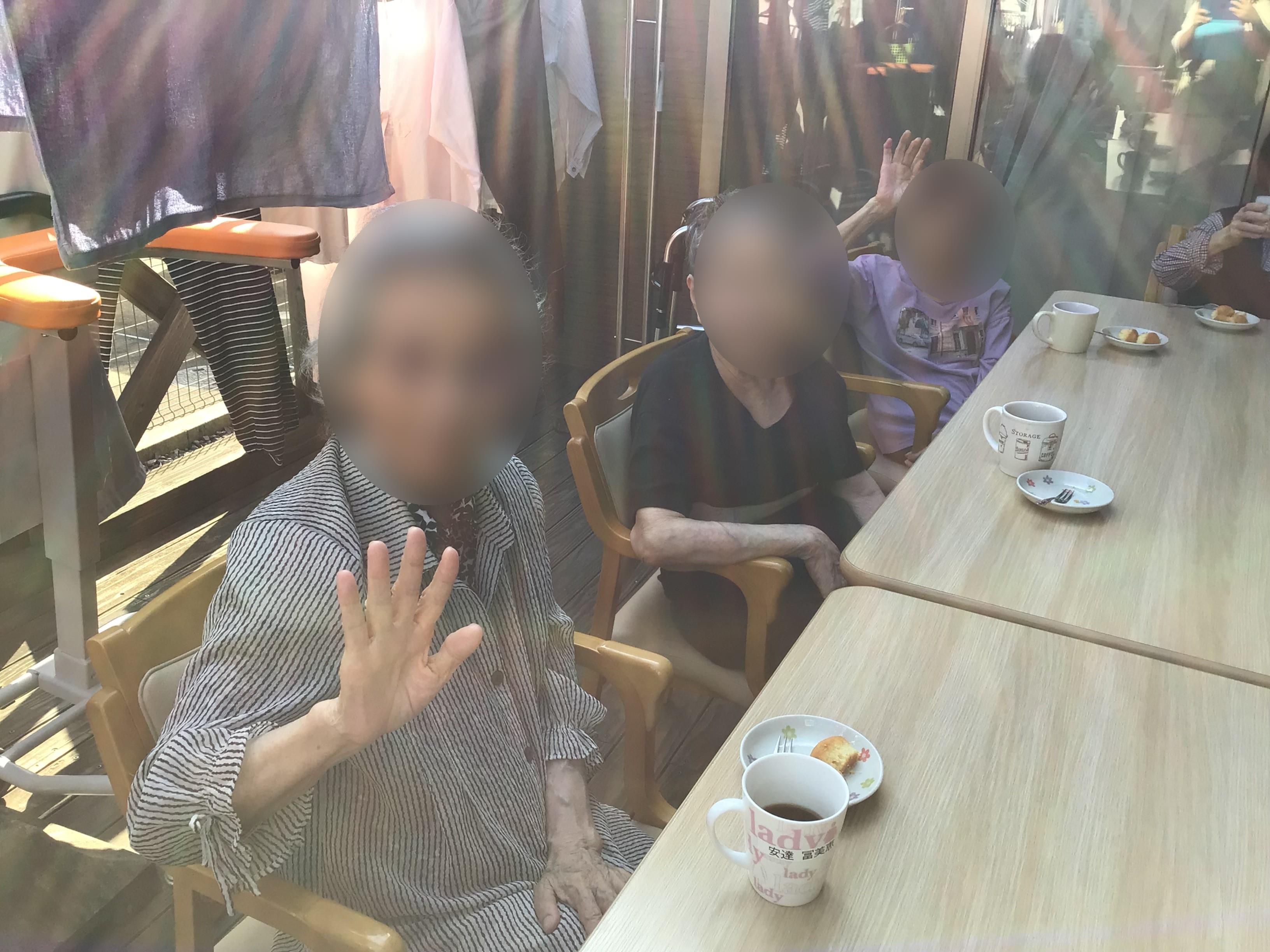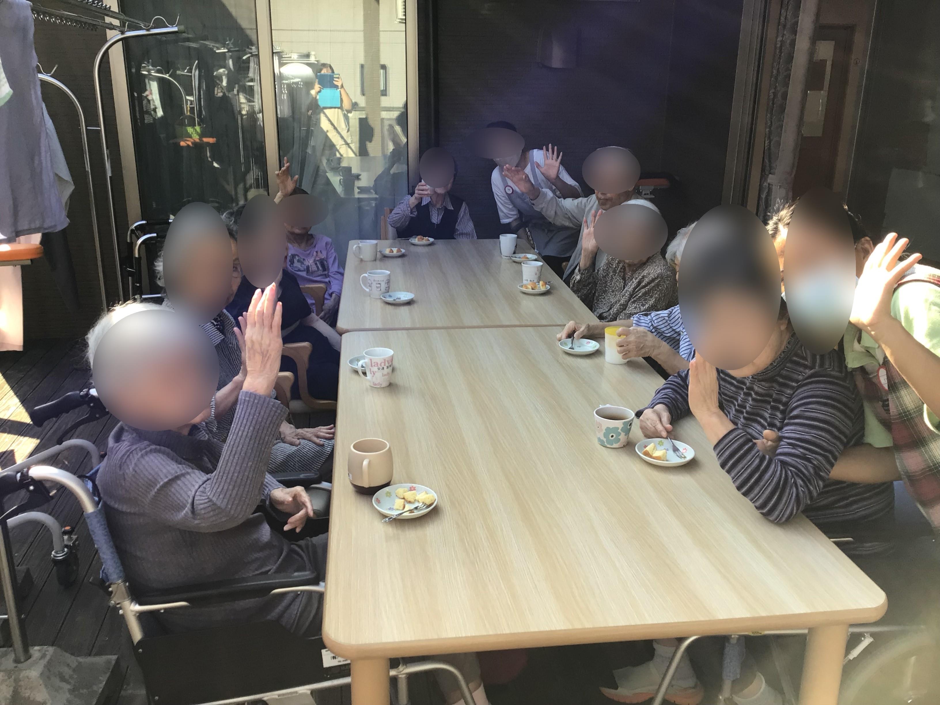 本日は、風が心地よいのでお外でおやつタイムです