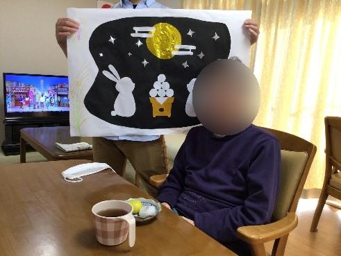 お月見まんじゅうを食べて、お月見の壁面飾りを背に記念撮影をしました
