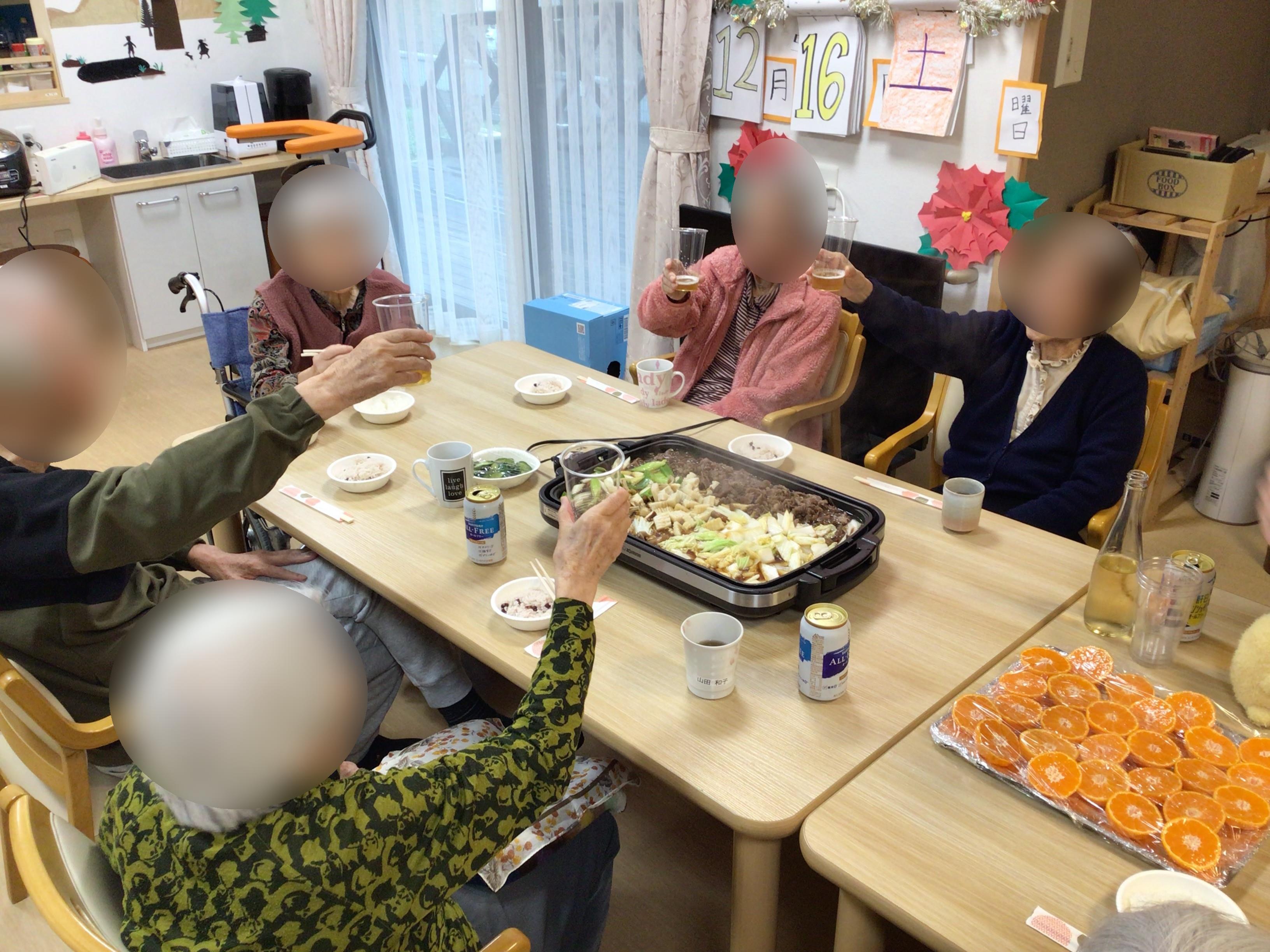 お昼は、すき焼きを囲んで乾杯です