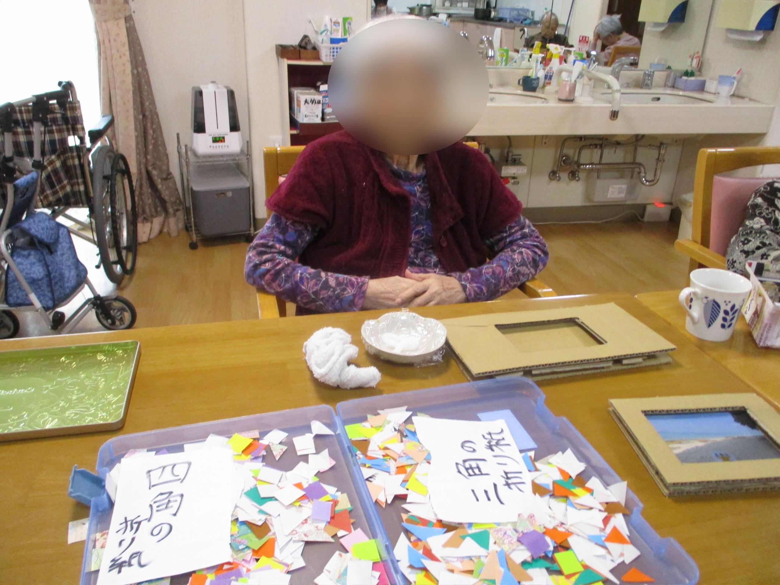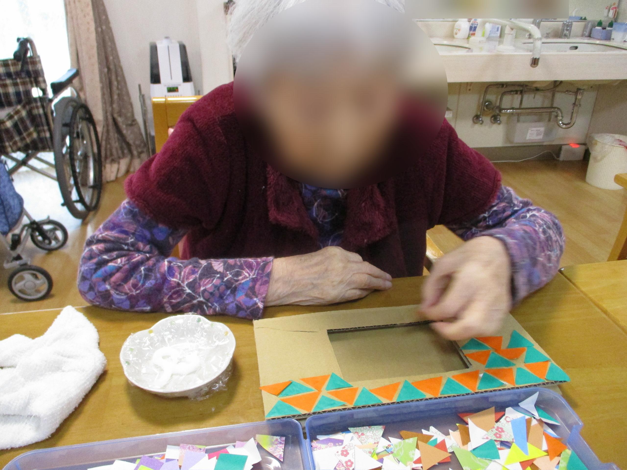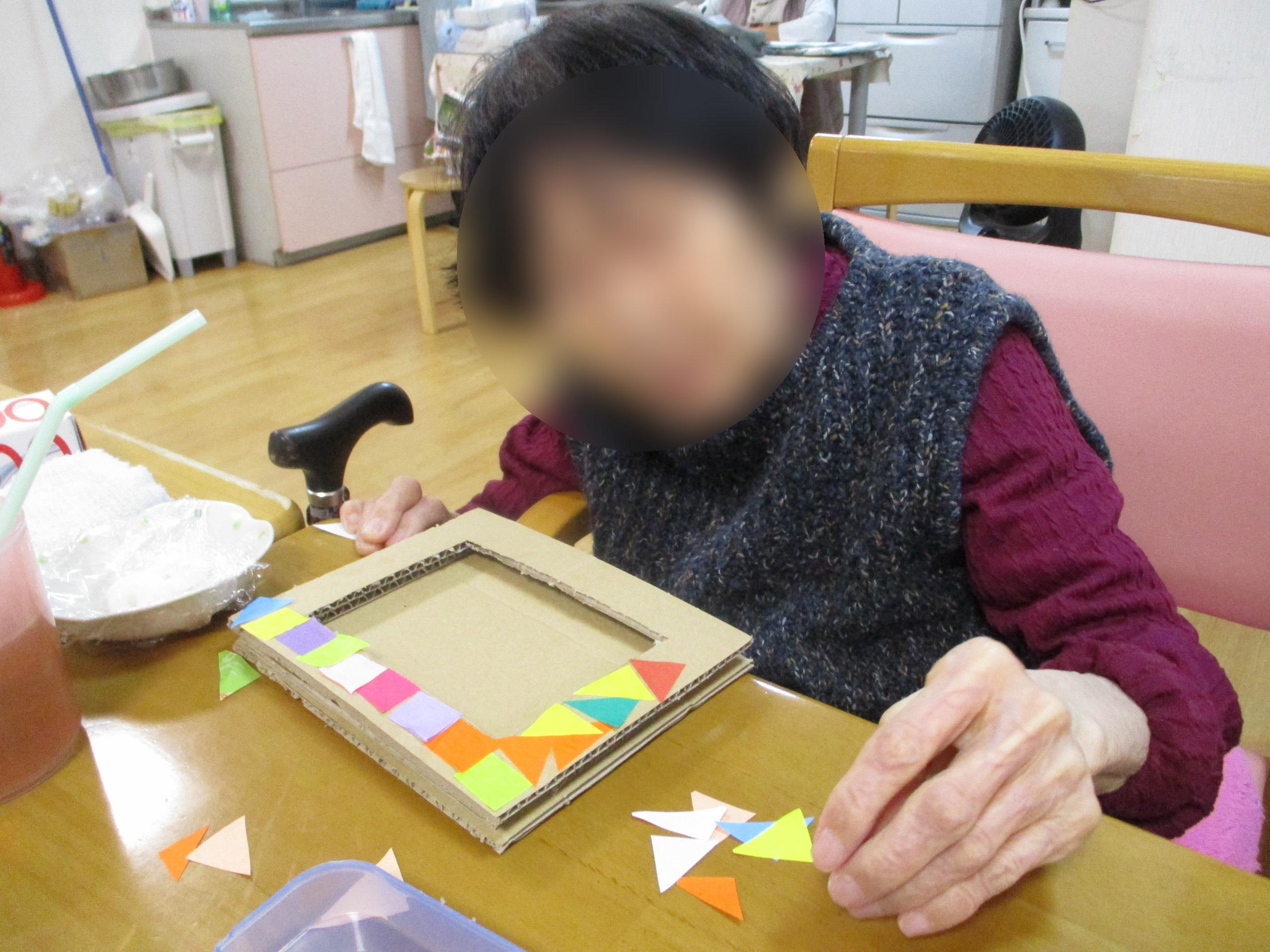 三角と四角の紙を貼り付けてフォトフレームの飾りを仕上げていきます