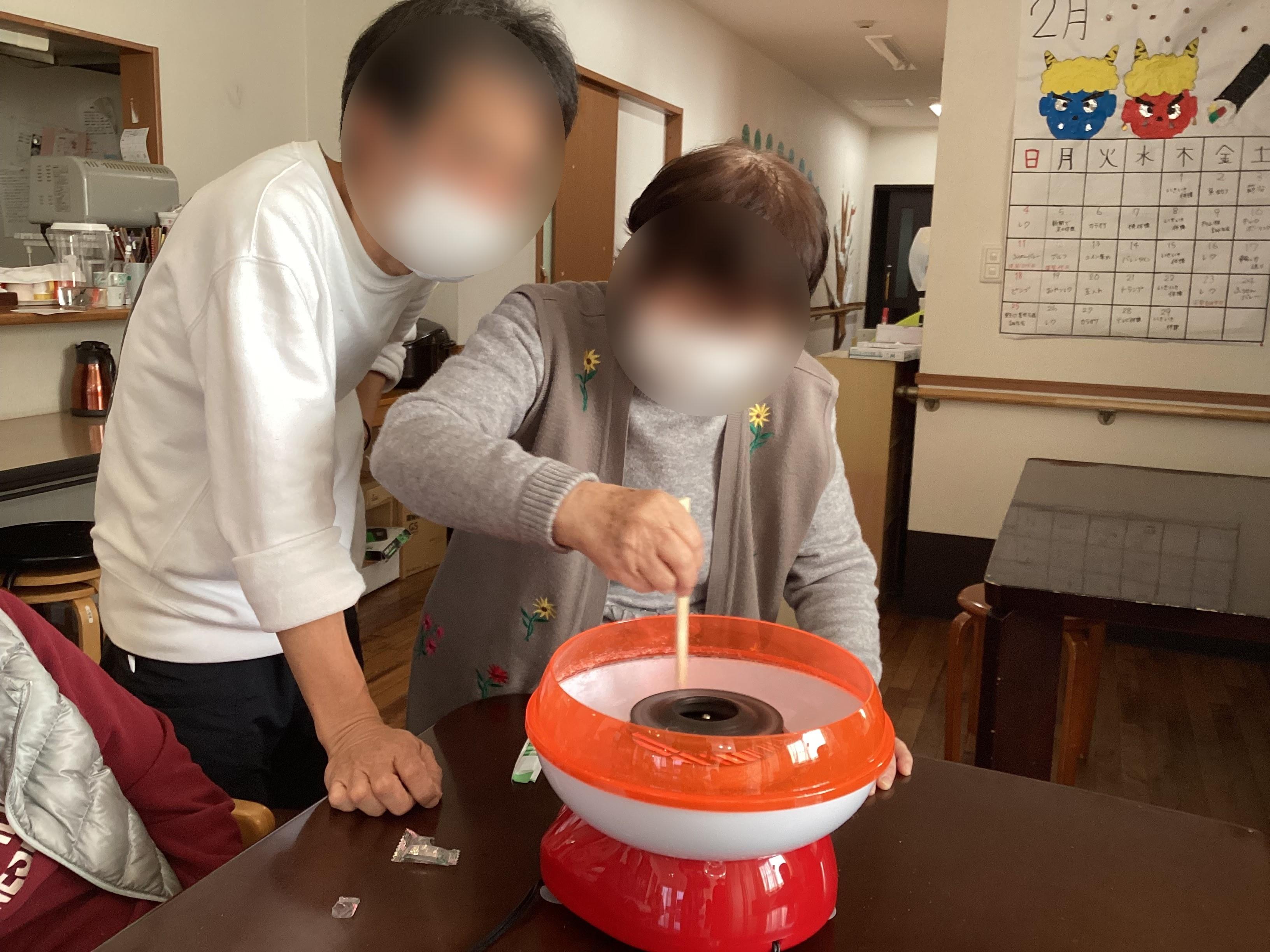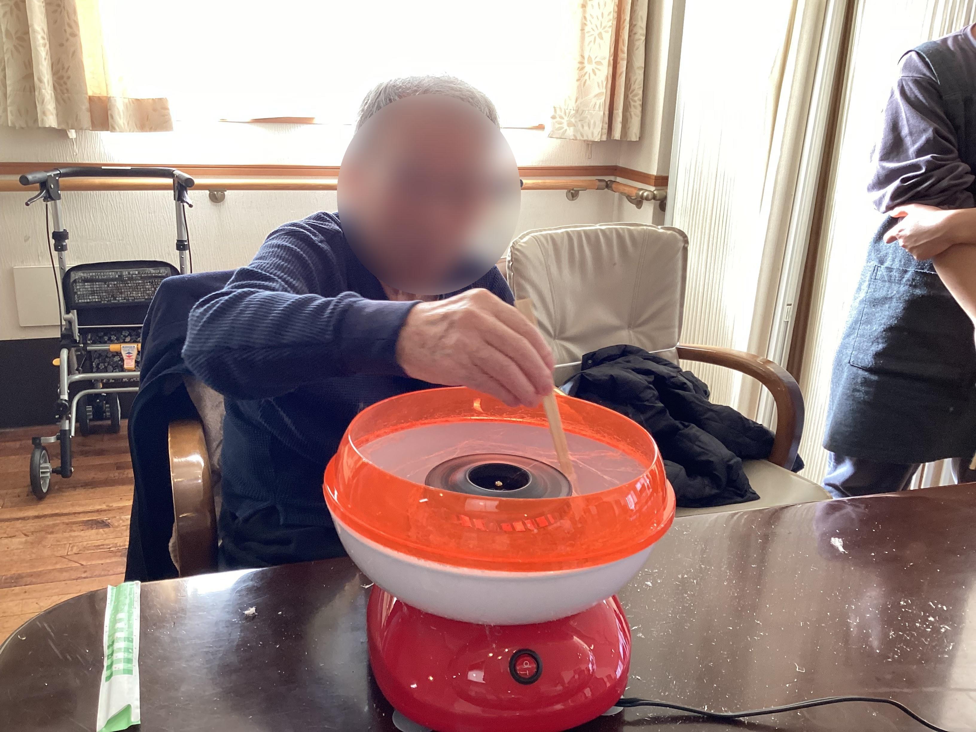 飴玉を入れて綿菓子を作る機械を使って、おやつに皆様に作って頂きましたnotes