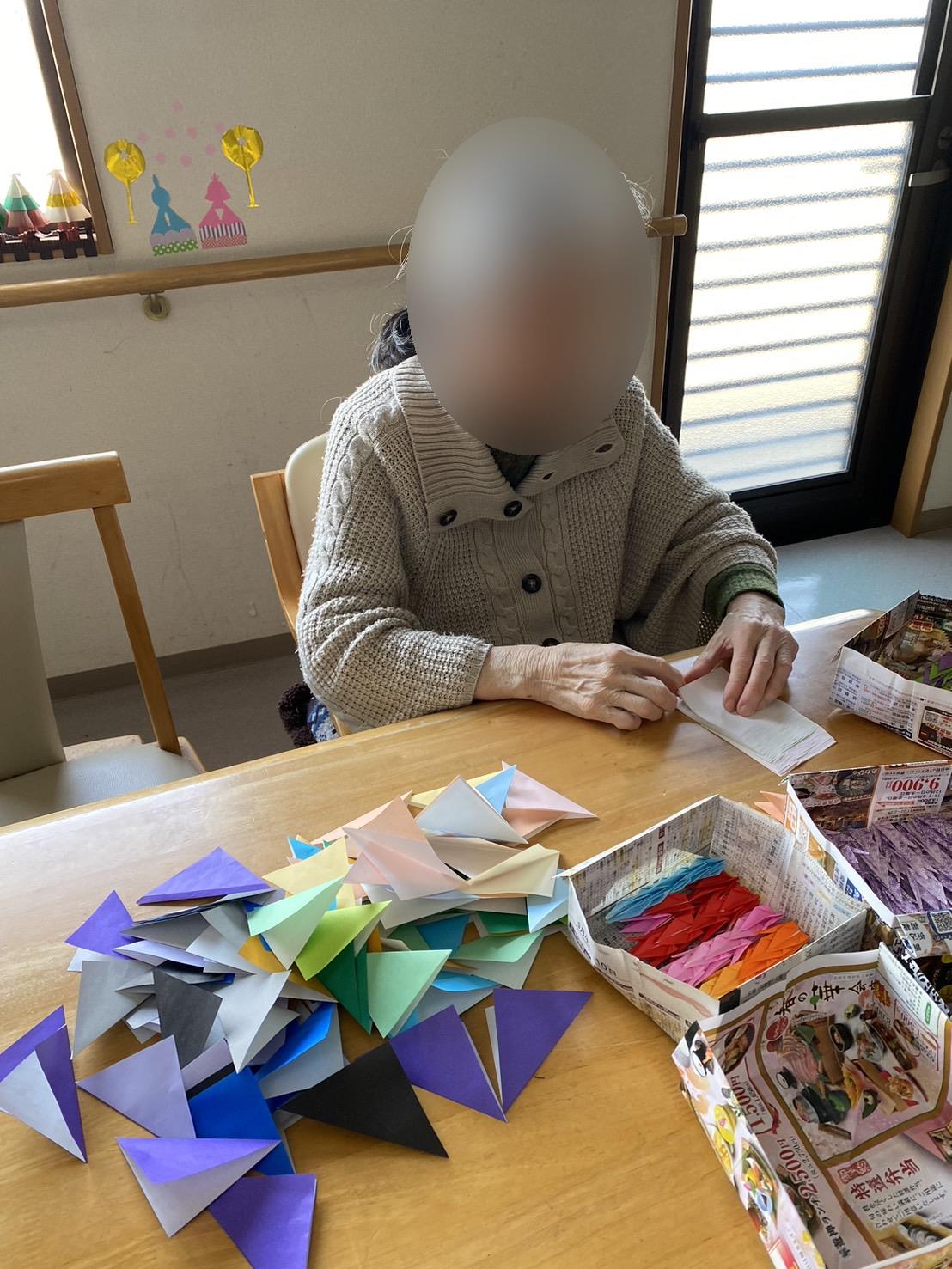 2階は、折鶴で季節の花を作られていて、折り紙が得意な入居者様が、折り鶴を一生懸命折られていました
