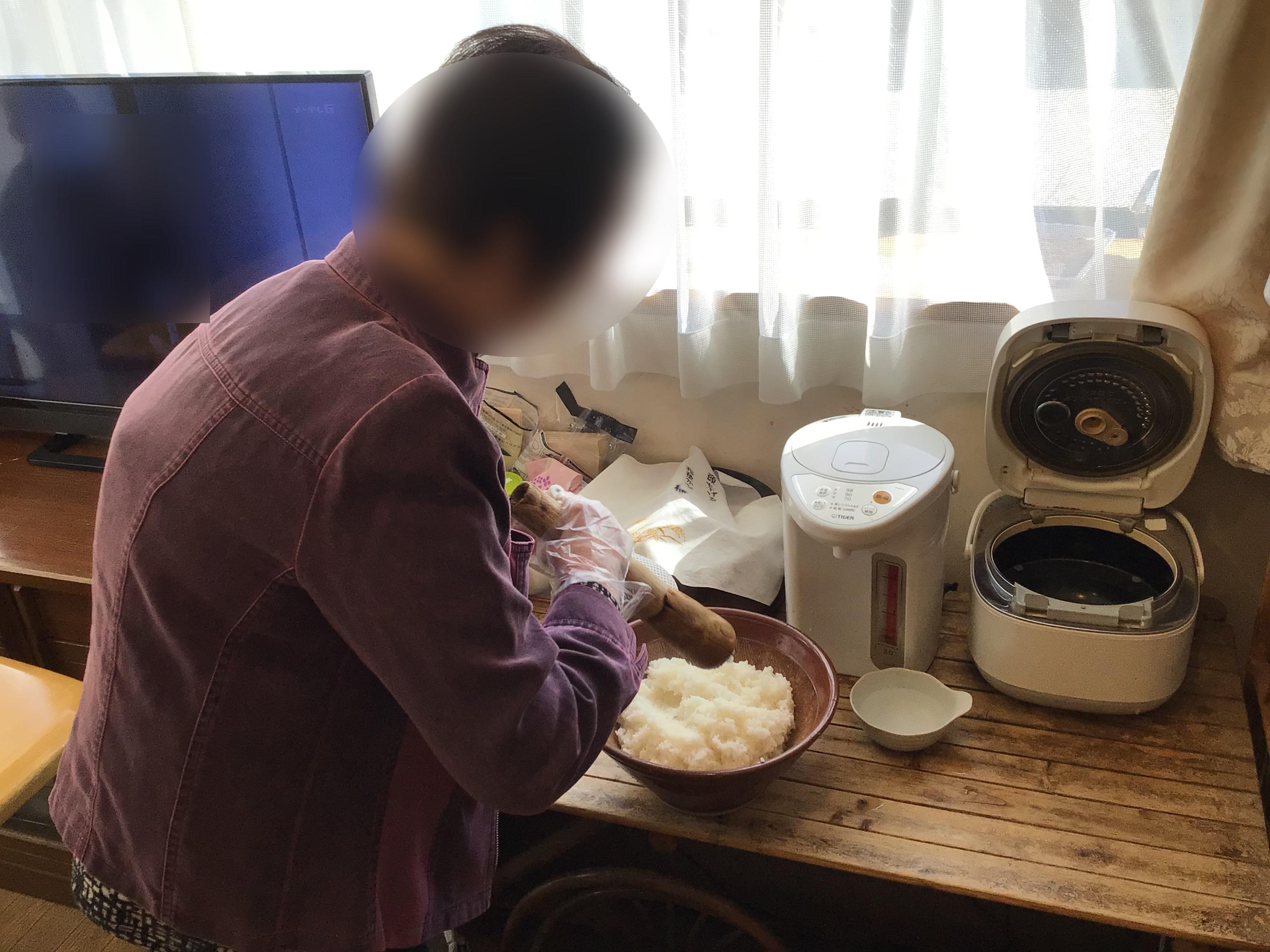ごはんともち米をまぜて軽くつぶすと、やわらかく食べやすくなります