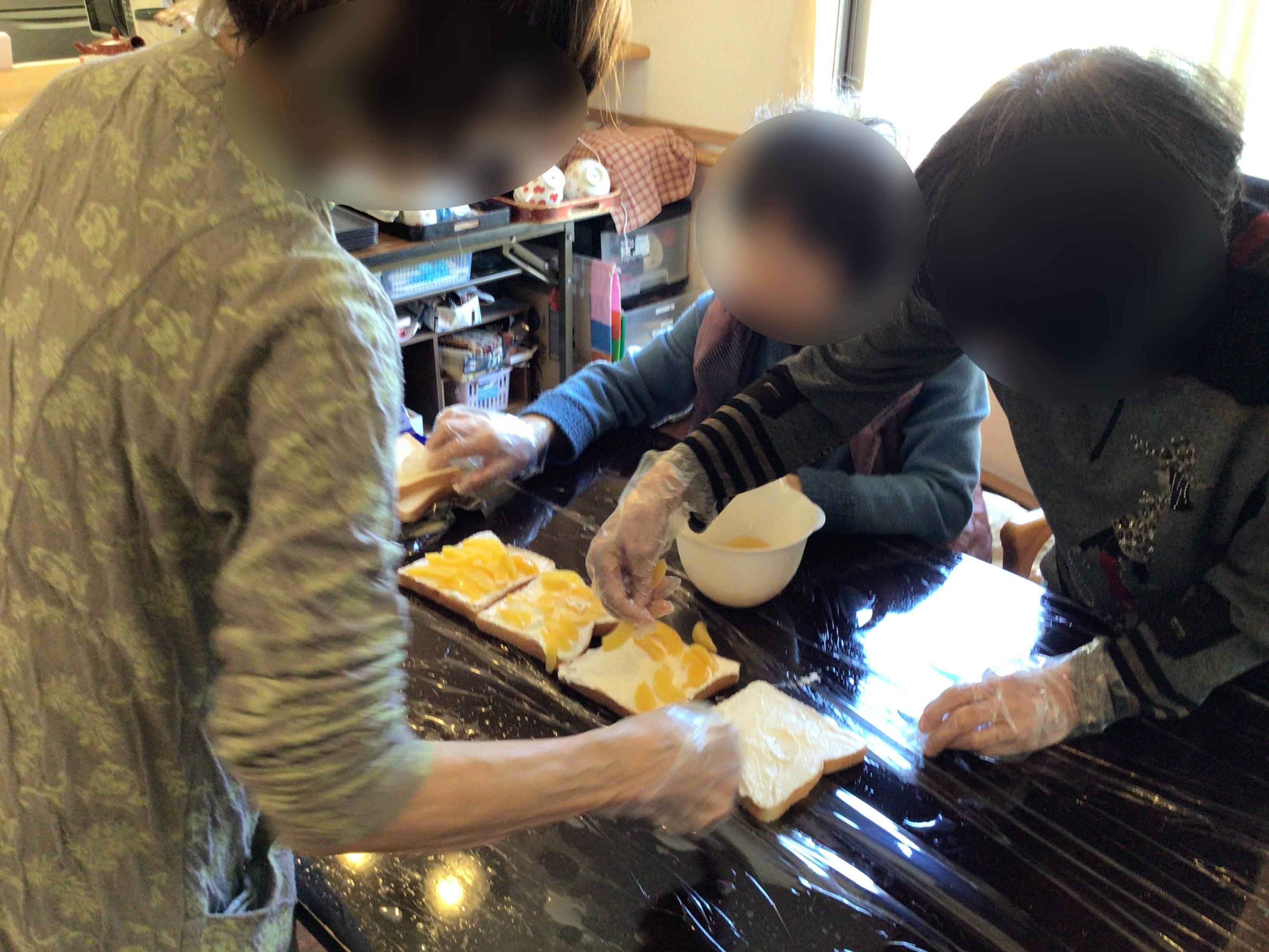 おやつレクにて、フルーツサンドを皆さんで作って頂きました