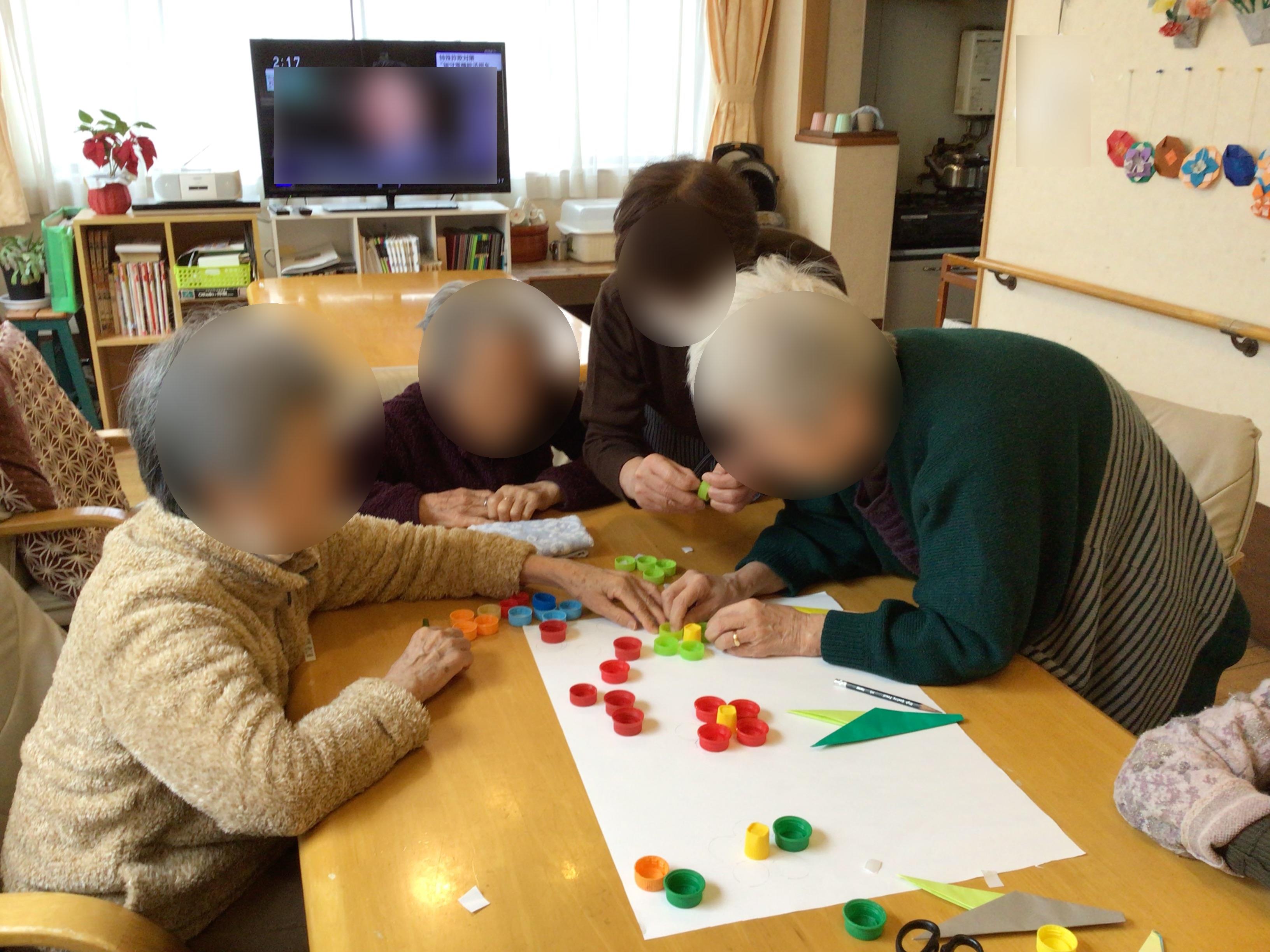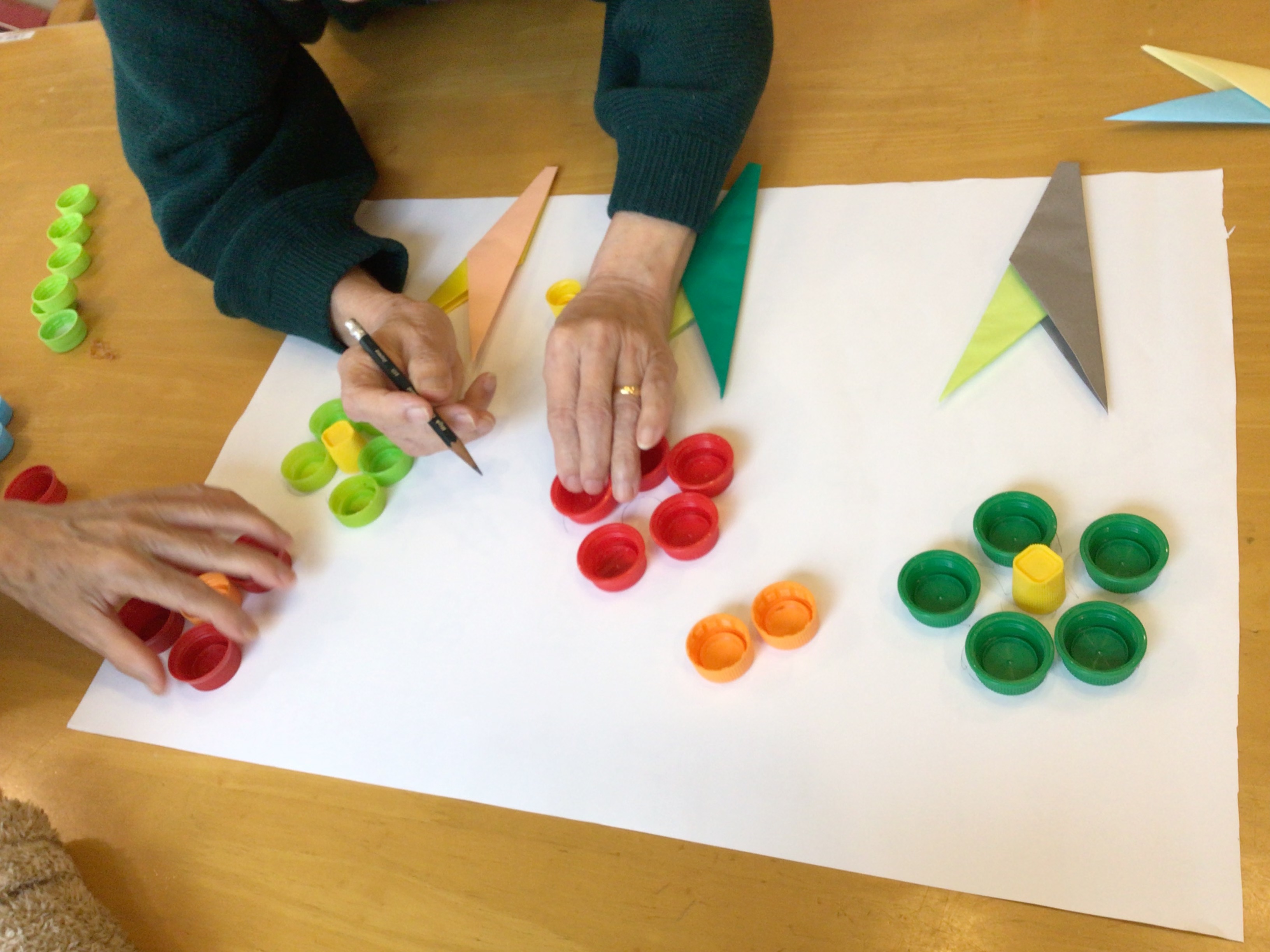 ペットボトルのキャップを再利用し、壁面飾りを作りました