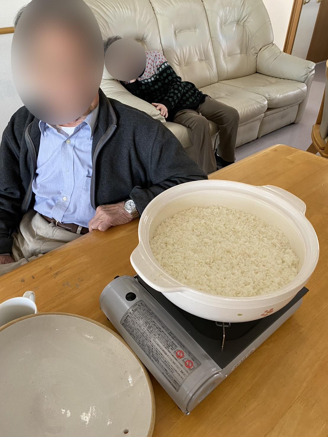 お昼ご飯をカセットコンロを使って土鍋で炊いていただきました