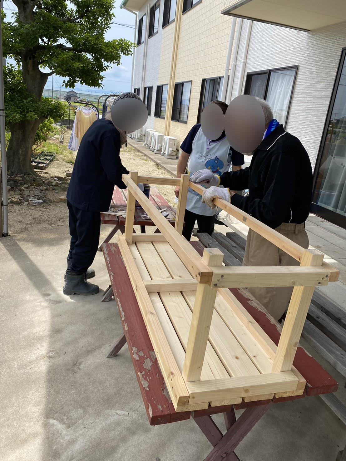 今日は入居者様と一緒に先月作った椅子に色