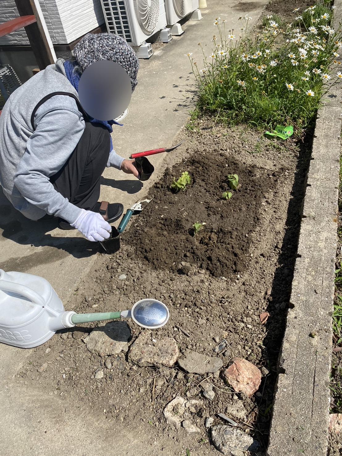 今日は入居者様と畑に大葉の苗を植えました