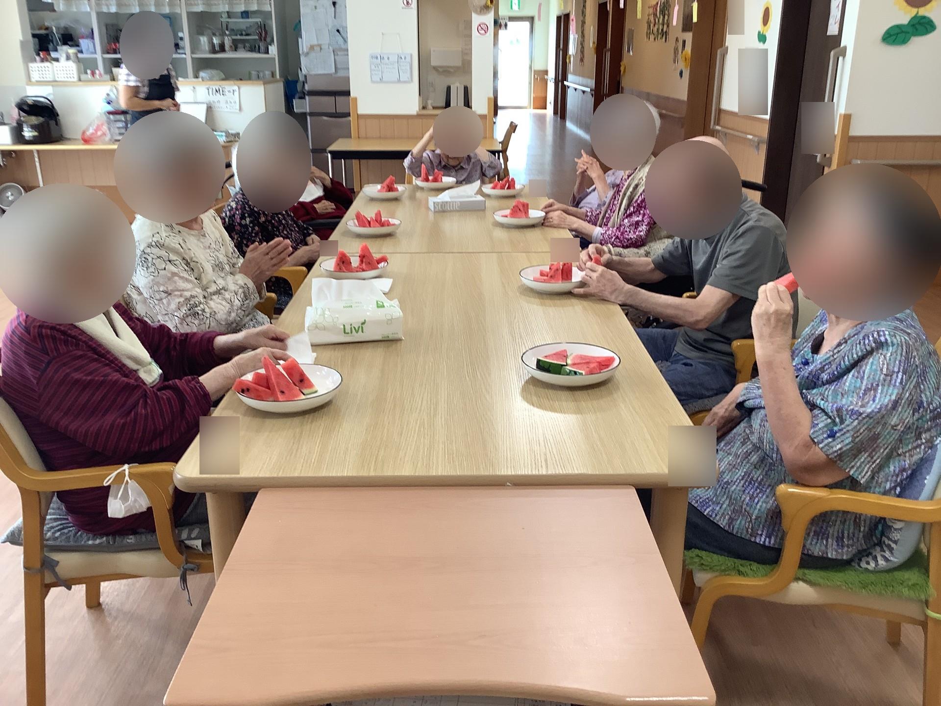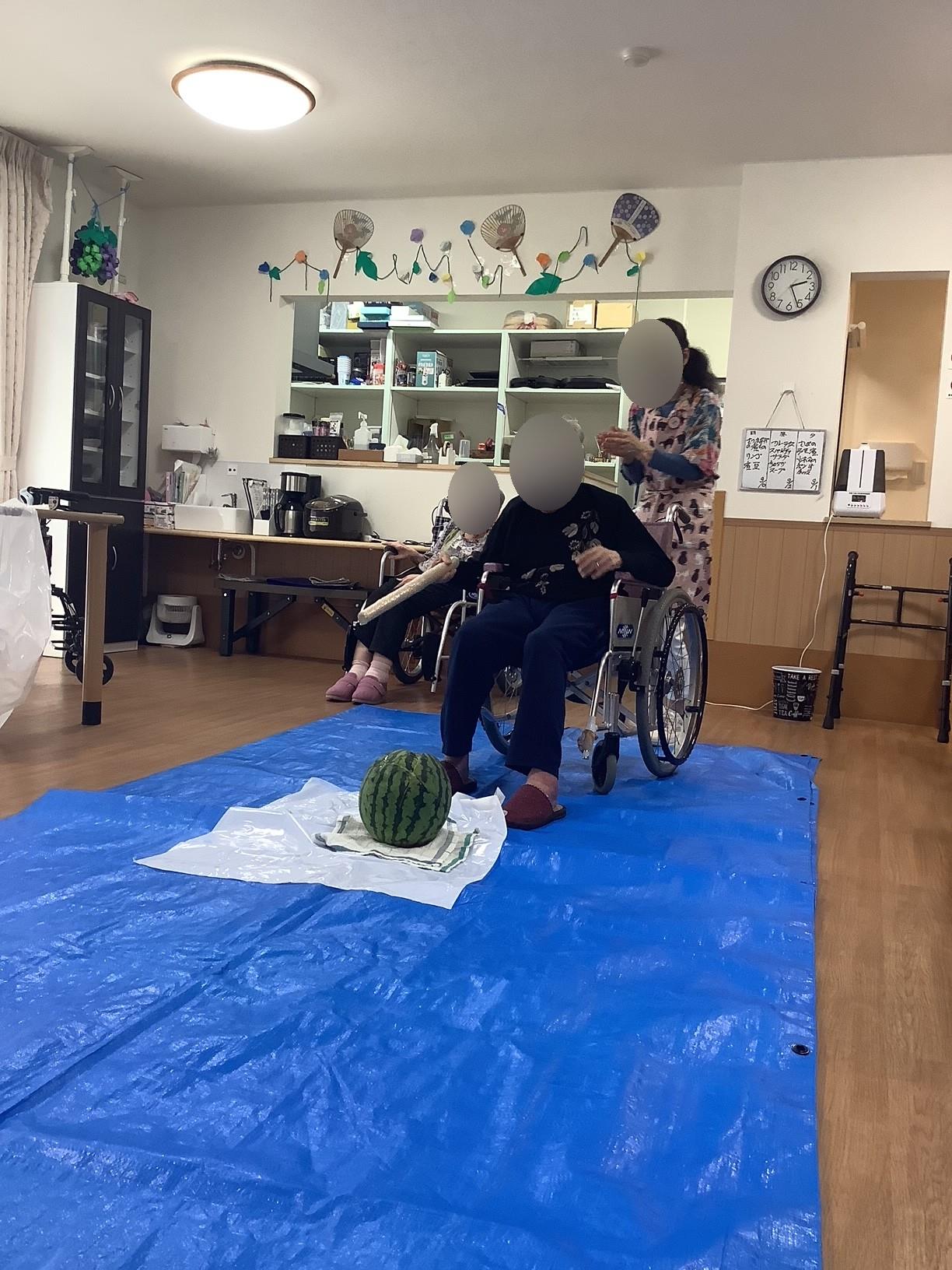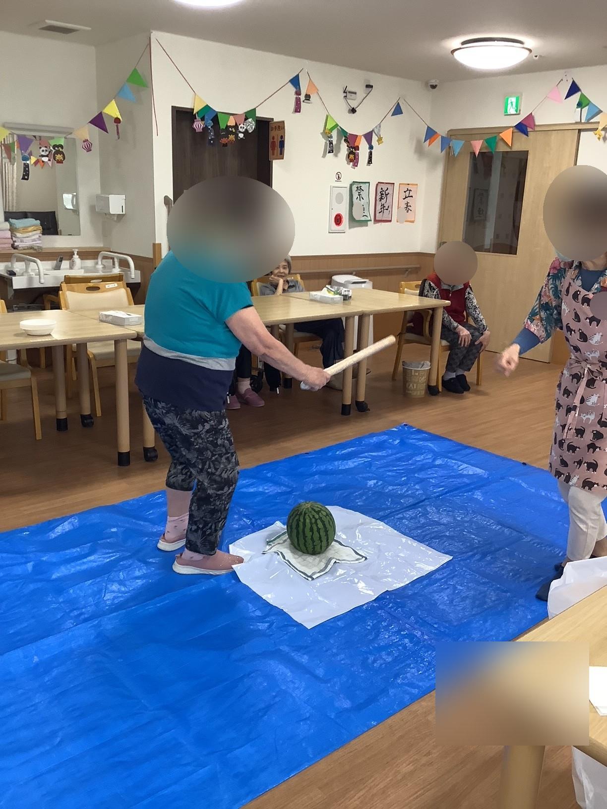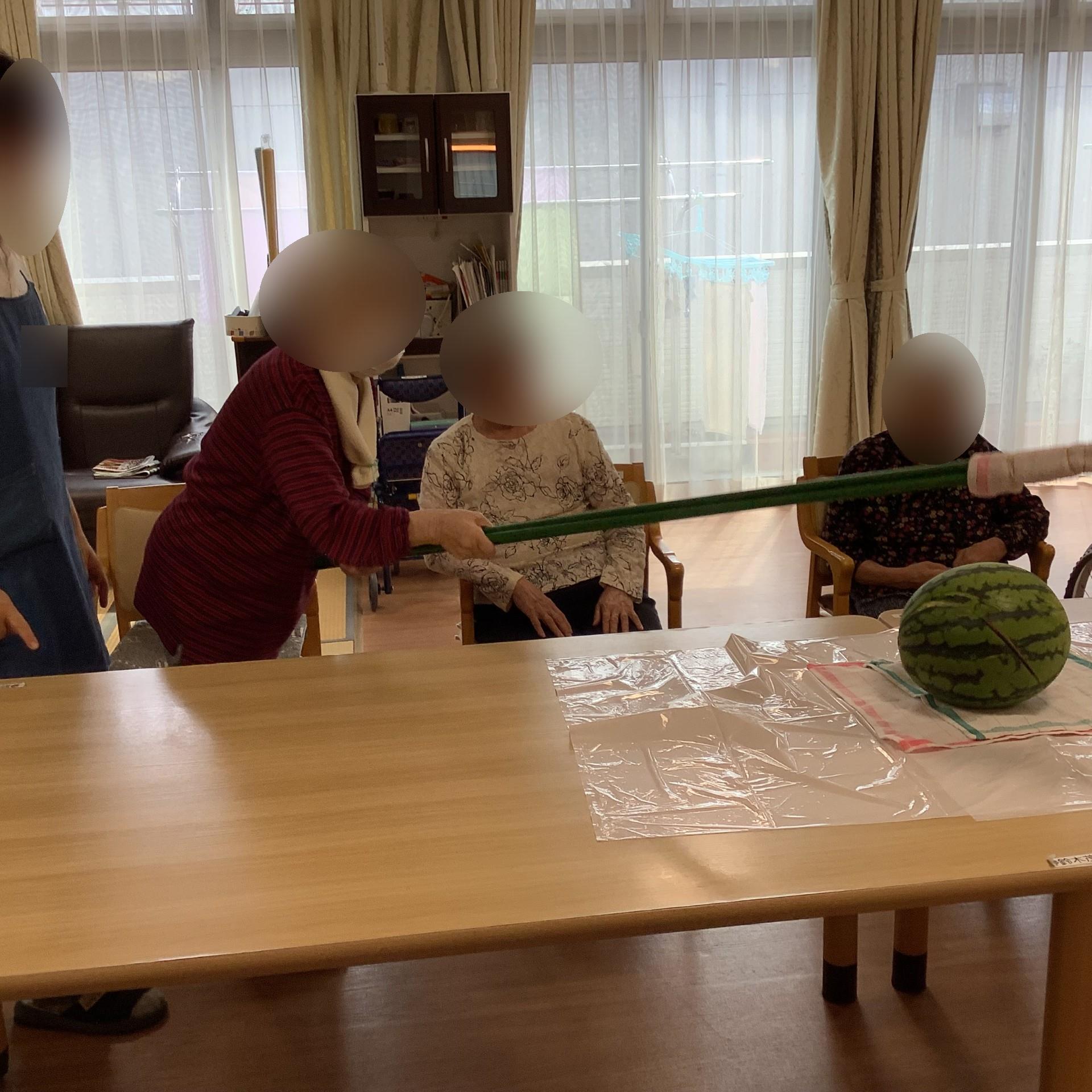 歩行が危ない方が多いグループでは、テーブルの上にスイカを置き叩きました
