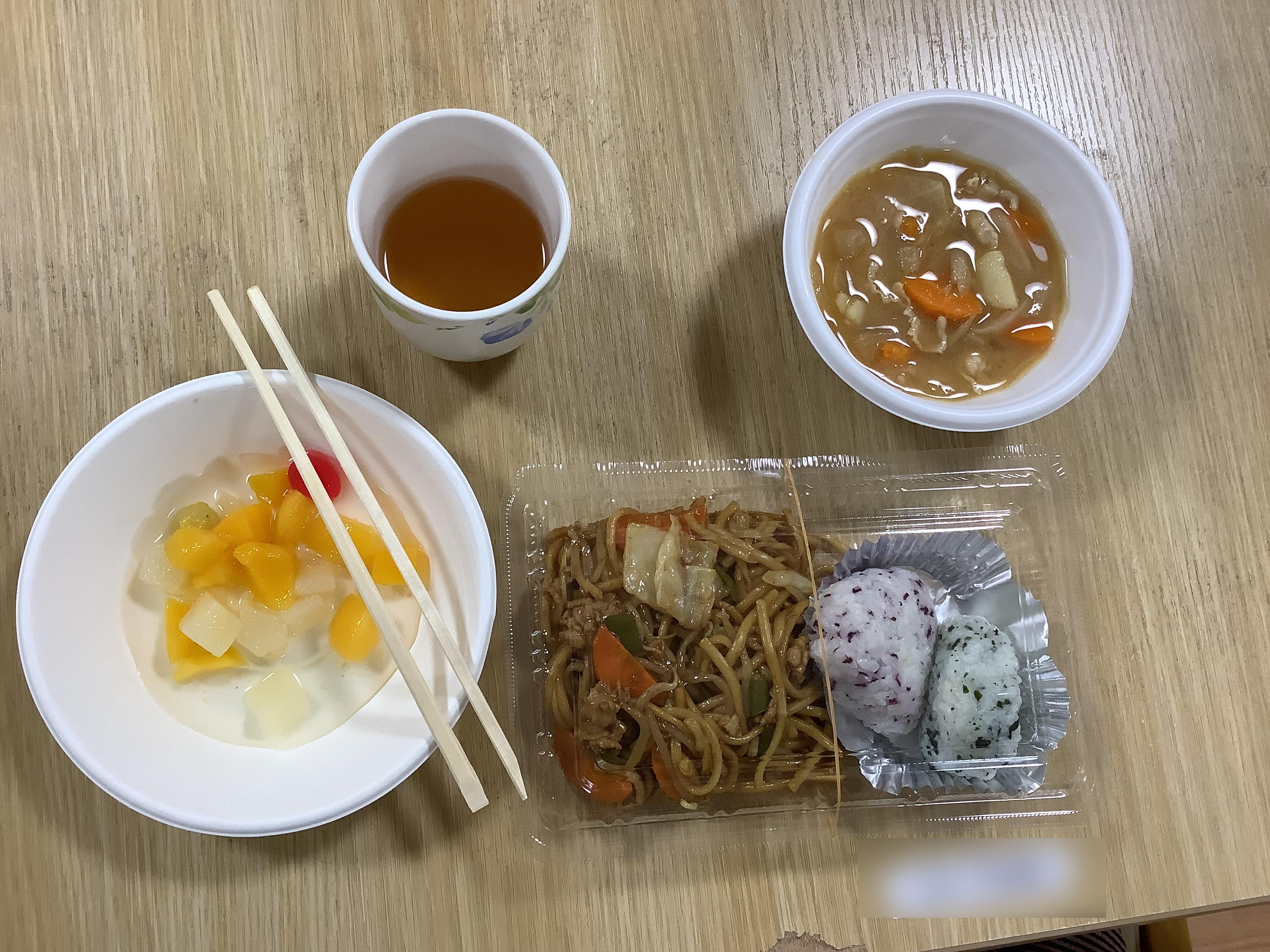 お昼ご飯はお祭りメニューで焼きそば、おにぎり、フルーツをお出ししました