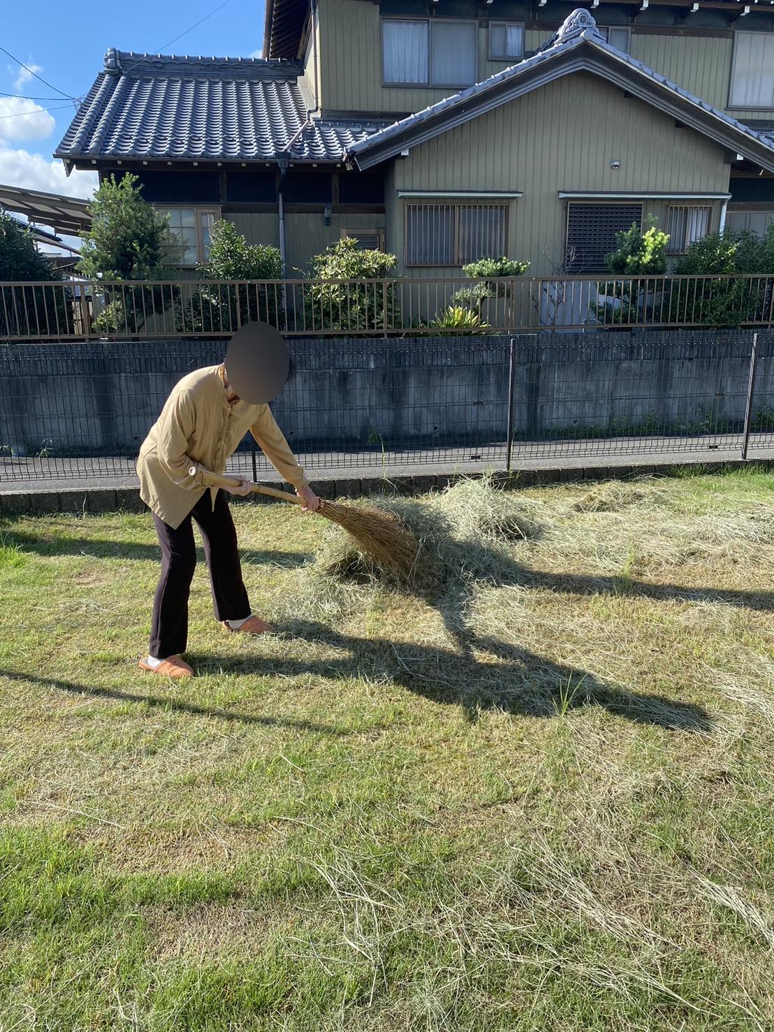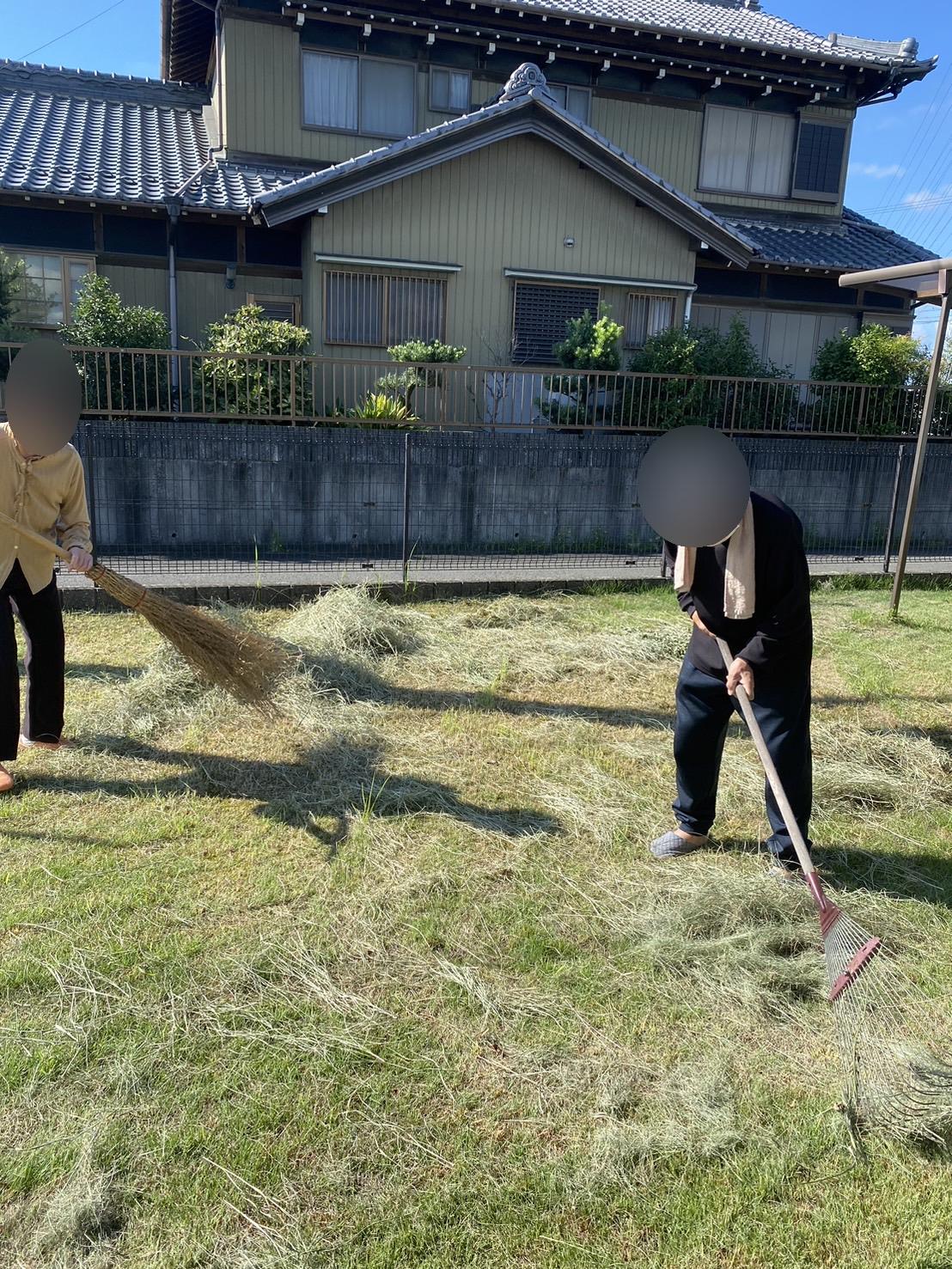 今日は庭の芝刈り後の掃除を入居者様がお手伝いしてくださりました