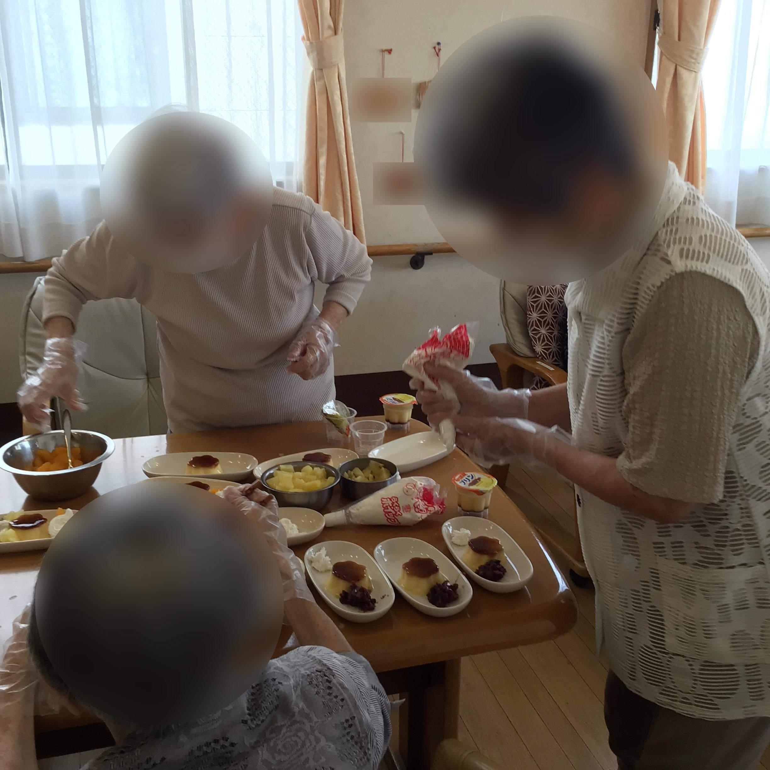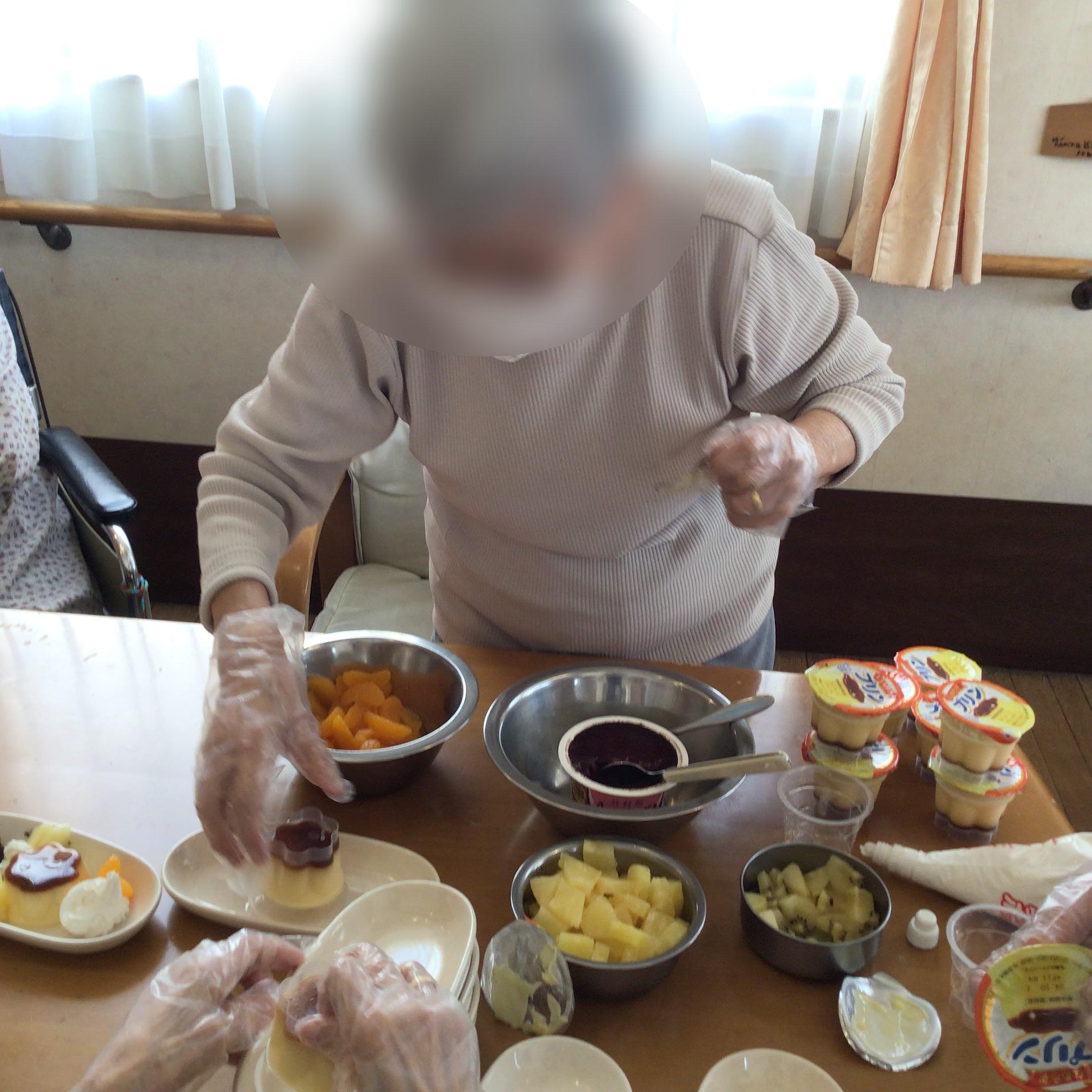 ご利用者様とおやつにプリンアラモードを作りました