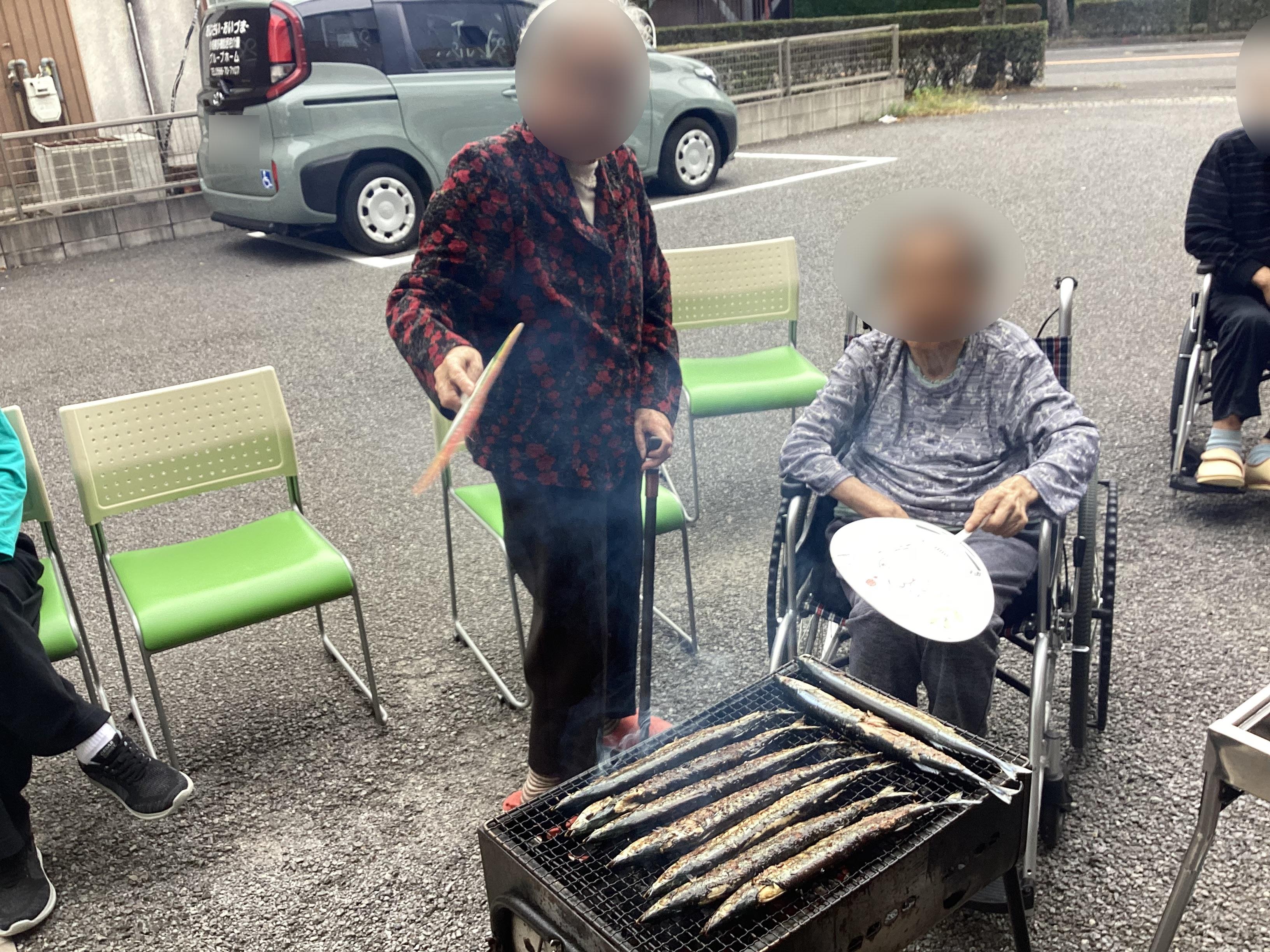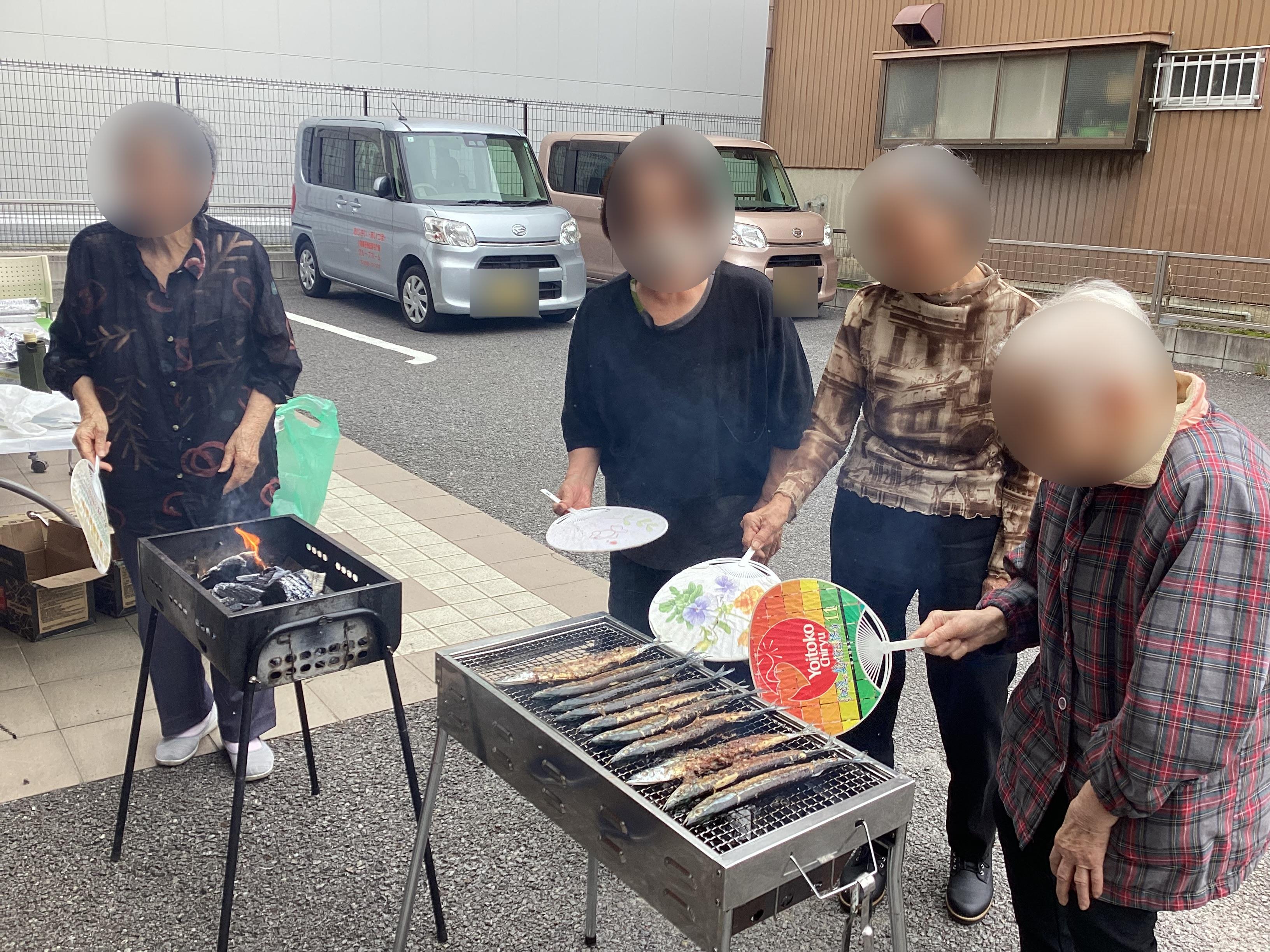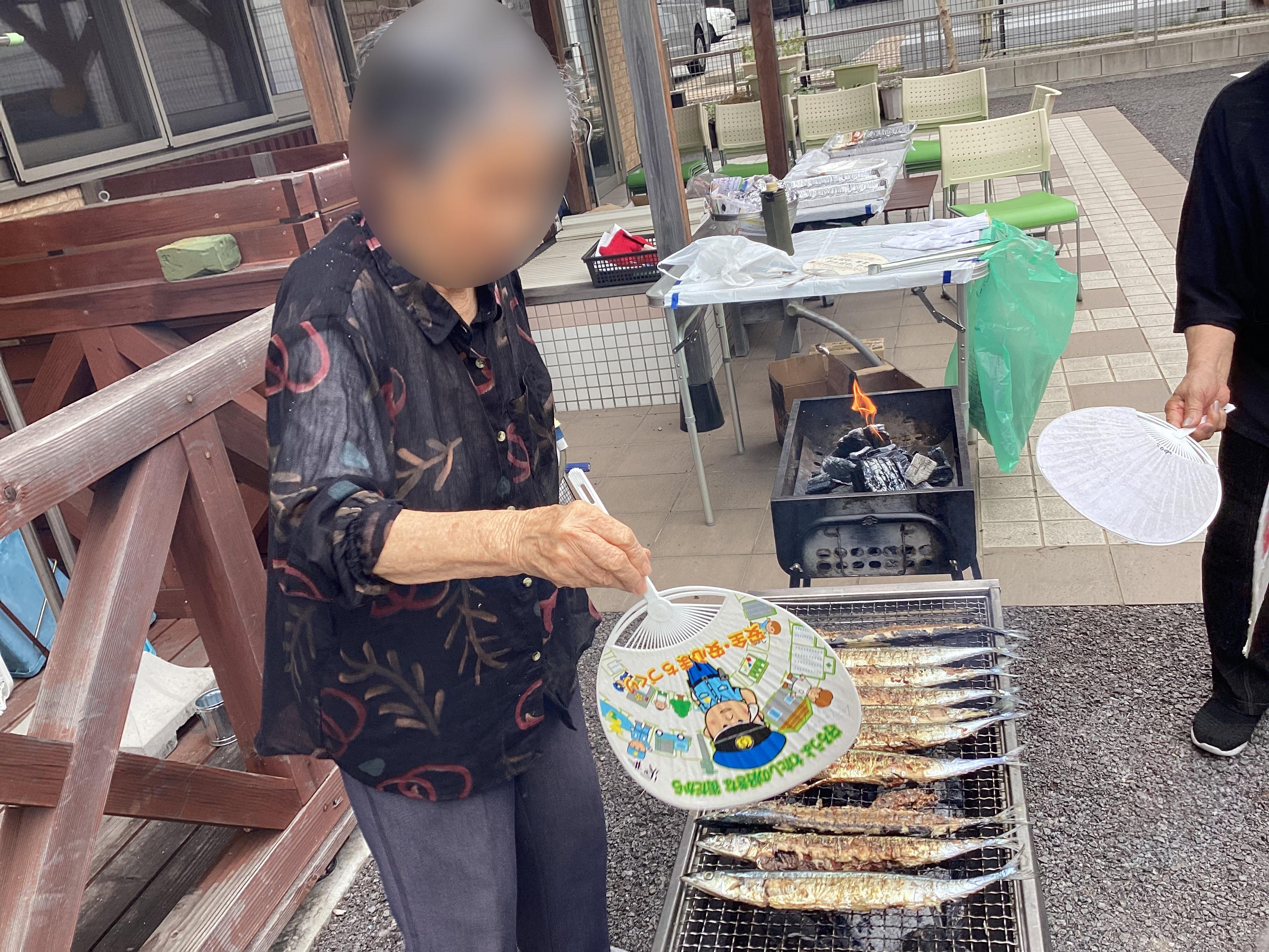 大きな秋刀魚を炭火で焼き、皆様もお手伝いくださいました