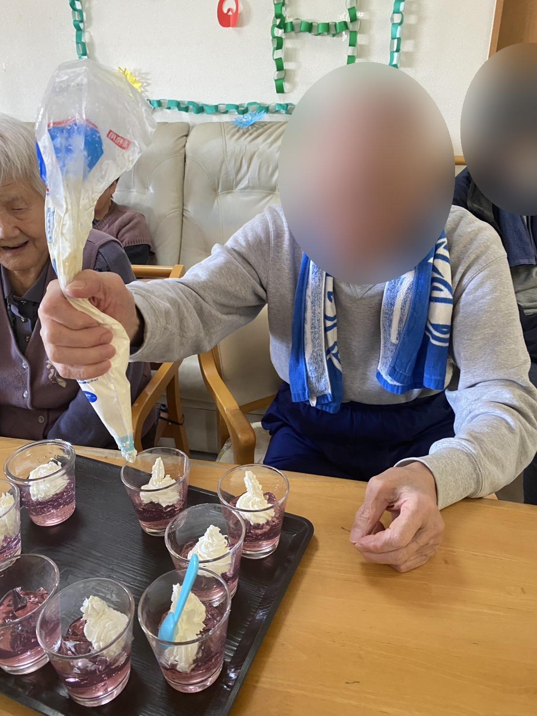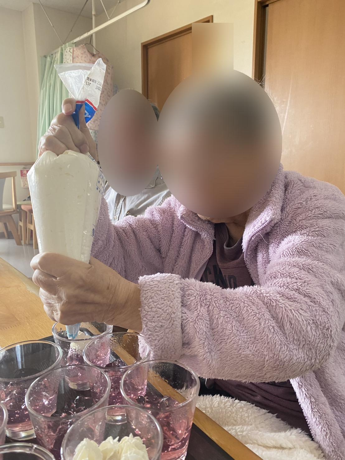 今日は入居者様にゼリーの上に生クリームをトッピングしていただきました