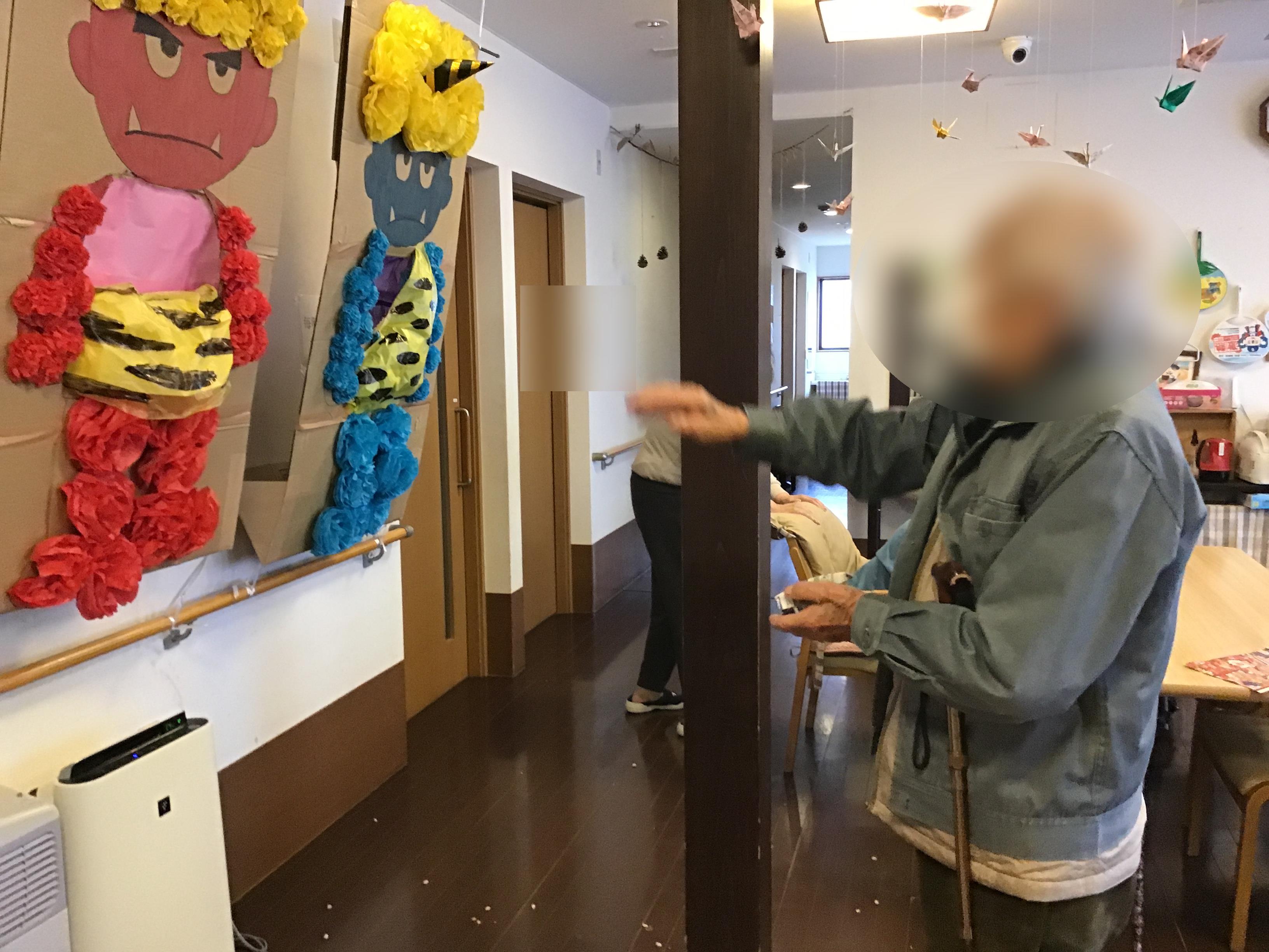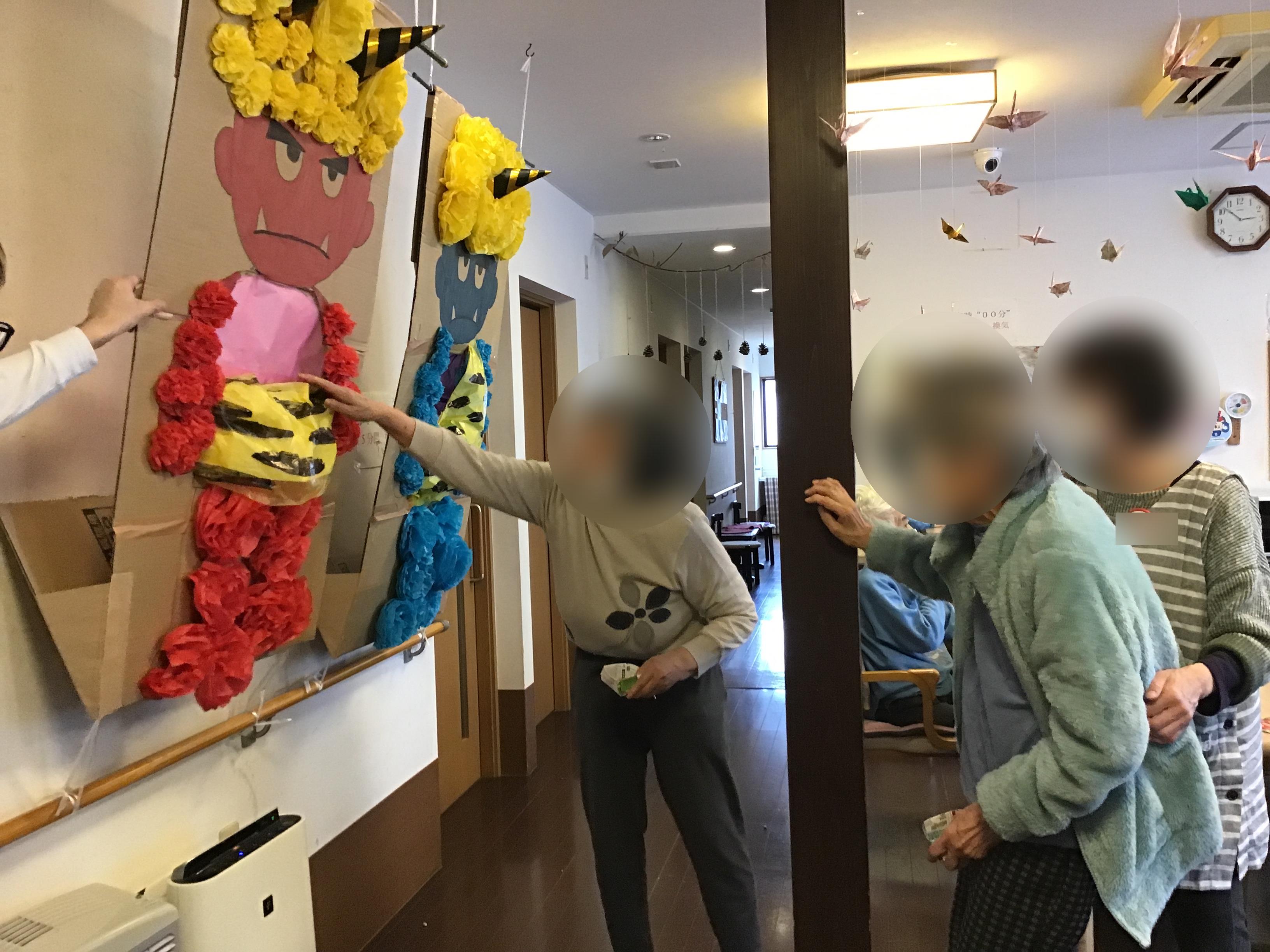 皆で作った壁面創作の鬼に向かって、「鬼は〜外