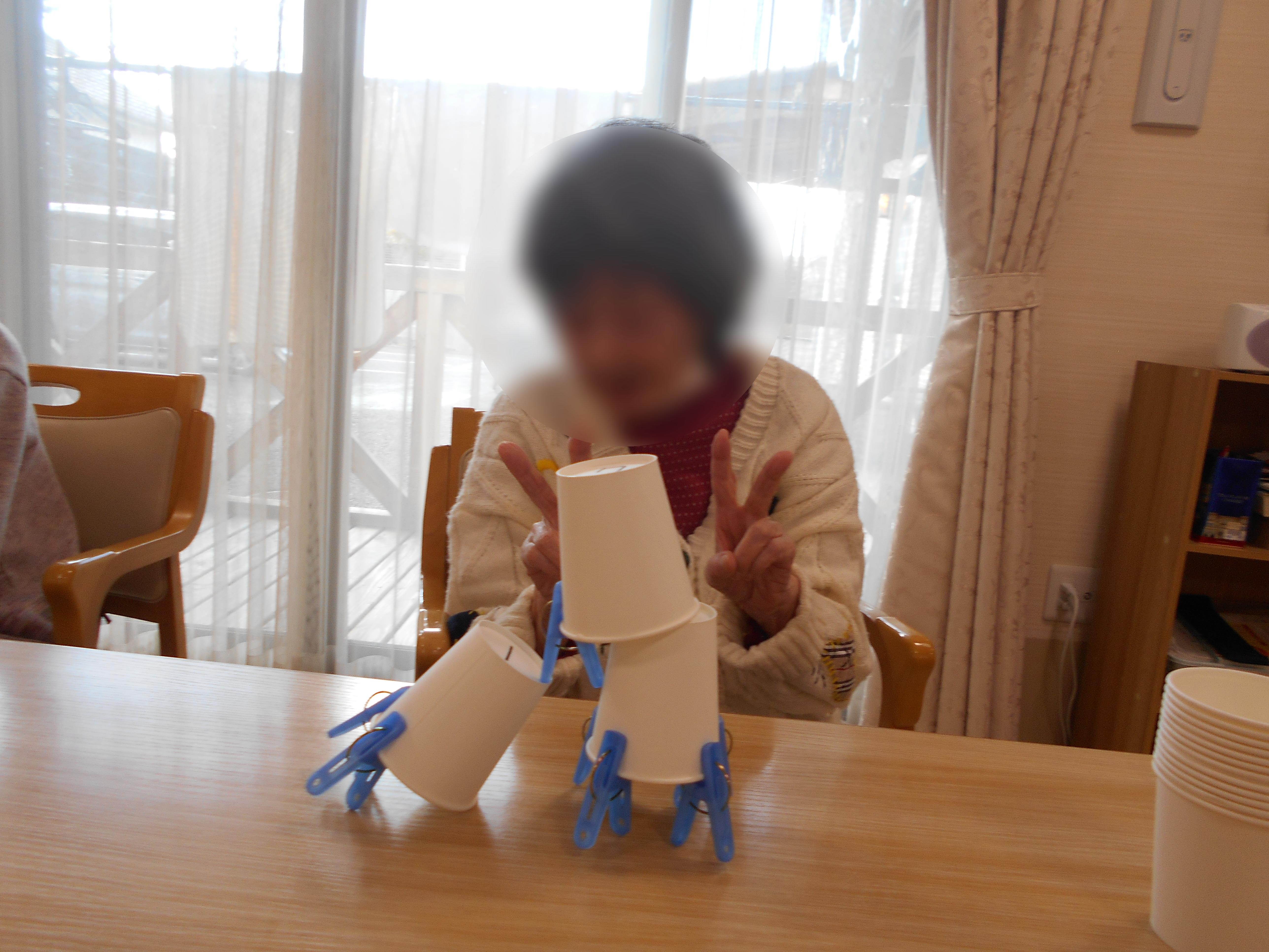 紙コップと洗濯バサミを使って自由作品作りに挑戦しました