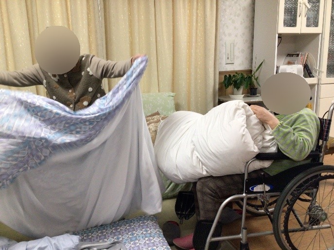 ご利用者様の皆様に布団カバー入れをしていただきました