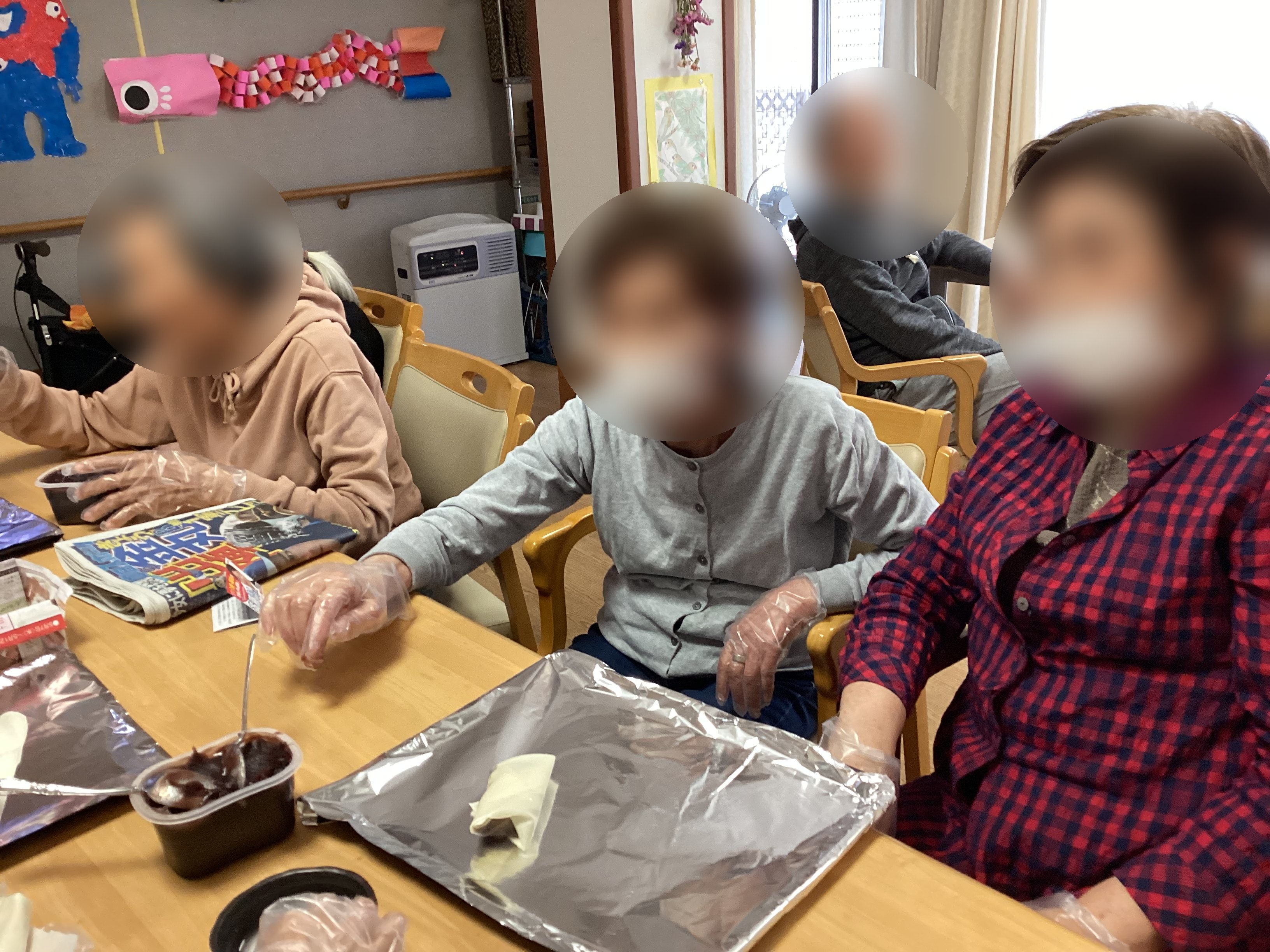 子どもの日にちなみ、おやつにこいのぼり風あんこ包みを作りました