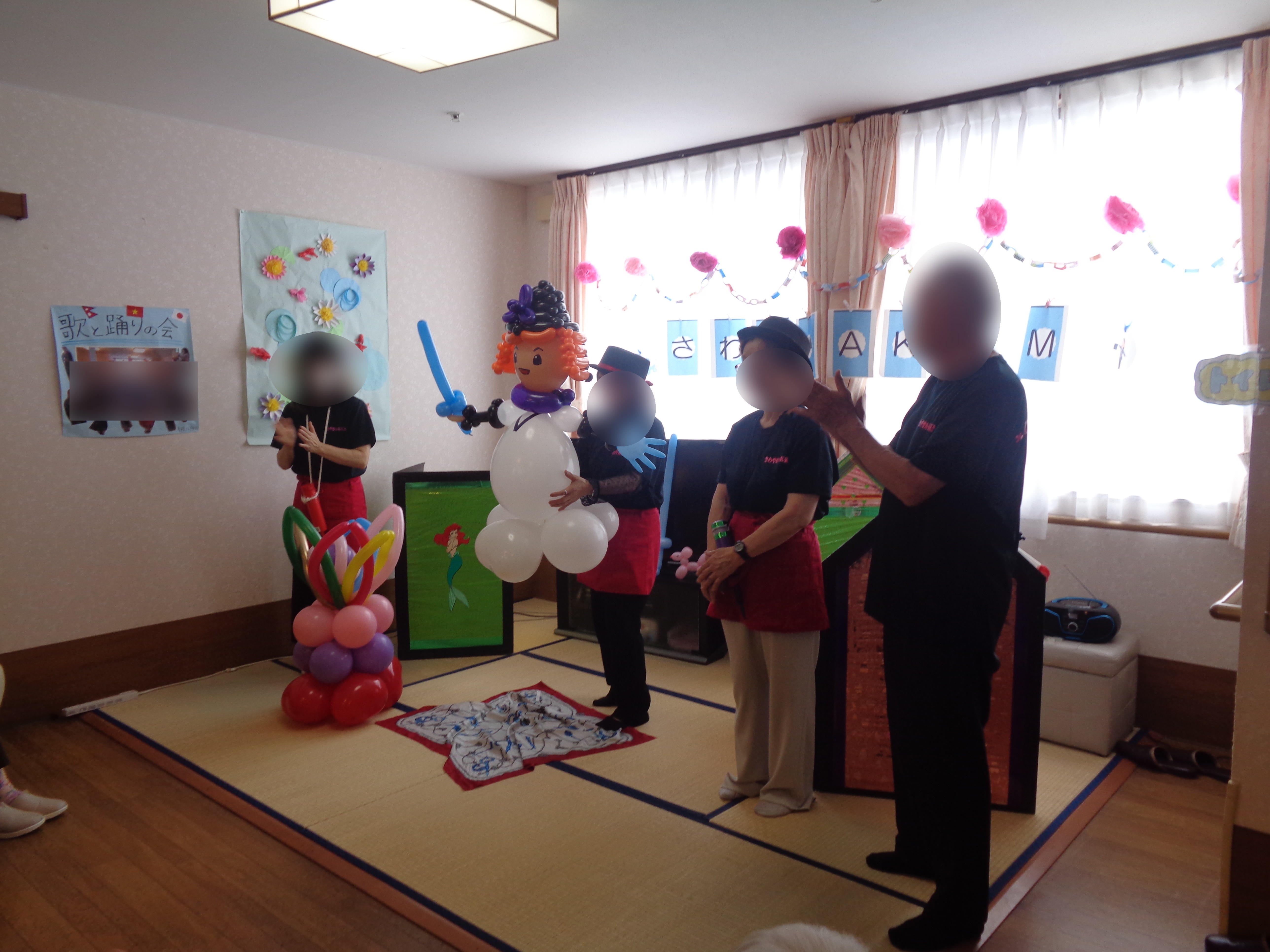 最後に大きなお花とかつなりくんのバルーンアートを組み立て一緒に記念撮影
