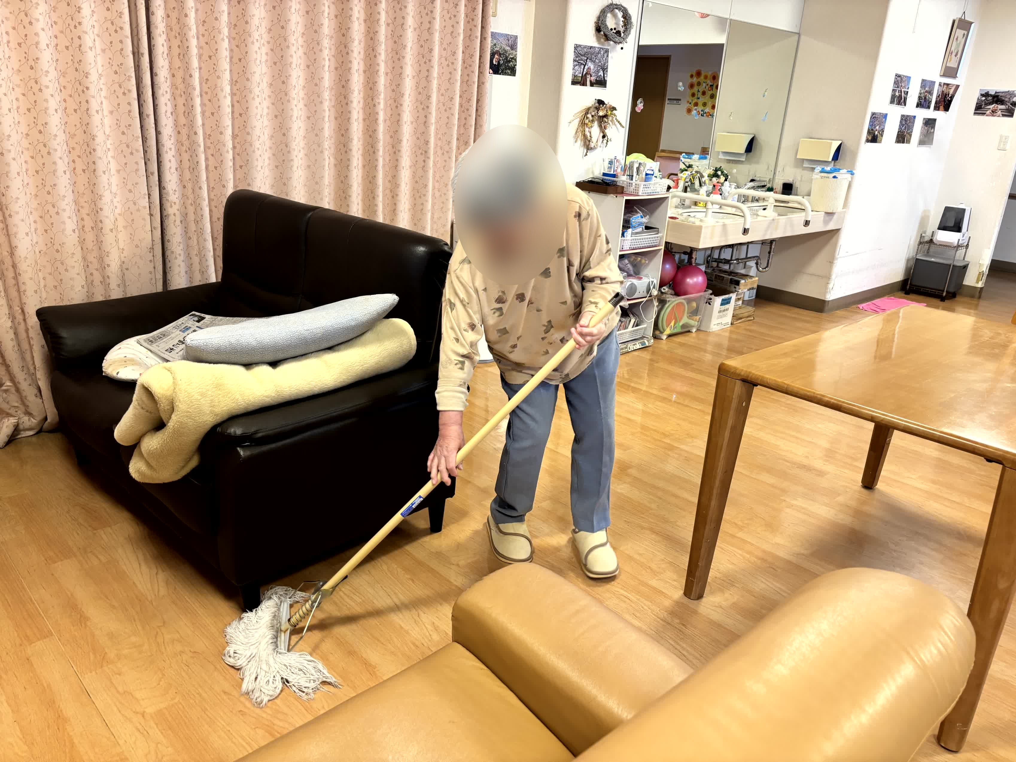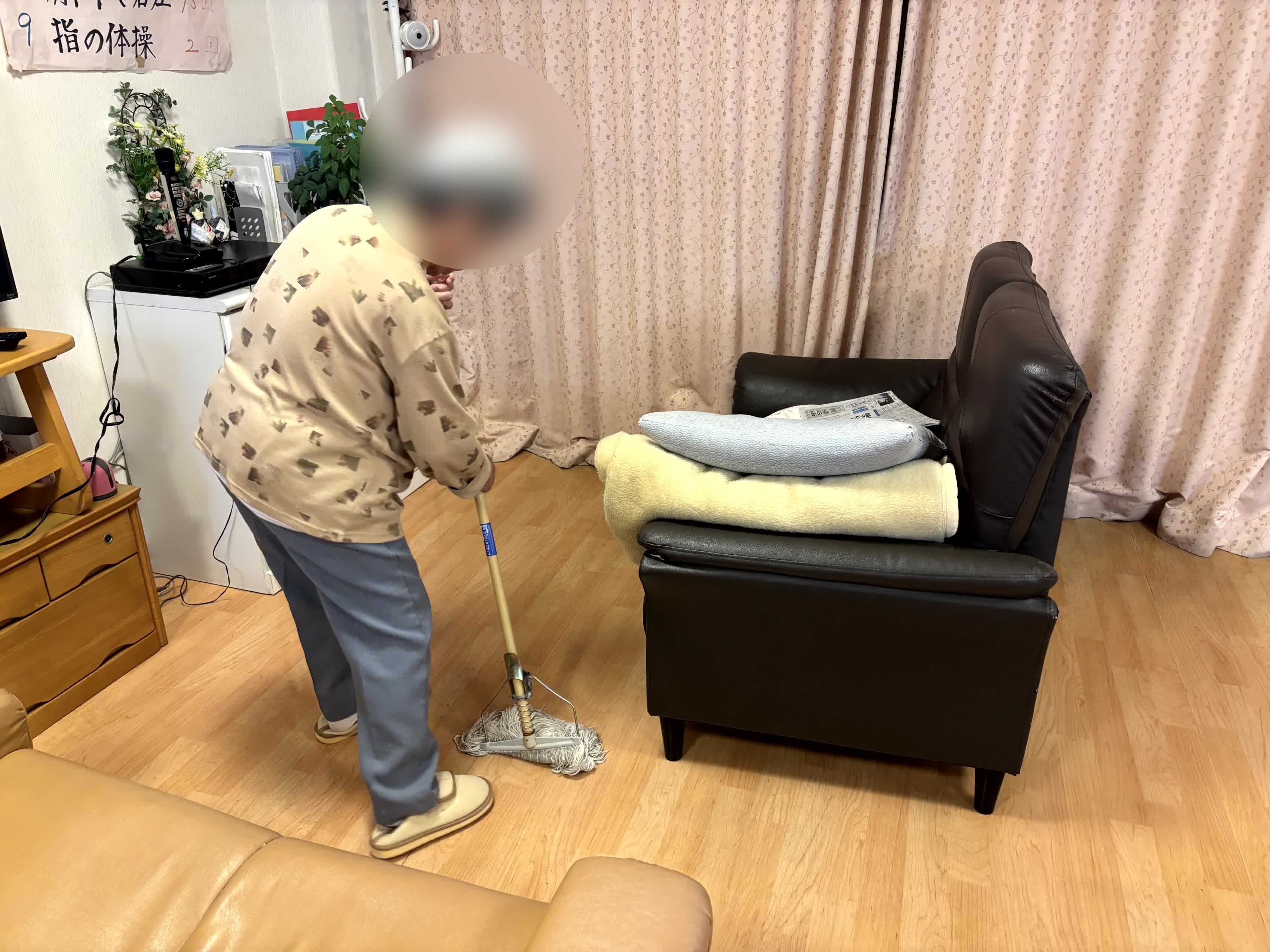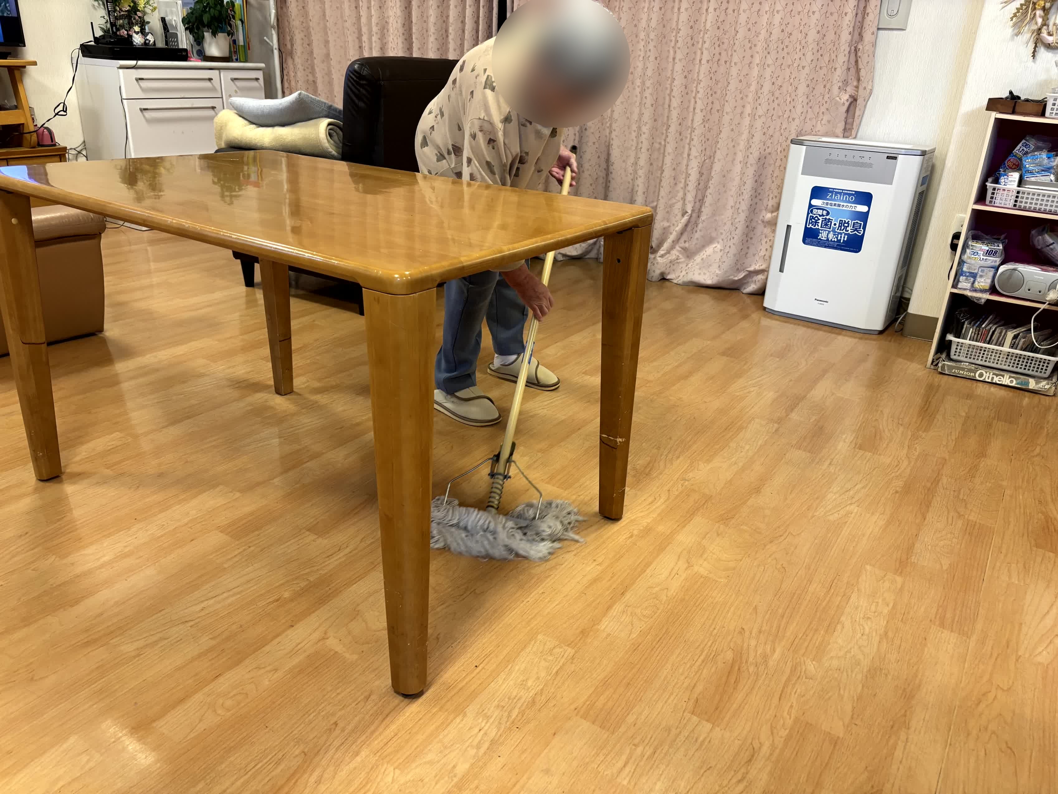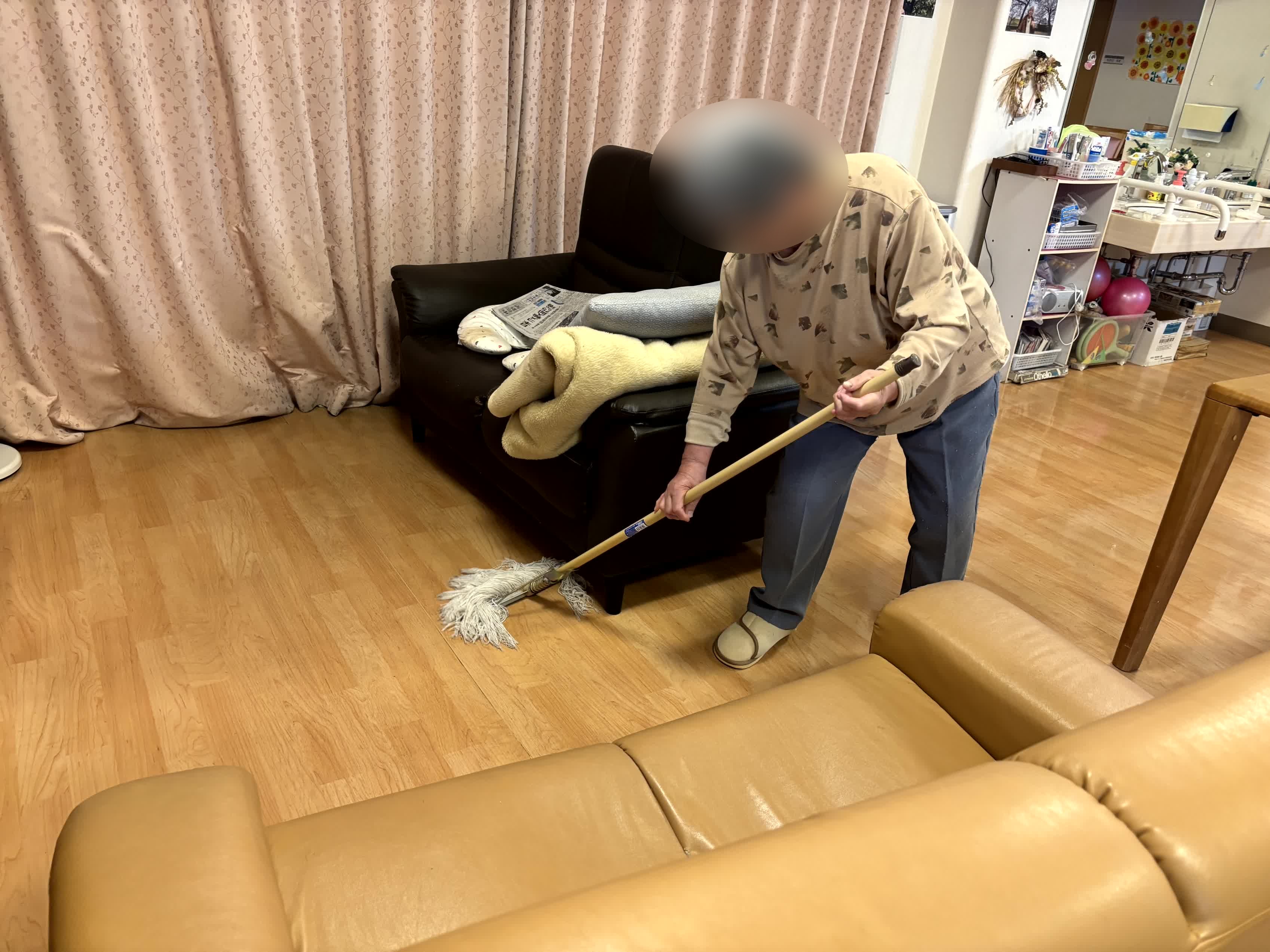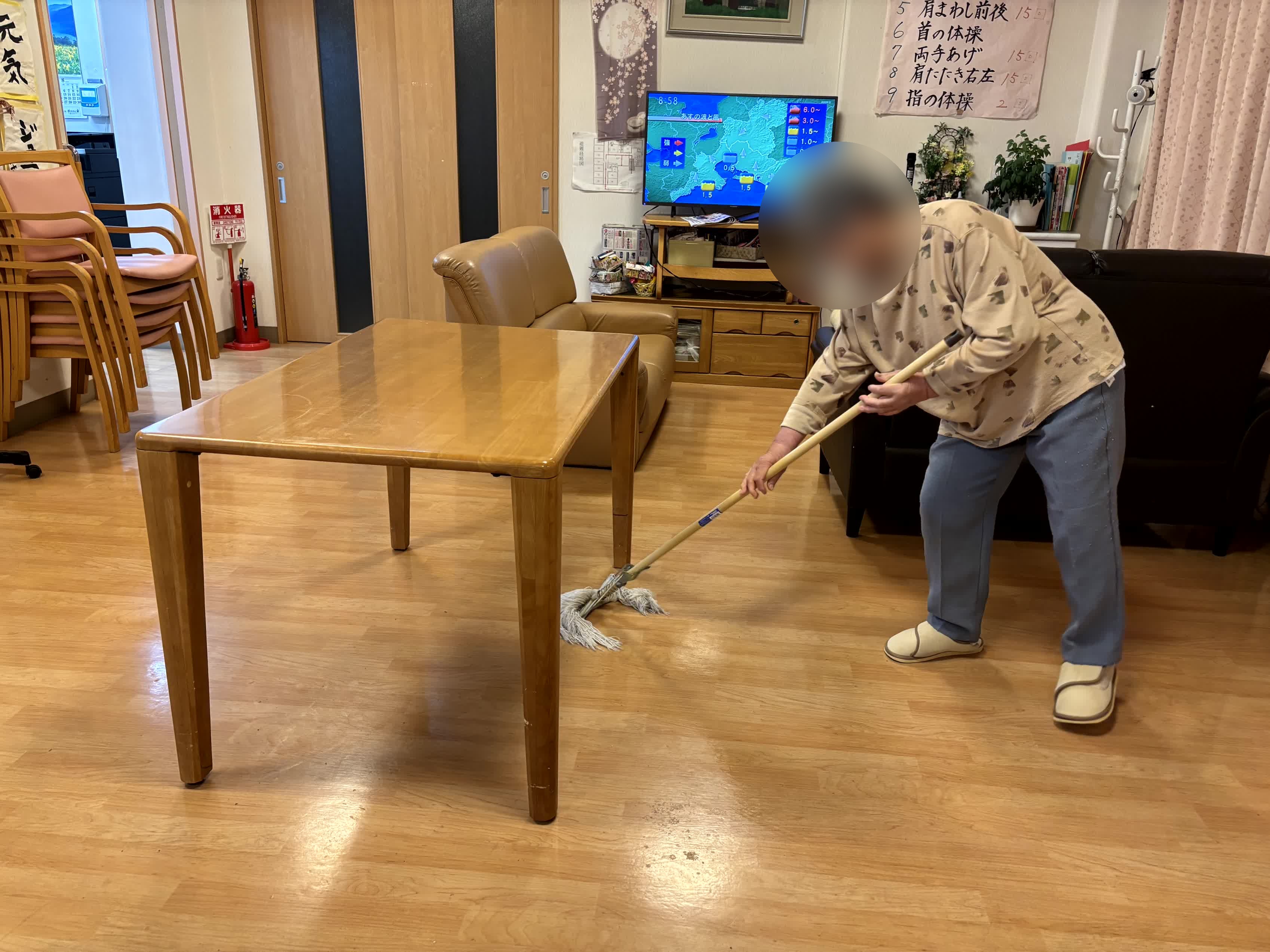 今夜はフロアーのモップ掛けを