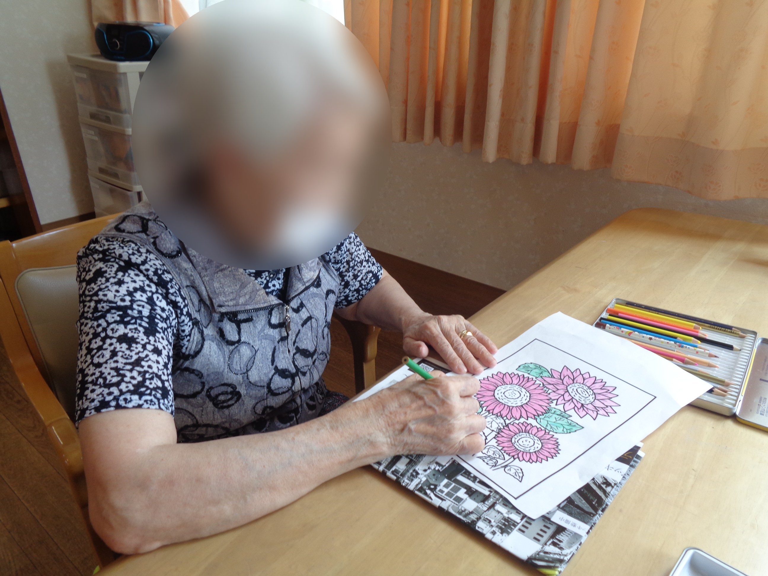 塗り絵ではひまわりや夏祭りの風景など季節のものをご利用者様に選んで頂き、