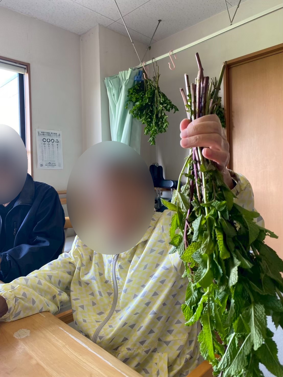 今日は畑で育てているミントを乾燥する作業を入居者様に手伝っていただきました