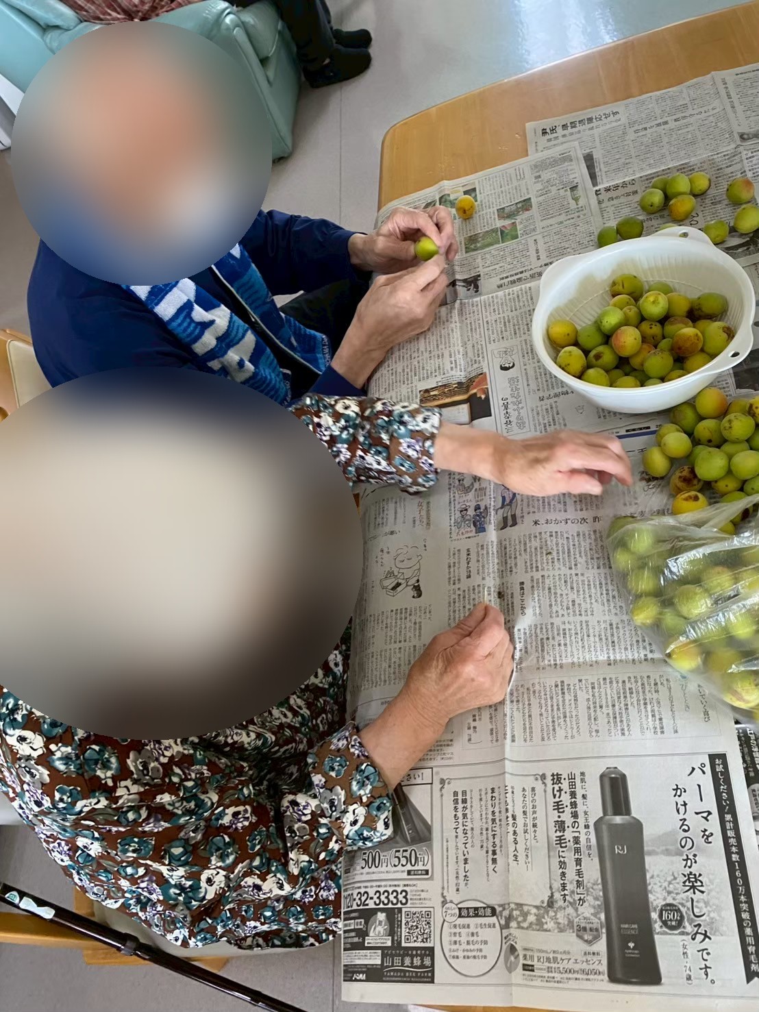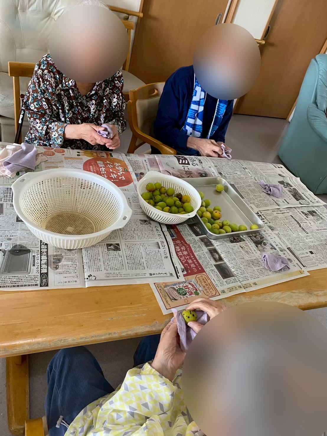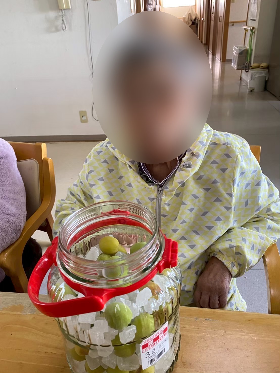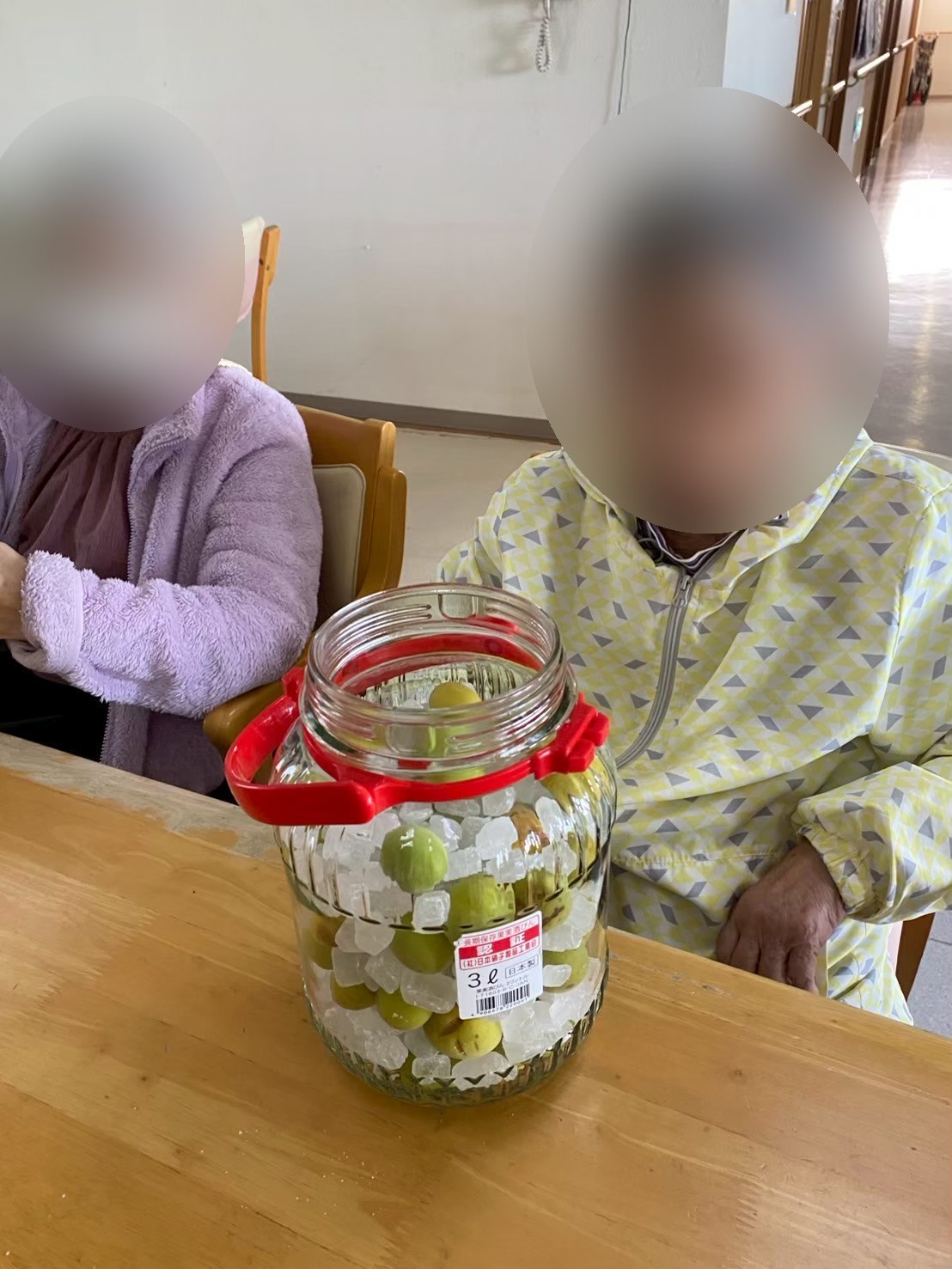 ヘタをとって、洗った梅を綺麗に拭いて、消毒した瓶に氷砂糖と梅を入れて、、、、