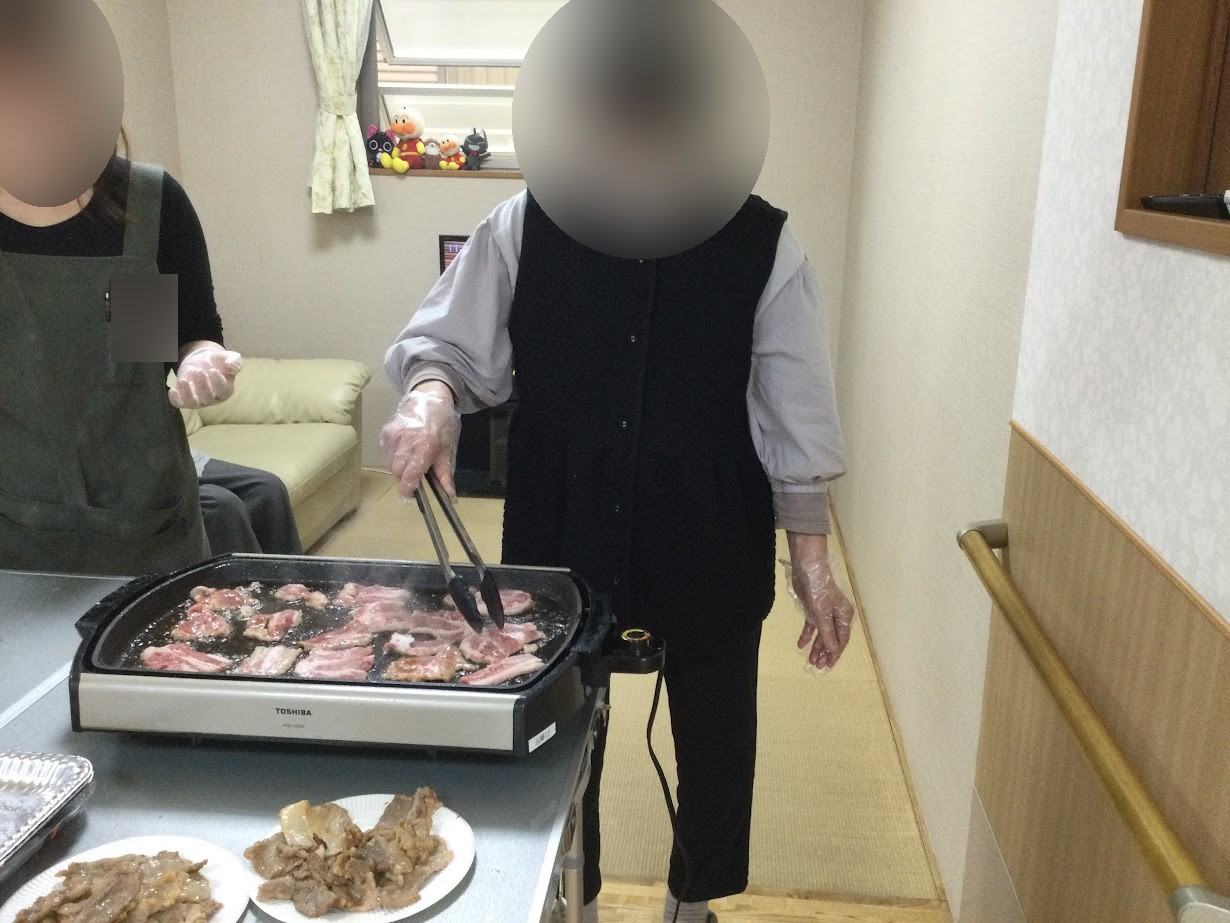 炭火で焼くところを急遽室内で1階の利用者様とホットプレートで焼きました