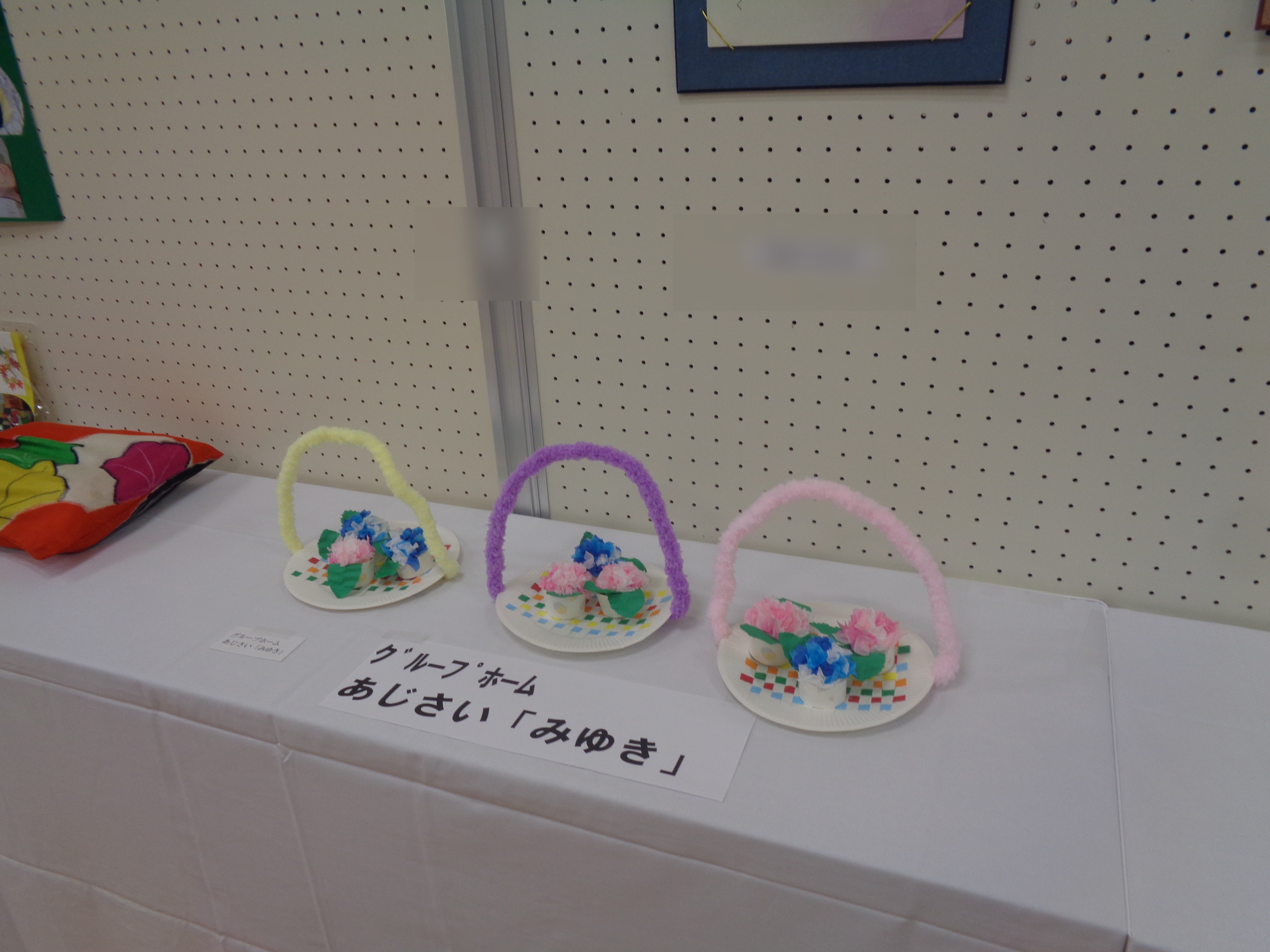 紙粘土にお花紙をさして施設の名前である紫陽花を作り、紙皿で作った可愛いカゴに