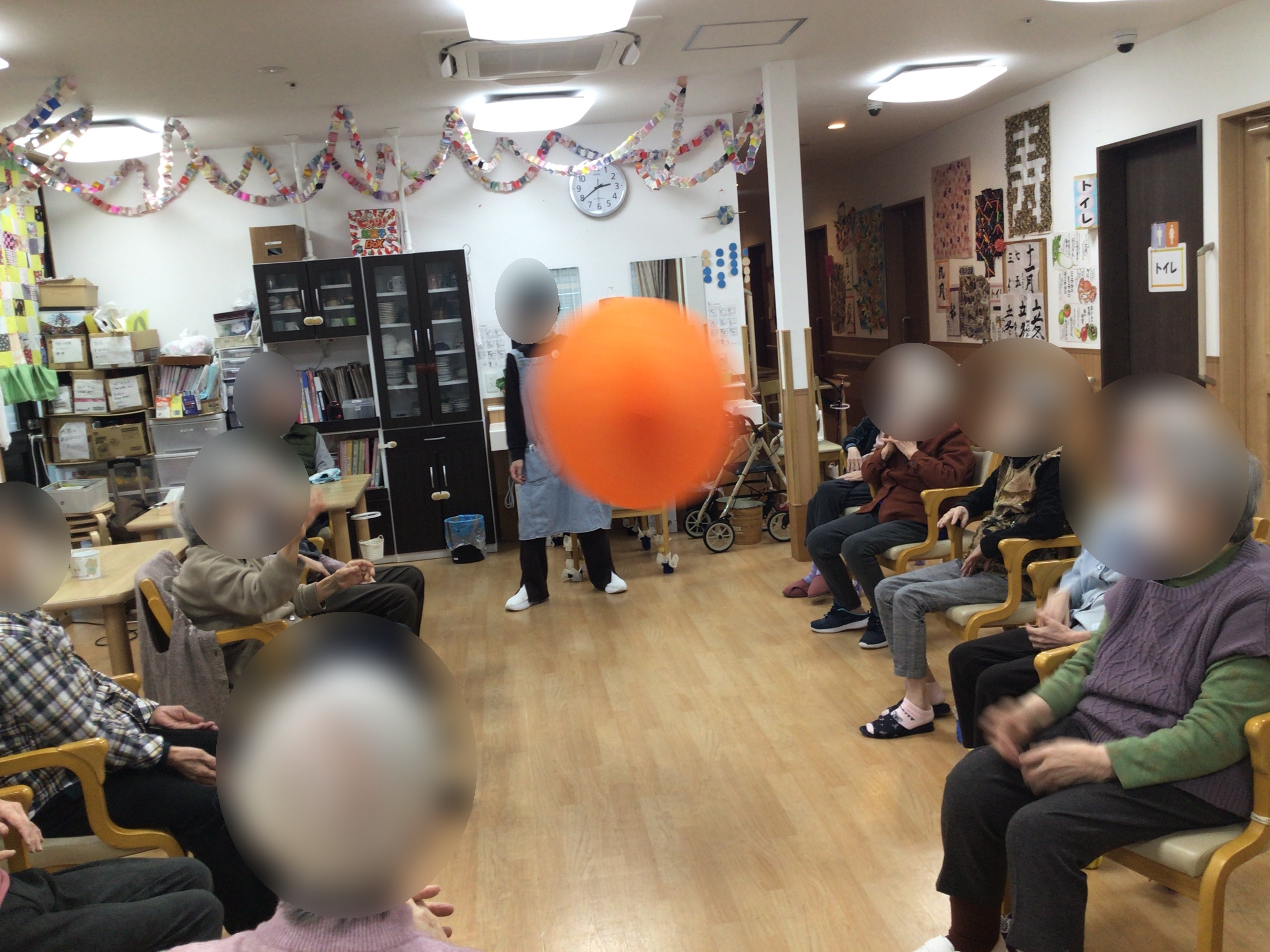 大きな風船を落とさないように、みなさまで協力しながらパスを回していきます